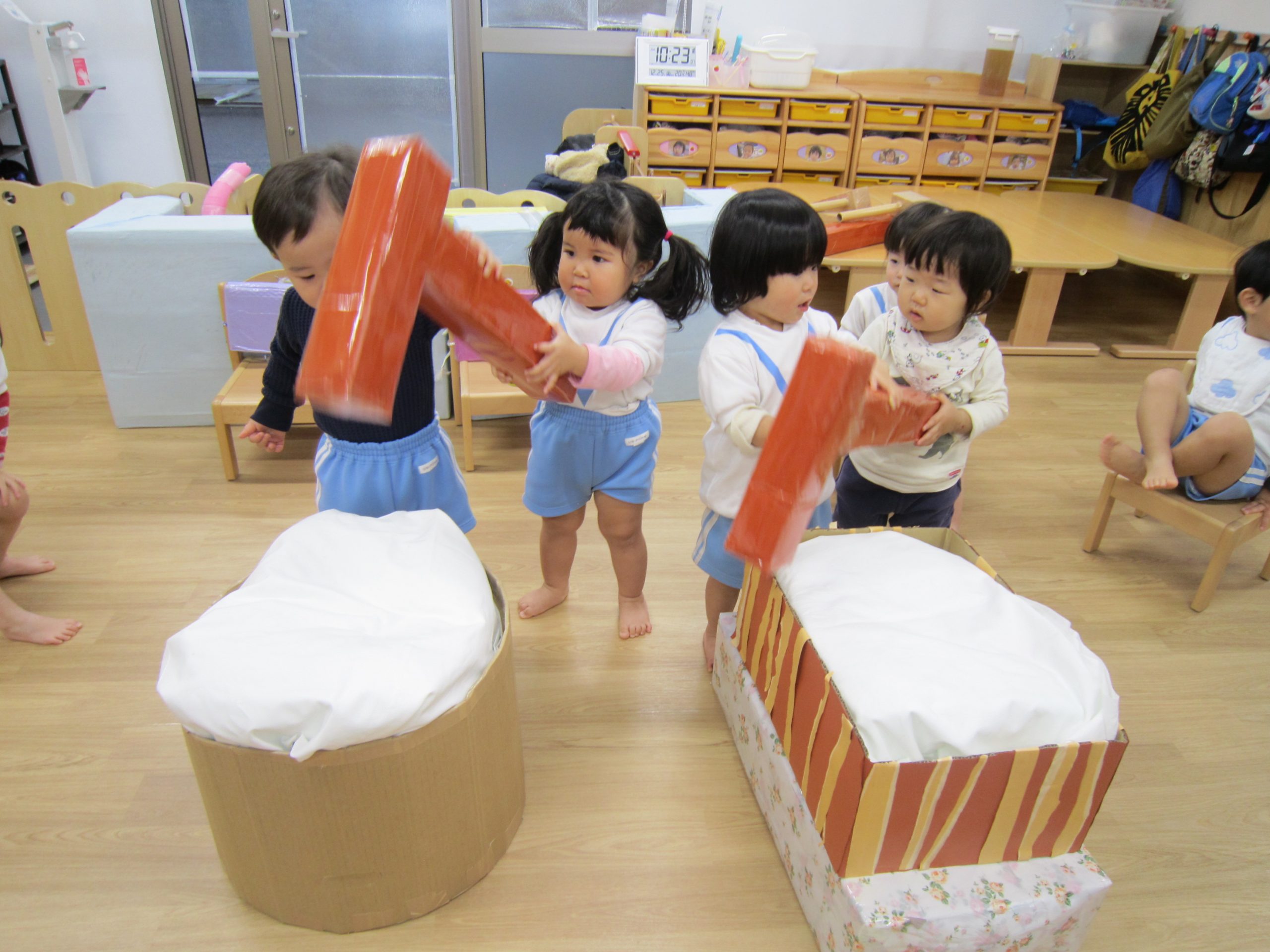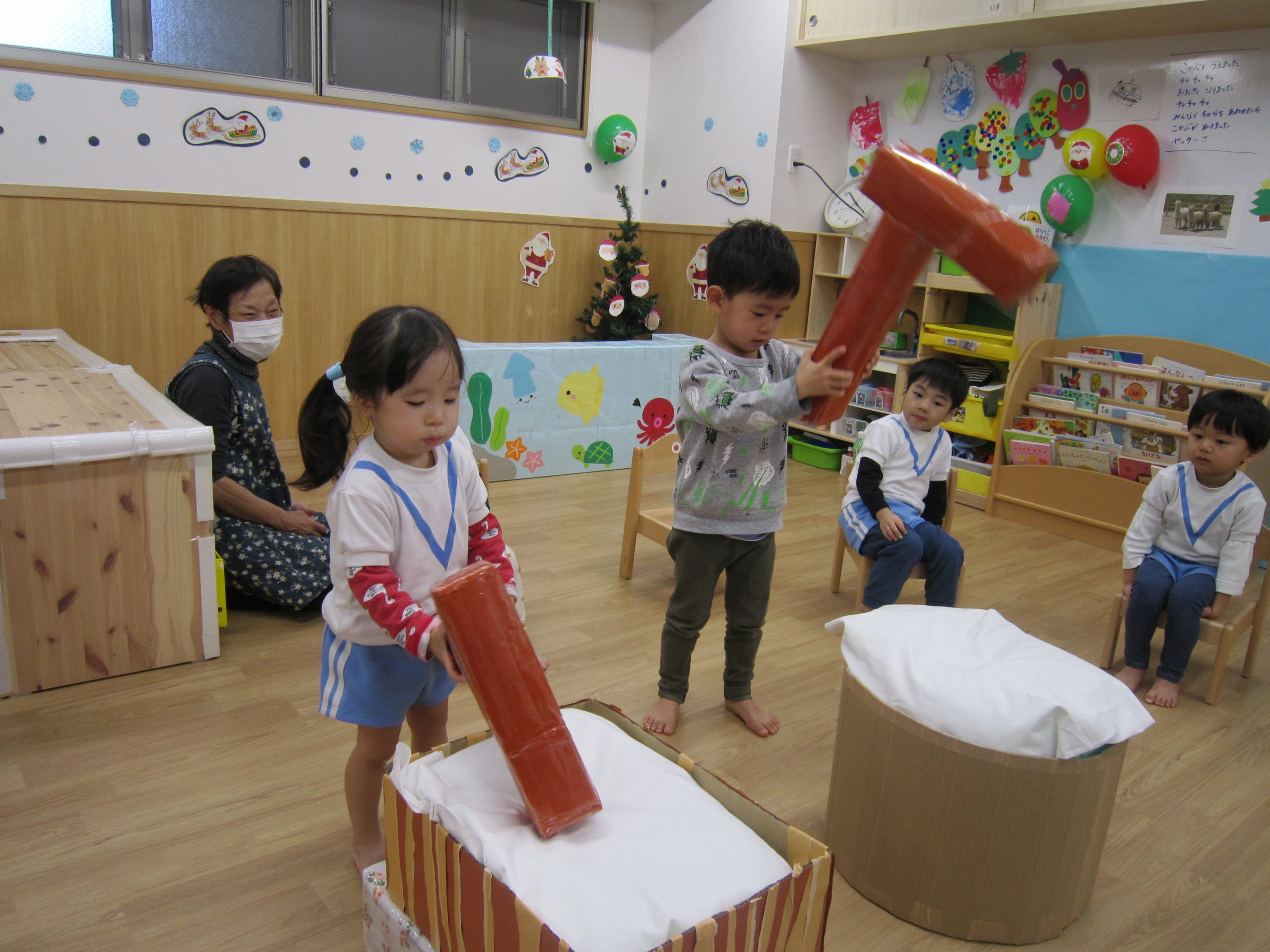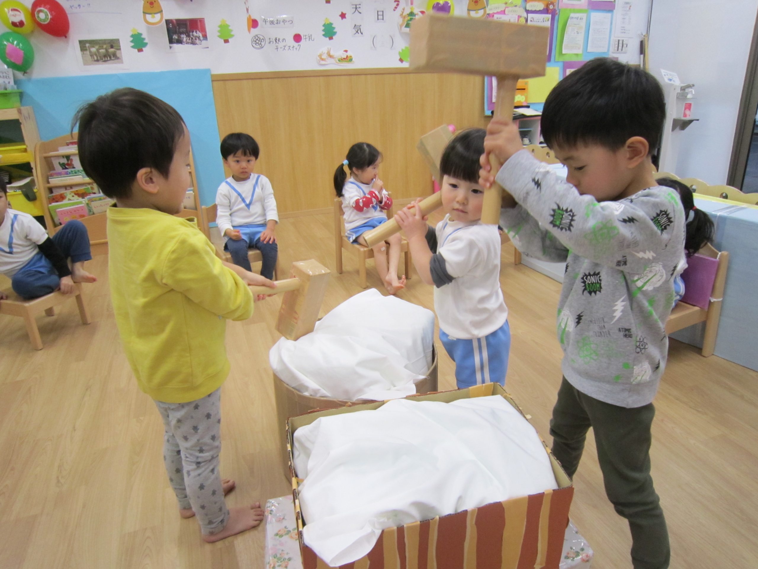 お餅つきごっこ遊び!2020年12月25日(金) 今日はみんなでお餅つきごっこ遊びを楽しみました! まずは、保育者がお餅をつくと・・・ 「早くしたい」と言って心待ちにしている子ども達です。 名前を呼ばれると、とても嬉しそう♬ “もちつき”の歌に合わせて「ぺったん・ぺったん」と言ってお餅をつきます! お餅が出来上がると、丸めて・・・・ 「はいどうぞ」 「いただきます!」 来年は本物のお餅つきができるといいね! 保護者の皆様には今年もたくさんのご理解とご協力をいただきまして、ありがとうございました。 職員一同感謝しております。 来年も宜しくお願い申し上げます。 よいお年をお迎えください。 « 初詣 クリスマス会 »