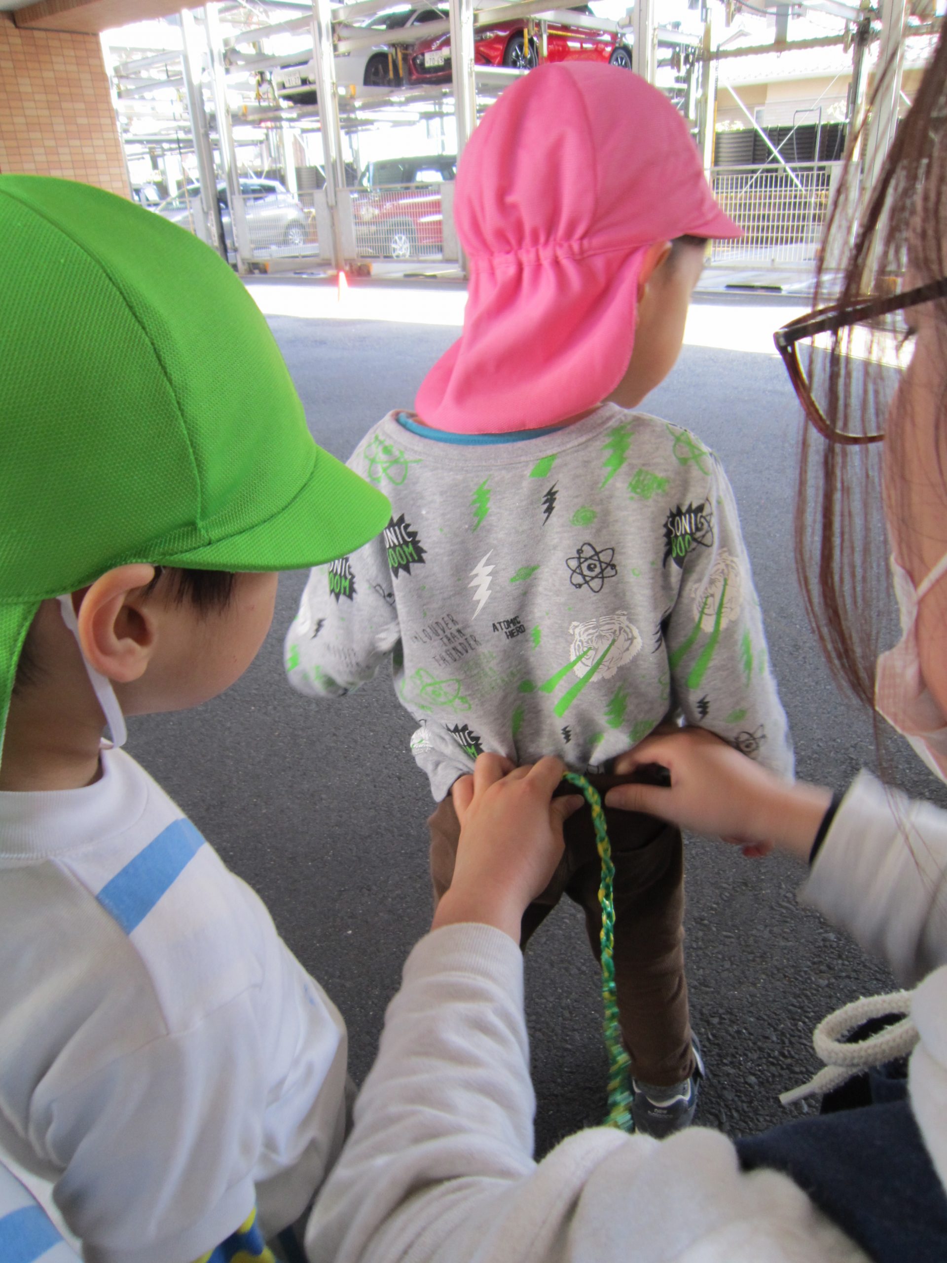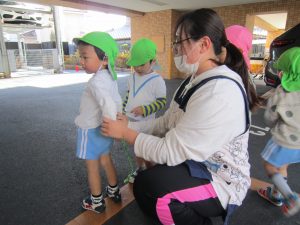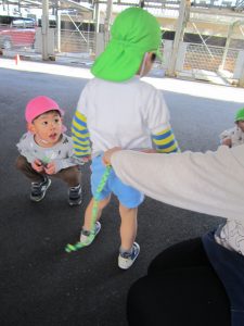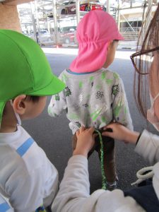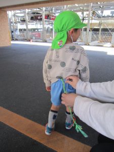 しっぽ取り2021年1月25日(月) 今日のこぐま組は、天気が良かったので制作をした後、駐車場でしっぽ取りをしました! まずは、保育者がしっぽ付けてみんなで取りに行きました♪ 「よーいスタート」 次は子ども達がしっぽをつけます♪ 必死に走るあまり、こけてしまう子どももいましたが、たくさんの笑顔と「もう1回する」と元気な声が響いていました♪ « お風呂ごっこ 豆まきの準備&練習 ひよこ・うさぎバージョン »
