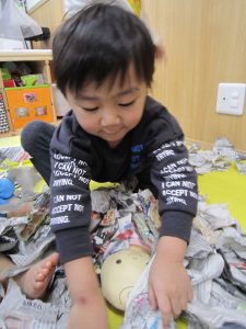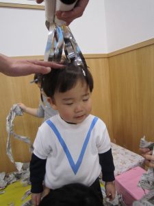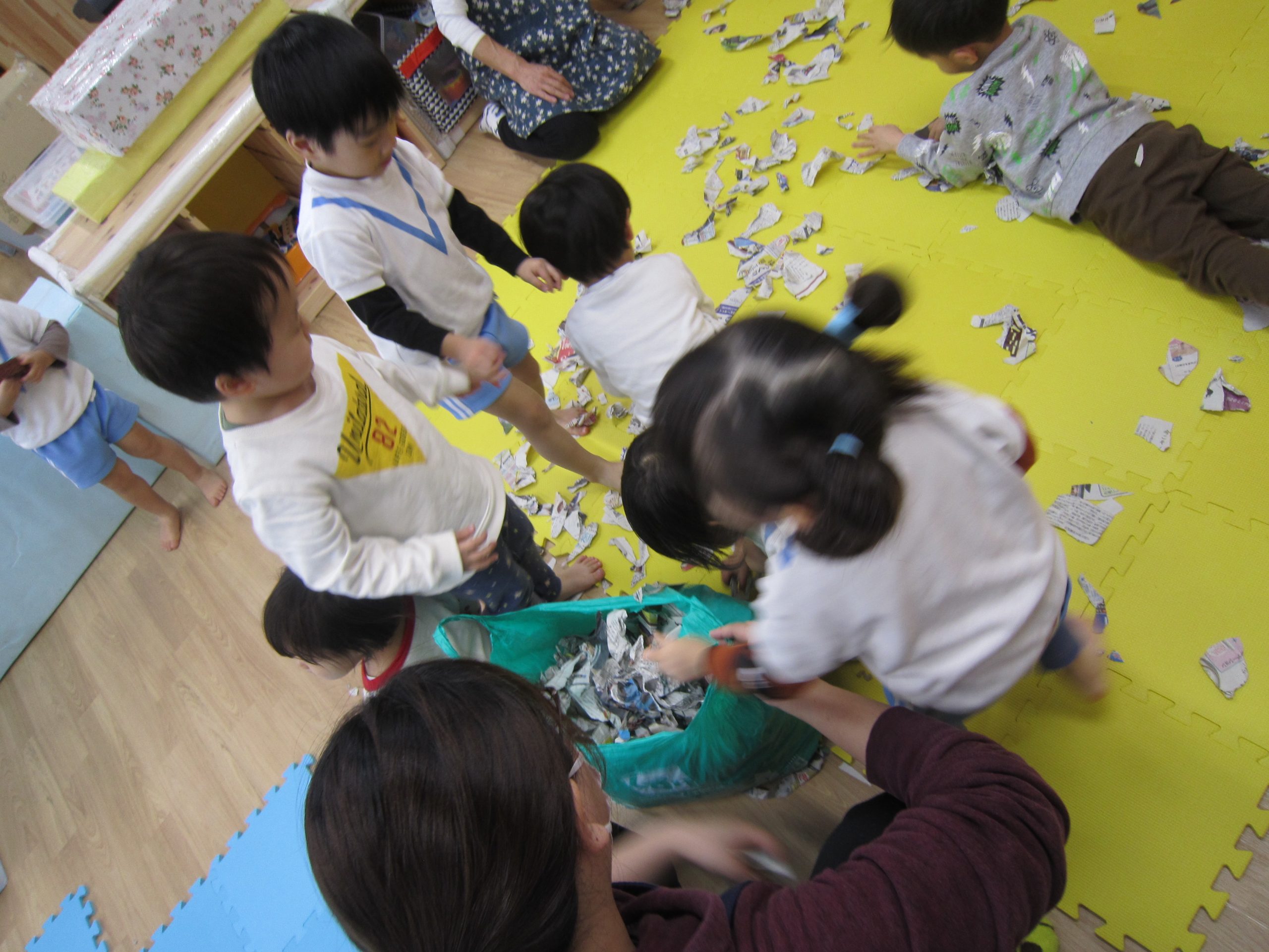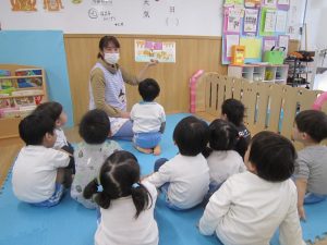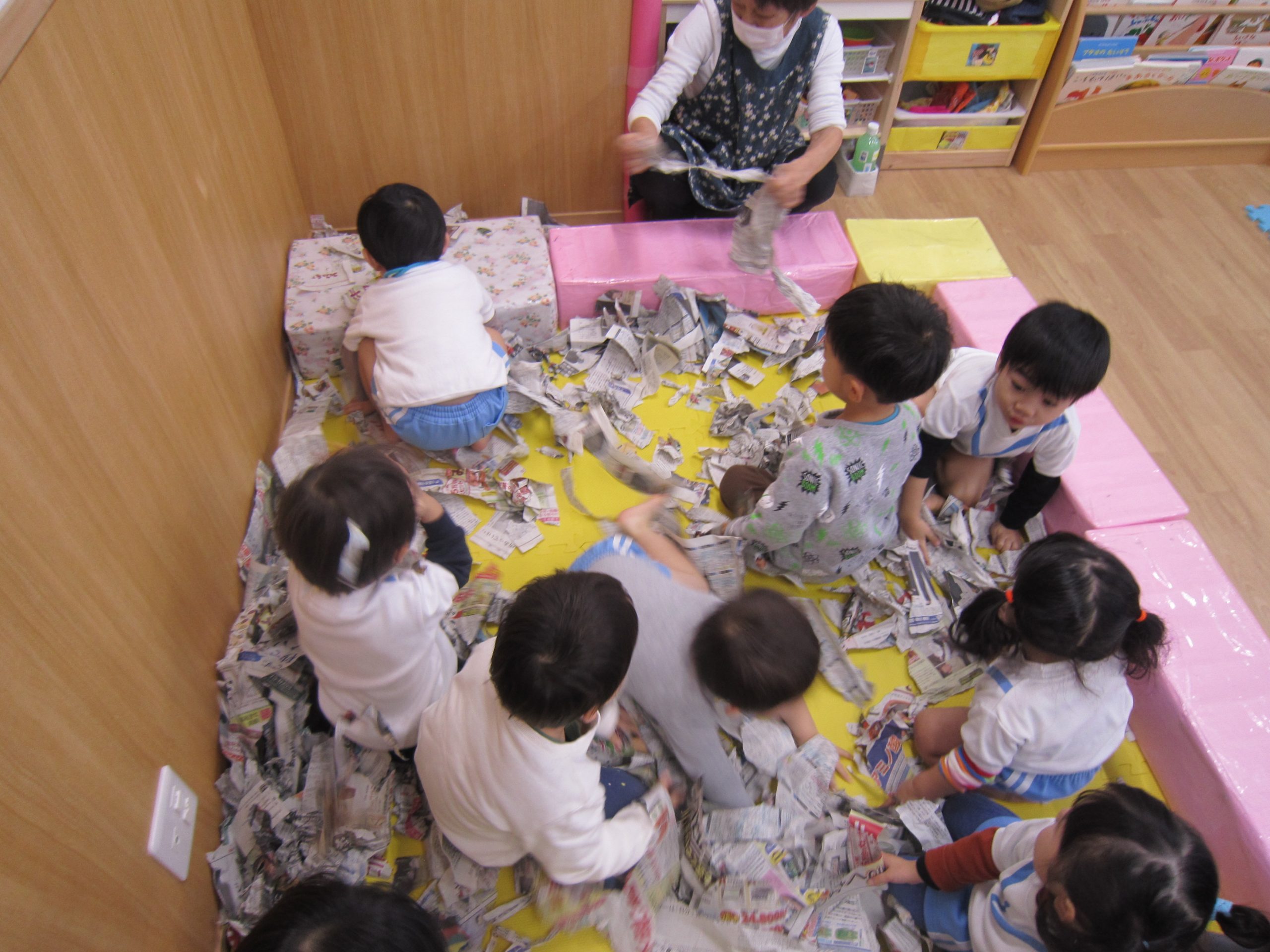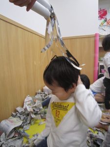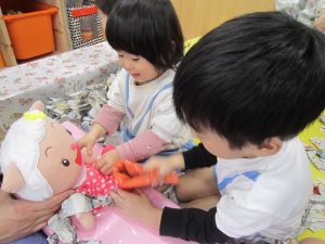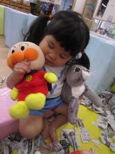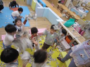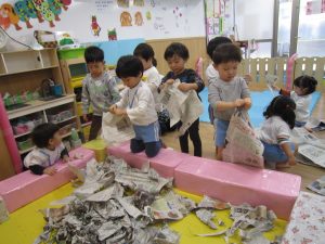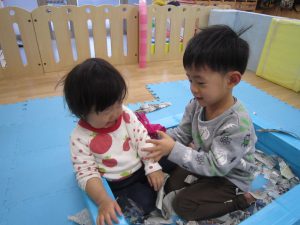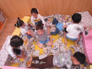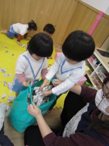 お風呂ごっこ2021年1月27日(水) 今日は遊ぶ前に「もりのおふろやさん」の絵本を見ました! 絵本を見た後で、みんなでお風呂ごっこをして遊びました まずは、新聞紙を破ってお湯を作りお風呂の中に入れました♬ さぁ~お風呂に入るよ!! 頭を洗うよ!! めいちゃんや赤ちゃん・ぬいぐるみさんが遊びに来たよ♪ 「一緒に入ろう」 体をあらうよ「ごし・ごし」キレイになぁれ~ 最後にみんなで新聞紙シャワー 片付けもみんなで一緒に 楽しかったね♪ また遊ぼうね♬ « 誕生会 しっぽ取り »