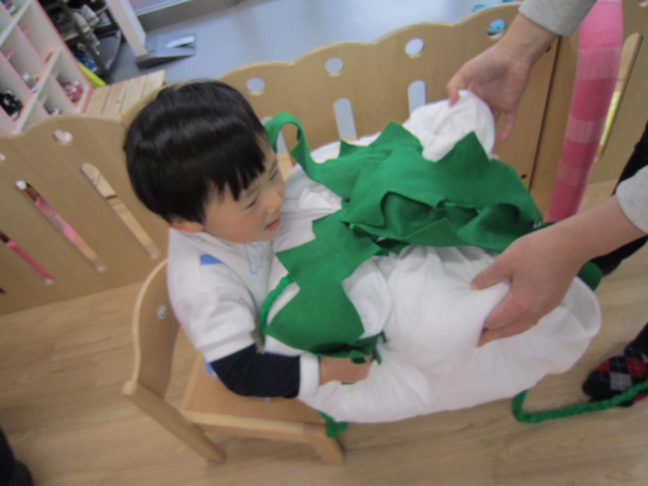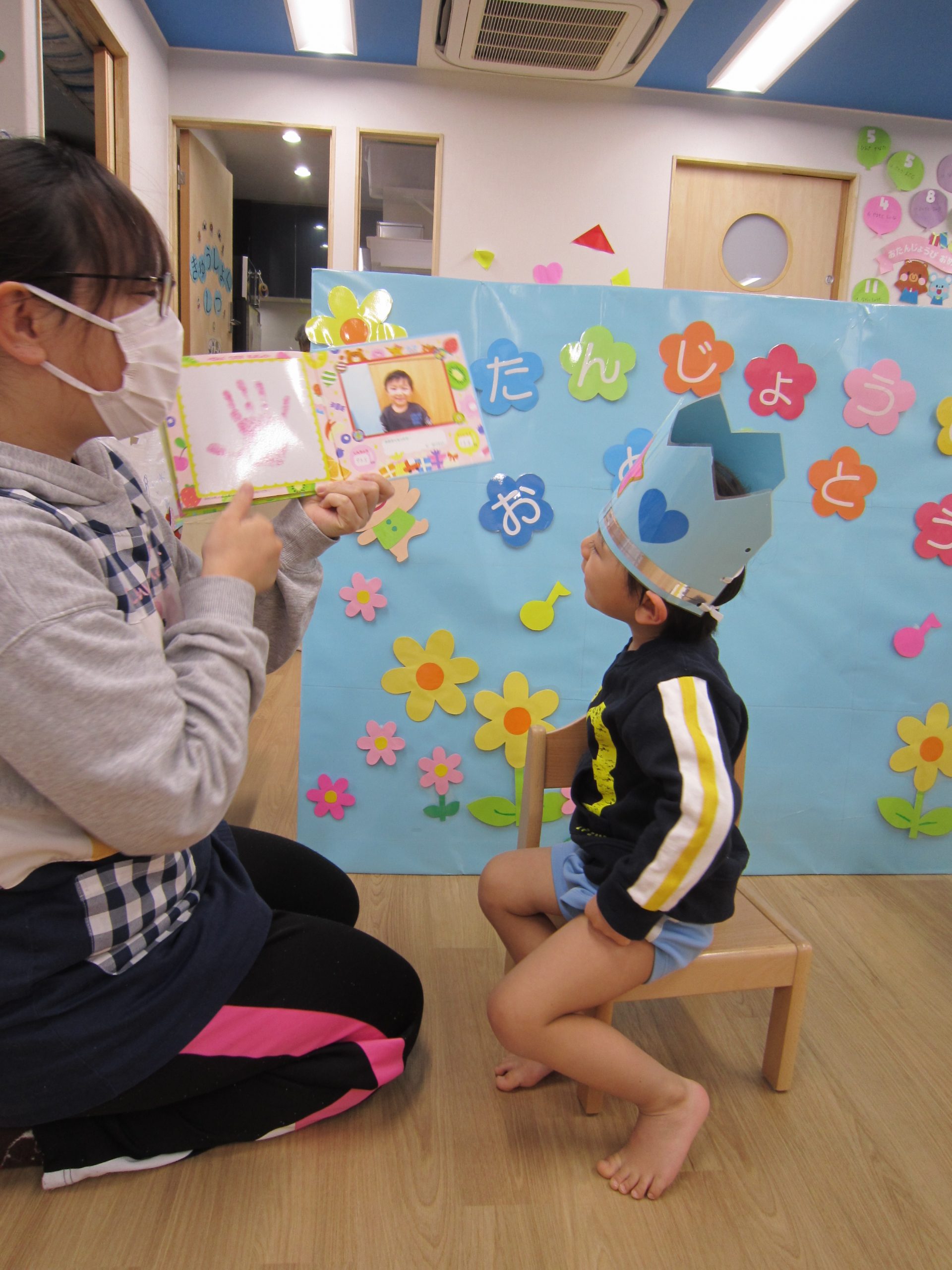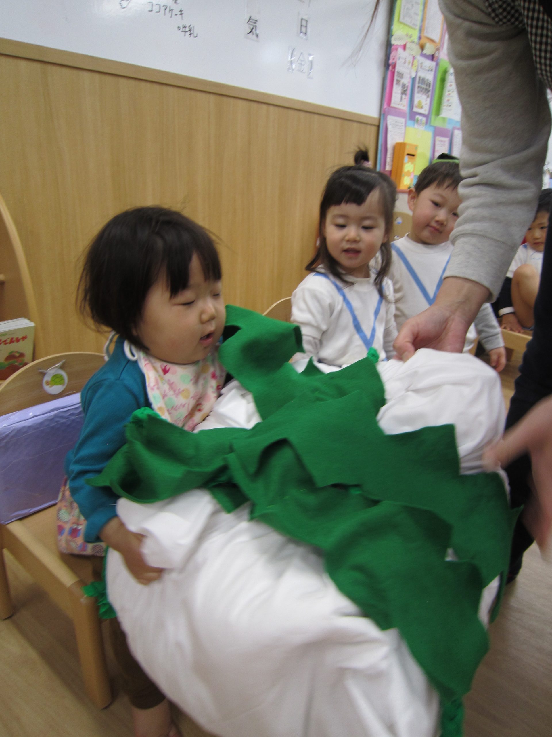 誕生会2021年1月29日(金) 今日は1月の誕生会がありました。 誕生児は2名です。 質問をされると、恥ずかしい気持ちから小さな声になってしまいましたが、しっかりと受け答えをしていました♪ プレゼントに興味津々です! 保育者からの出し物は“おおきなカブ”のパネルシアターでした! カブが抜けると大喜び! そして、保育者がもっと大きなカブを抜くと・・・・ 子ども達はもっともっと大喜び! おおきなカブごっこの始まりです! 好きなお面を選んでかぶり「うんとこしょ・どっこいしょ」 つづきはビデオ参観の時にお見せします♪ お楽しみに♪ « 豆まき お風呂ごっこ »