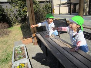みとつ公園2021年2月5日(金) 今日のこぐま組は、天気が良かったのでみとつ公園に行きました。 久しぶりの公園に子ども達は大喜びです! ベンチに座ったり キャベツを見つけて友達に知らせたり 体をたくさん動かしました! 疲れたら少し休憩 大満足の子ども達でした♬ また行こうね!! « 大きなかぶの準備 豆まき »