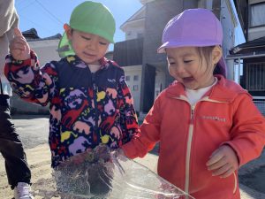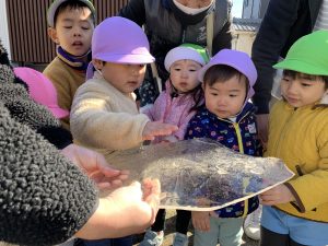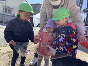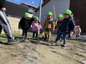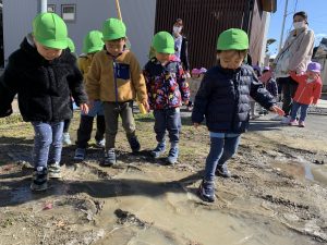 散歩2021年2月18日(木) 今日は英語が始まるまで園周辺を散歩しました。 「寒い」と言っていた子ども達ですが、散歩の途中に氷を見つけて大喜びでした♪ 最後は、こぐまぐみのみんなが水たまりにできた氷を足で割って、氷の割れる音を楽しみました♪ 園に帰ってからは、みんなで駐車場に行って走りました! 寒かったけど、楽しかったね♪ « スライム 油池公園で遊んだよ »