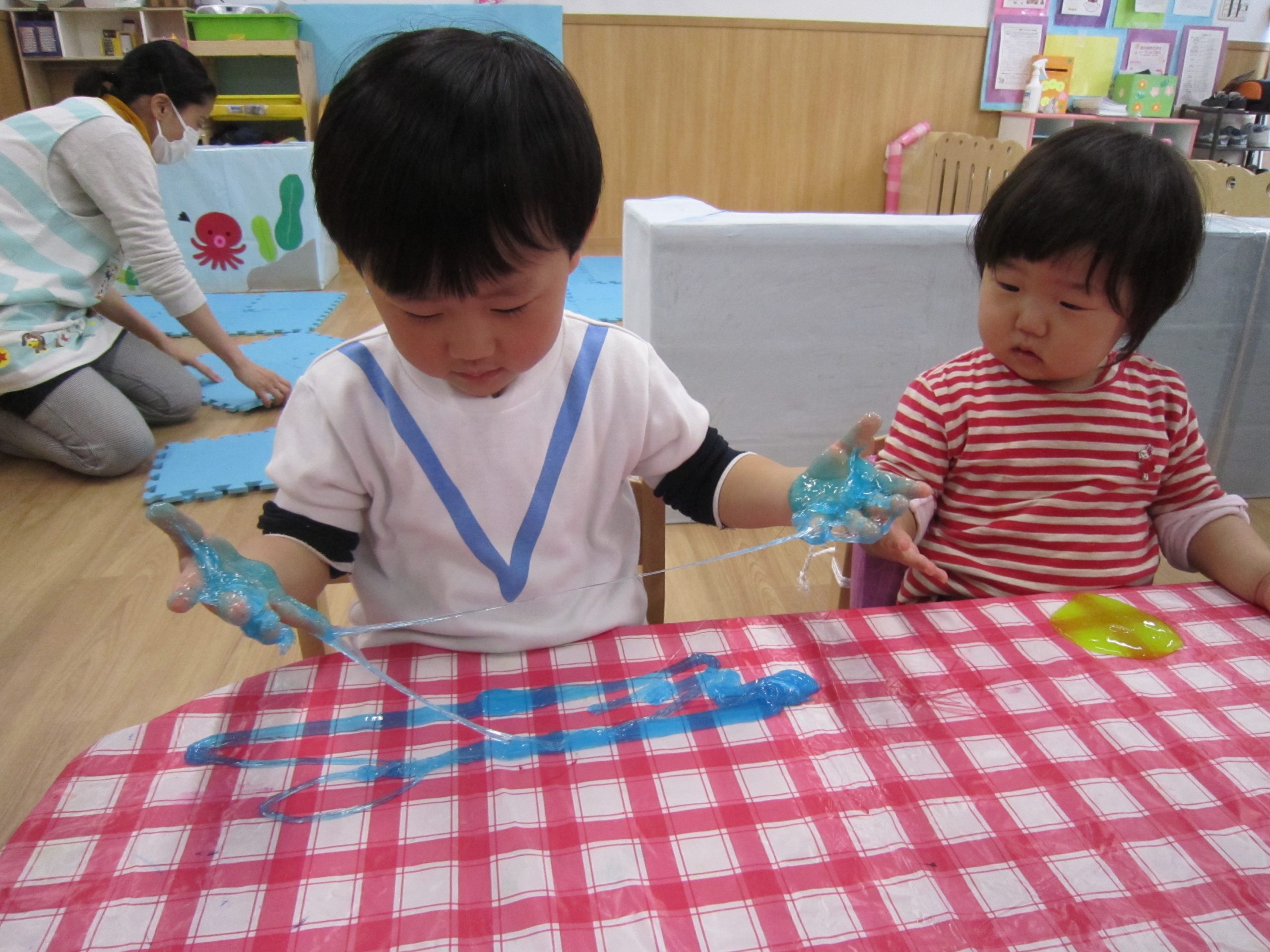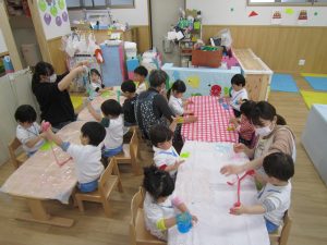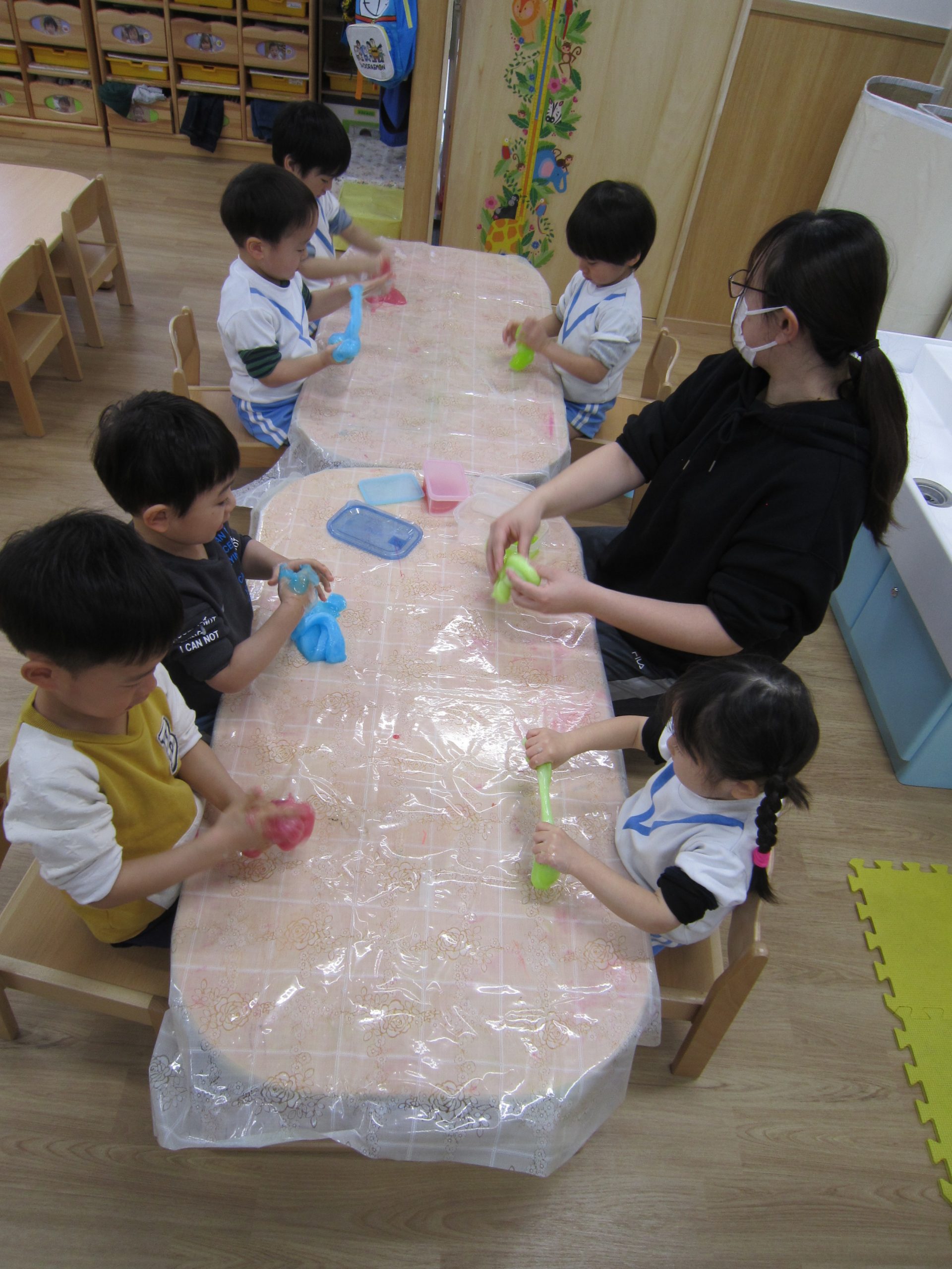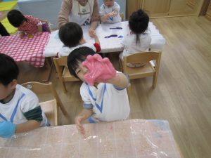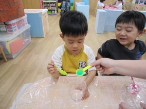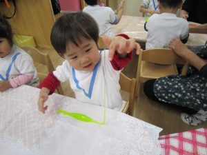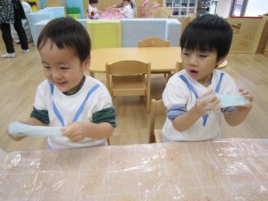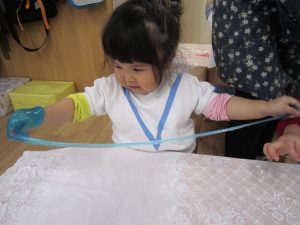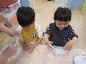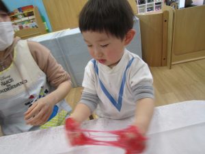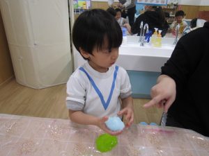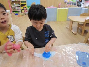 スライム2021年2月24日(水) 今日はスライムで遊びました こぐま組はスライムを自分で作りました♪ 水色の液を入れてもらい 混ぜて!混ぜて! 伸ばして 完成!! 色んな色なスライムを混ぜてみよう♪ ひよこ・うさぎ組もスライム遊びに参加♪ 楽しかったね♪ また、遊ぼうね♪ « 誕生会 散歩 »