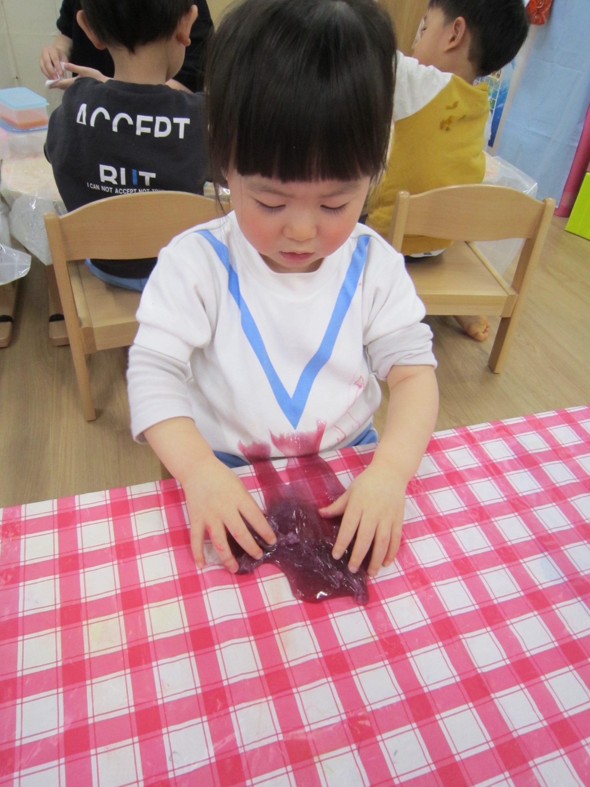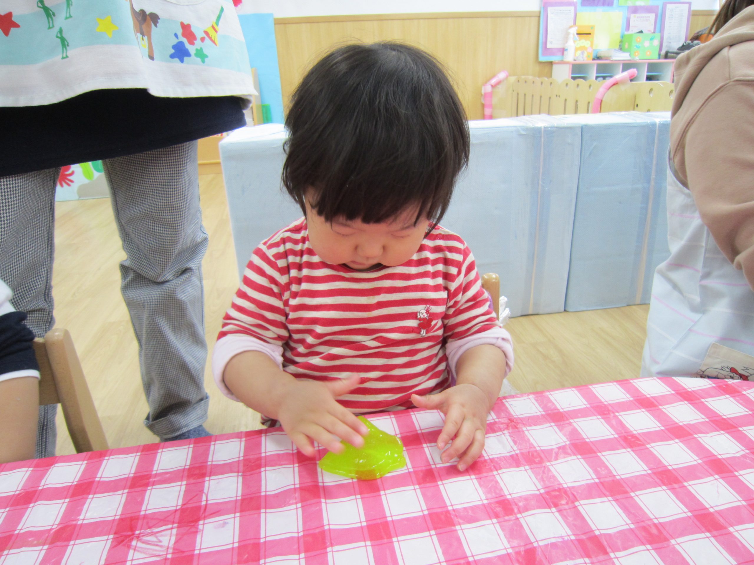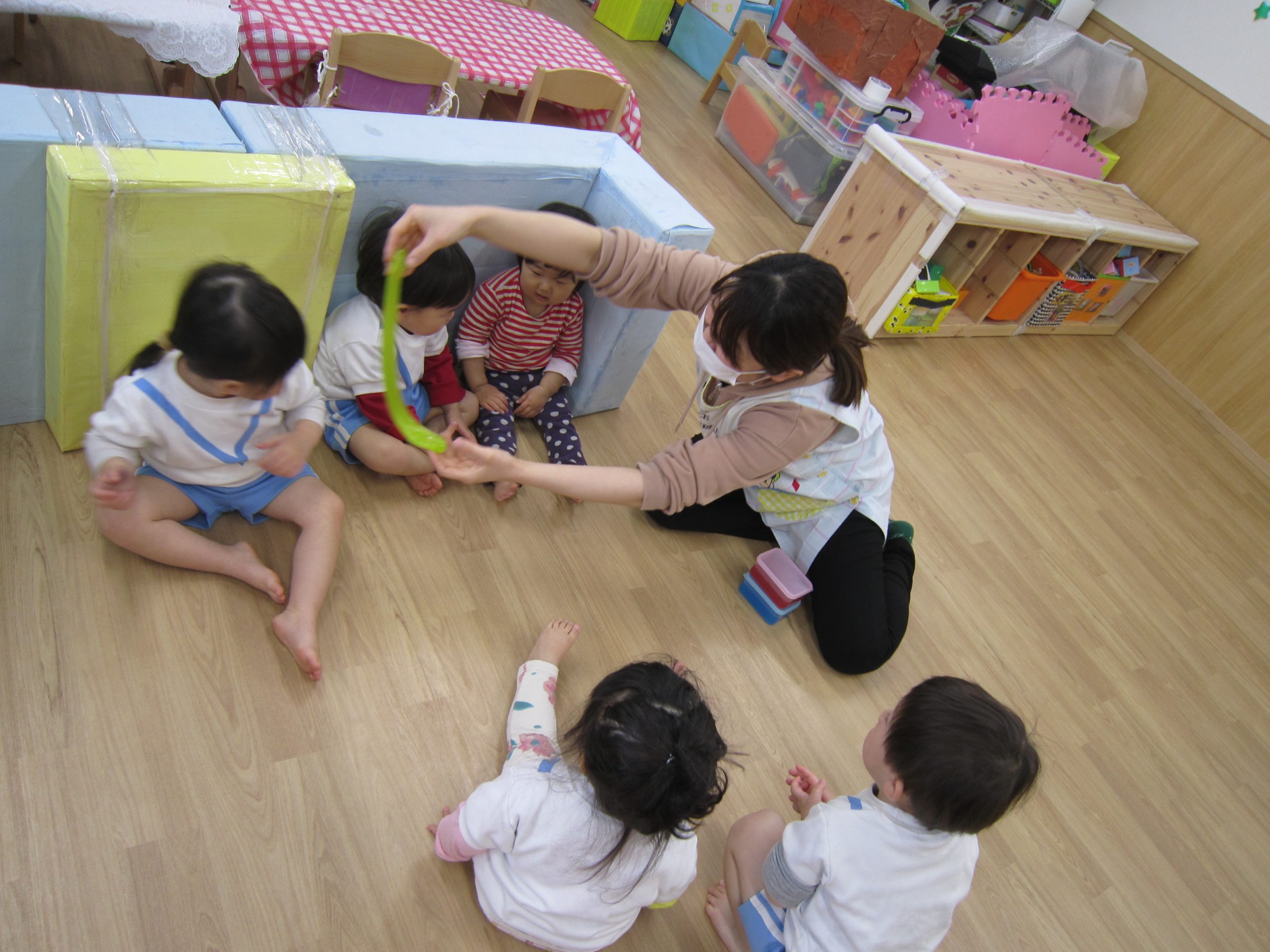 スライム2021年2月24日(水) 今日はスライムで遊びました こぐま組はスライムを自分で作りました♪ 水色の液を入れてもらい 混ぜて!混ぜて! 伸ばして 完成!! 色んな色なスライムを混ぜてみよう♪ ひよこ・うさぎ組もスライム遊びに参加♪ 楽しかったね♪ また、遊ぼうね♪ « 誕生会 散歩 »