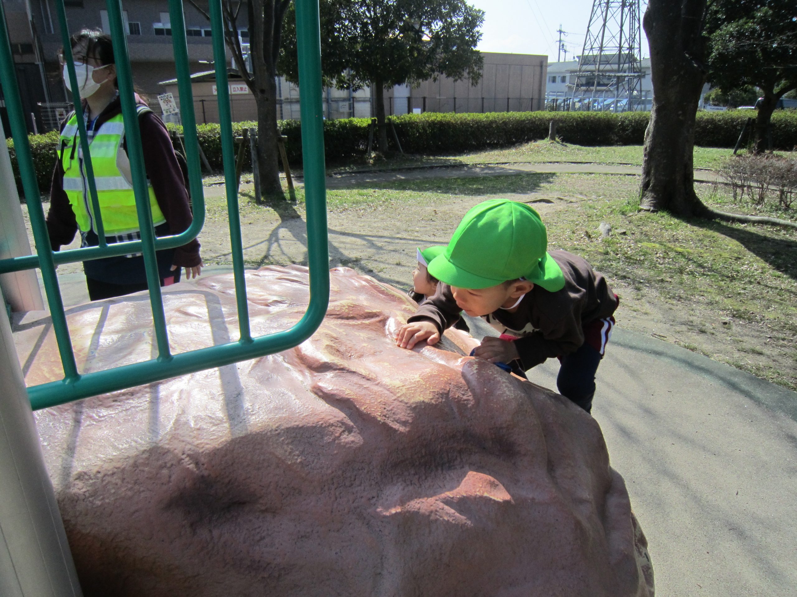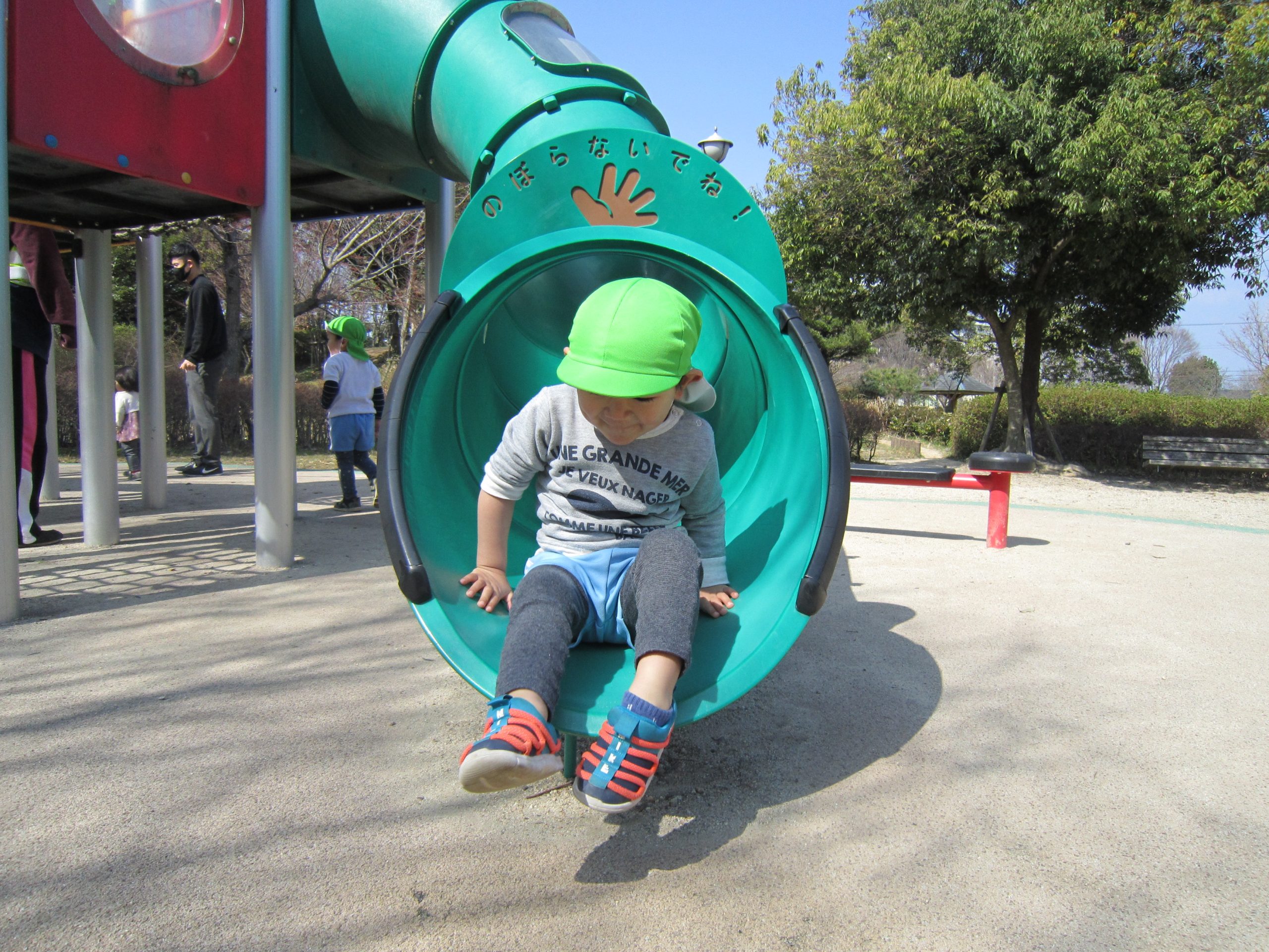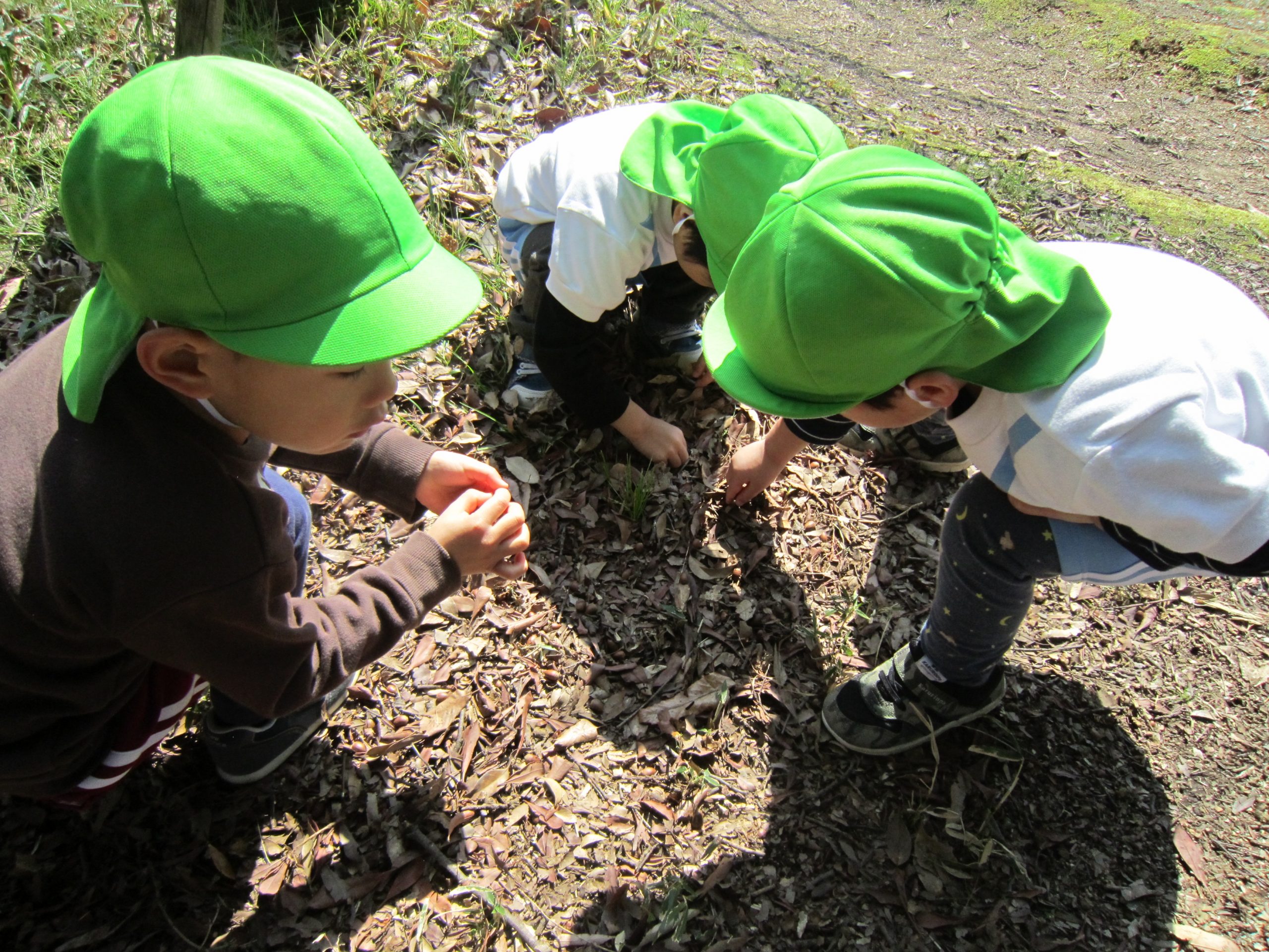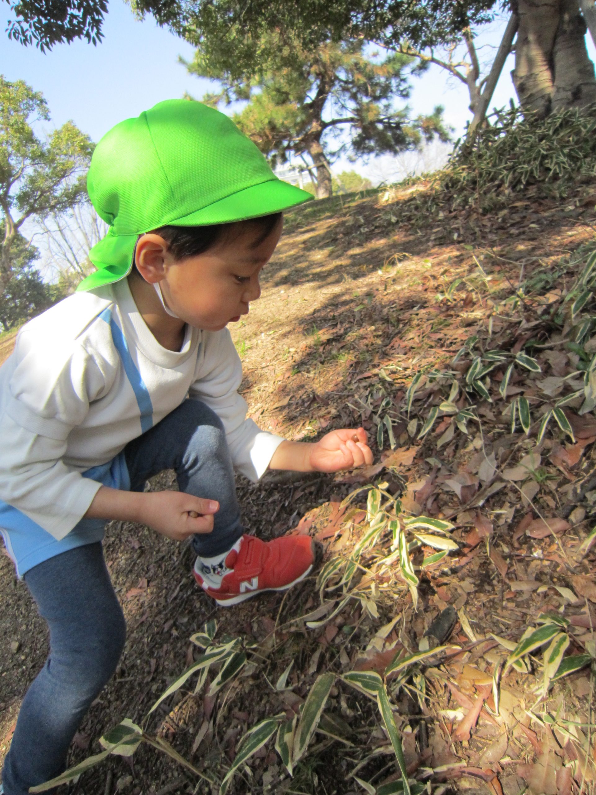 ふれあい公園2021年3月15日(月) 今日は天気が良かったので、こぐま組は朝のおやつを持ってふれあい公園へ行きました! 公園に着くと早速おやつを食べました♪ おやつを食べた後は探検に出かけました♪ コイを見つけ「大きいね」と喜んでいました。 コイを見た後は、遊具を発見!! 「遊ぶ!!」と言って大喜びの子ども達でした。 さらに探検を続けると・・・どんぐりを見つけ、必死に拾っていました♪ そして、丘で「よーいドン」 みんなで写真を撮るよ! 「ハイポーズ♪」 春を見つけもう1枚♪ 楽しかったね♪ また、行こうね♪ « 誕生会 お別れバス遠足 »