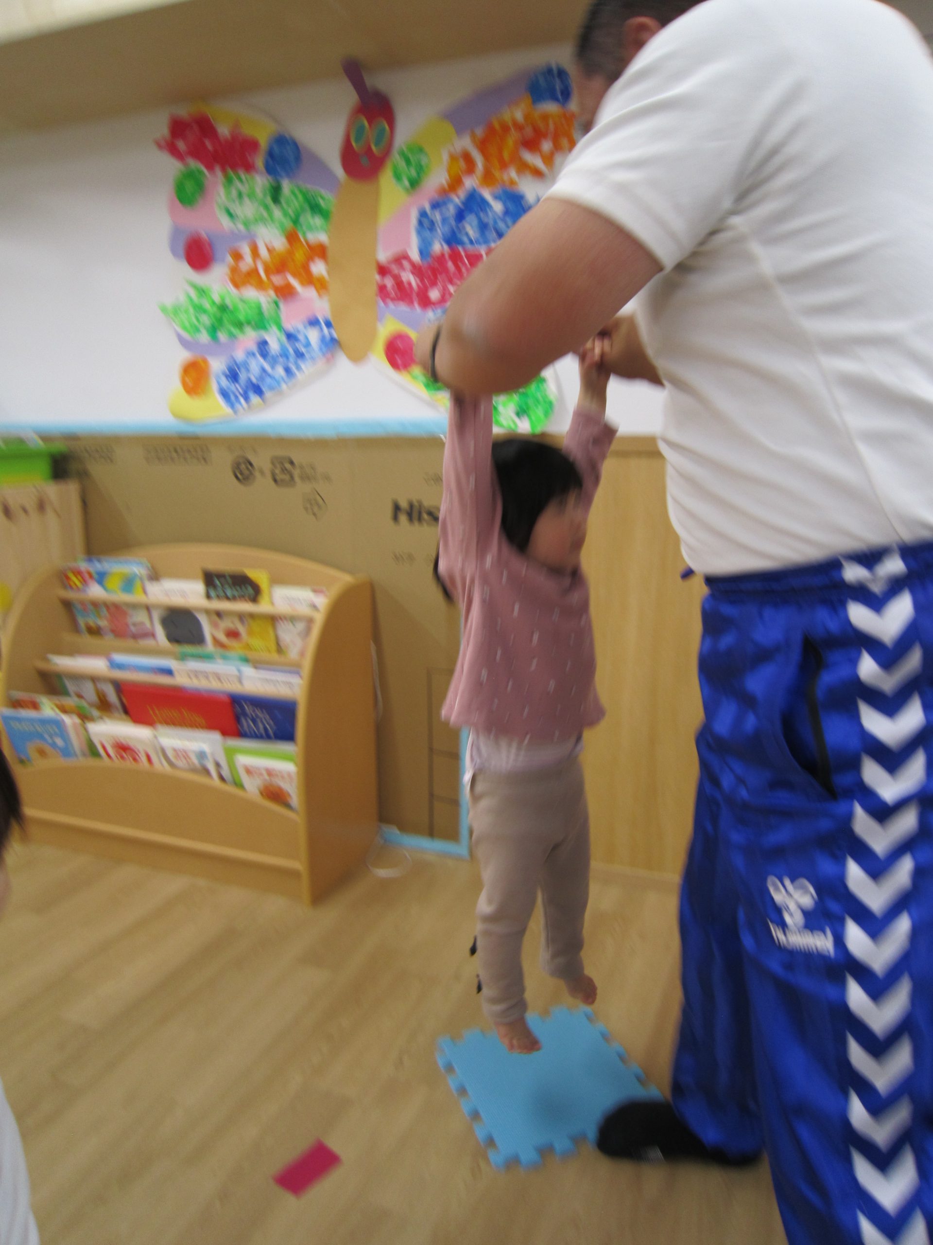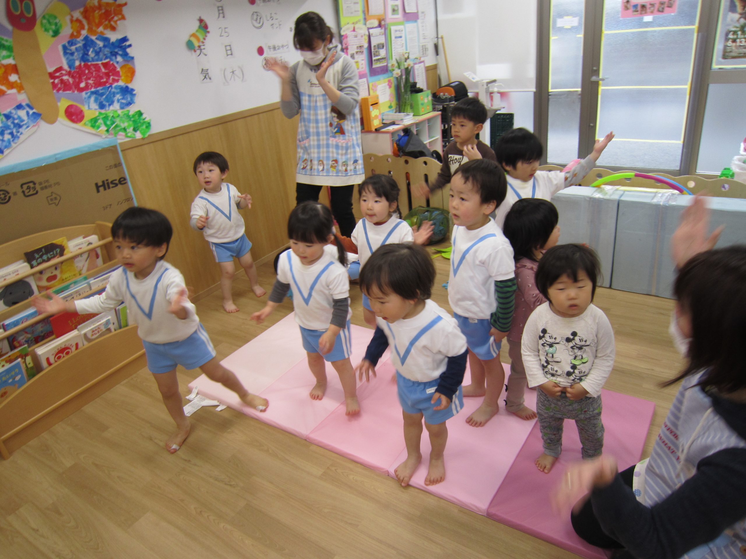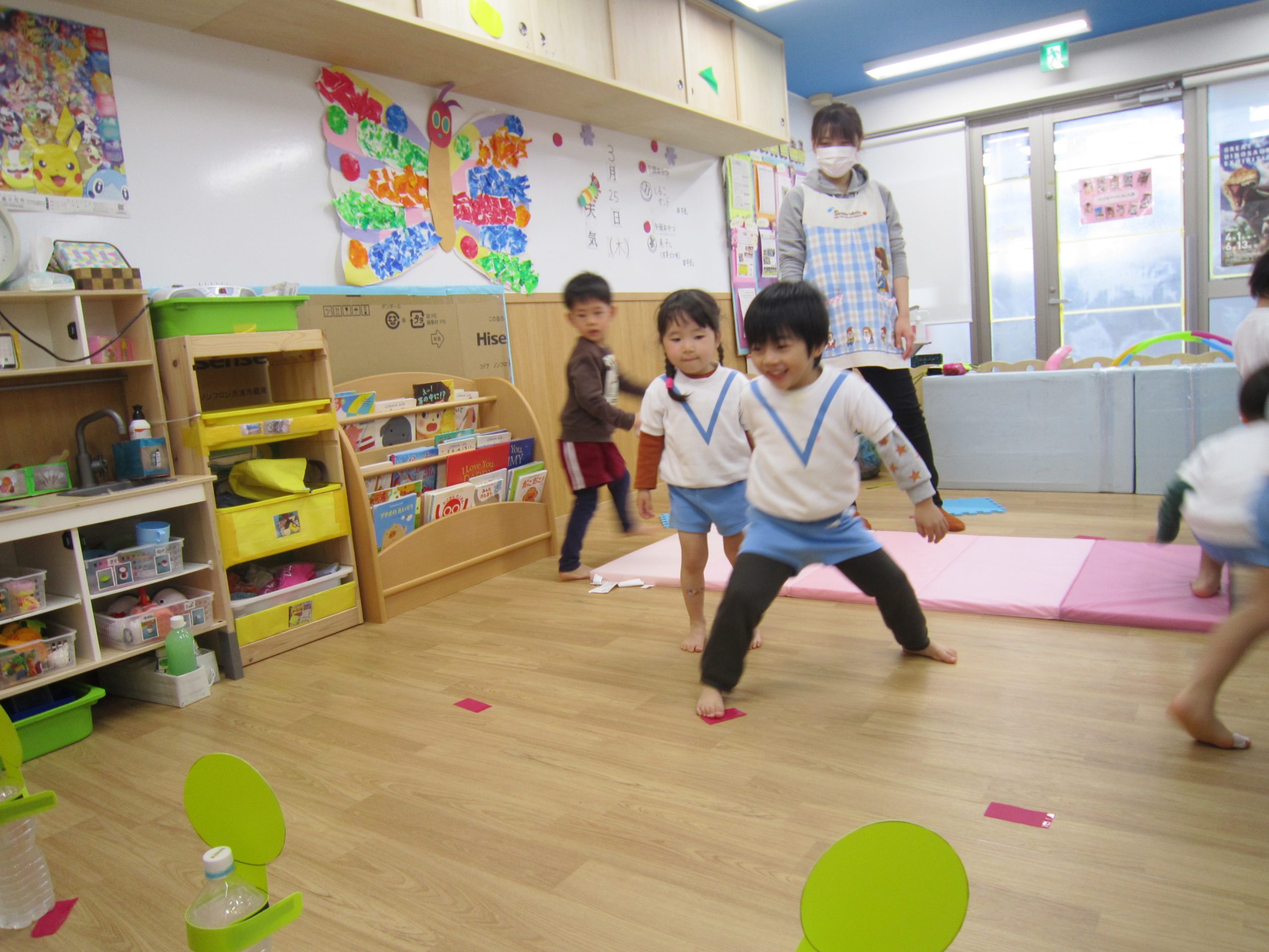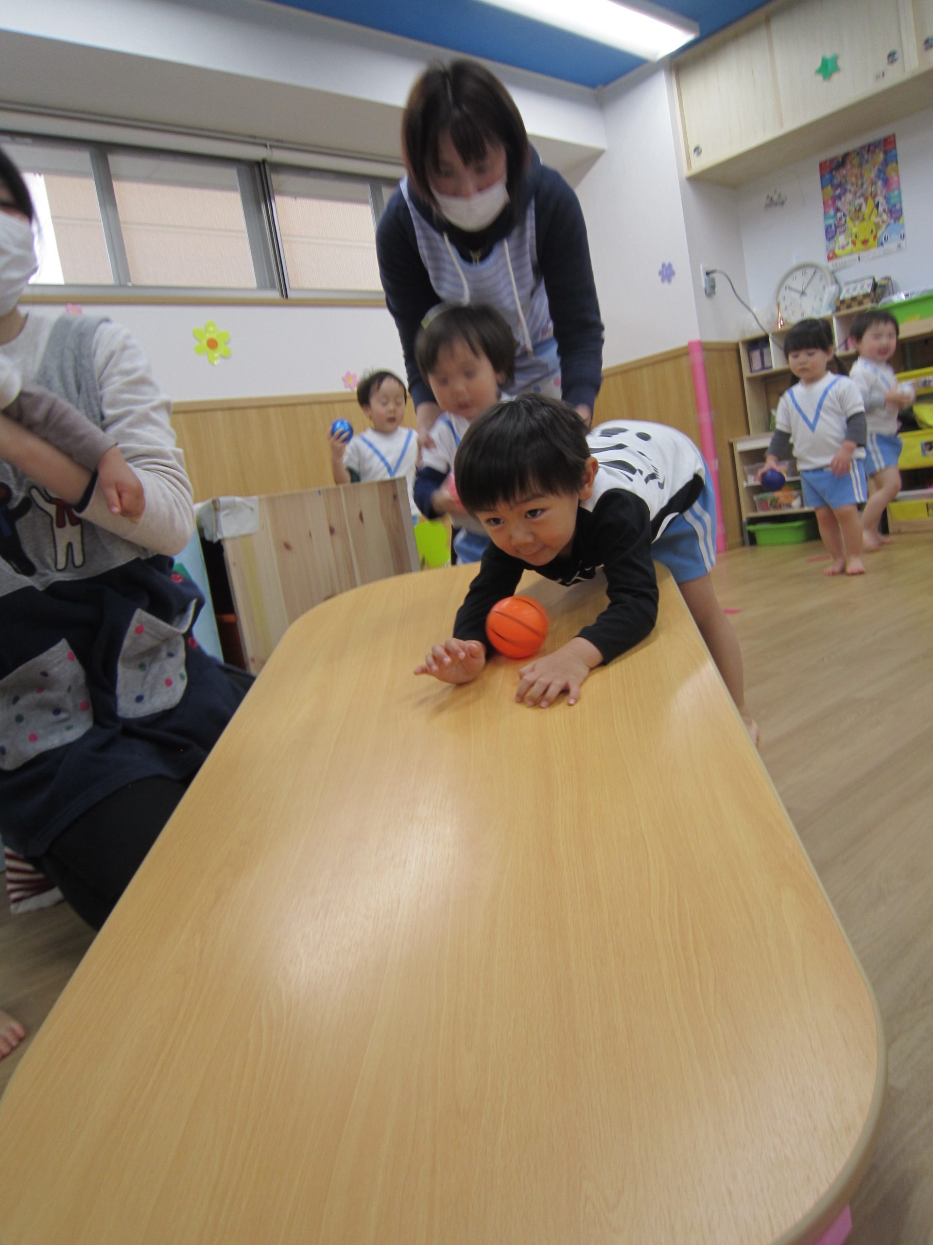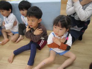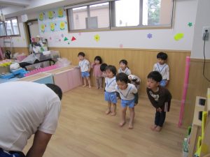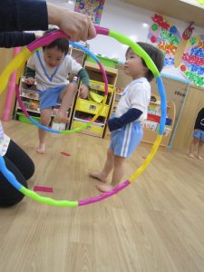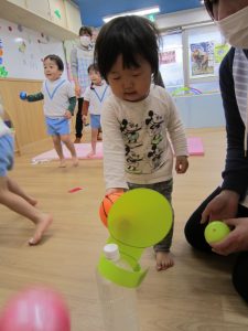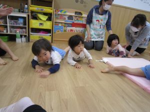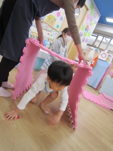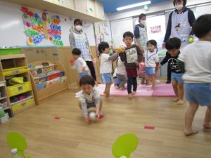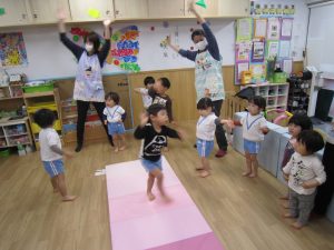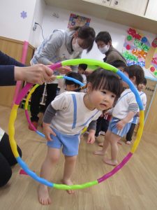 体操教室2021年3月25日(木) 今日は体操教室(お試し)がありました。 まずは手遊びからスタート 次に音楽に合わせて動物に変身 さぁ体を動かすよ~ フープをくぐるよ トンネルをくぐるよ 強い手でつかまって 次は的当て ボールコロコロ 最後にみんなでラーメン体操 終わりの挨拶 たくさん体を動かして、楽しかったね! « お別れ会 油池公園 »