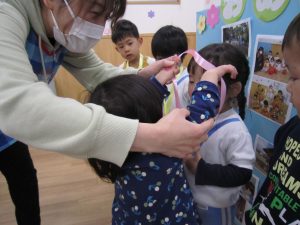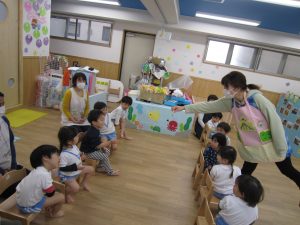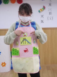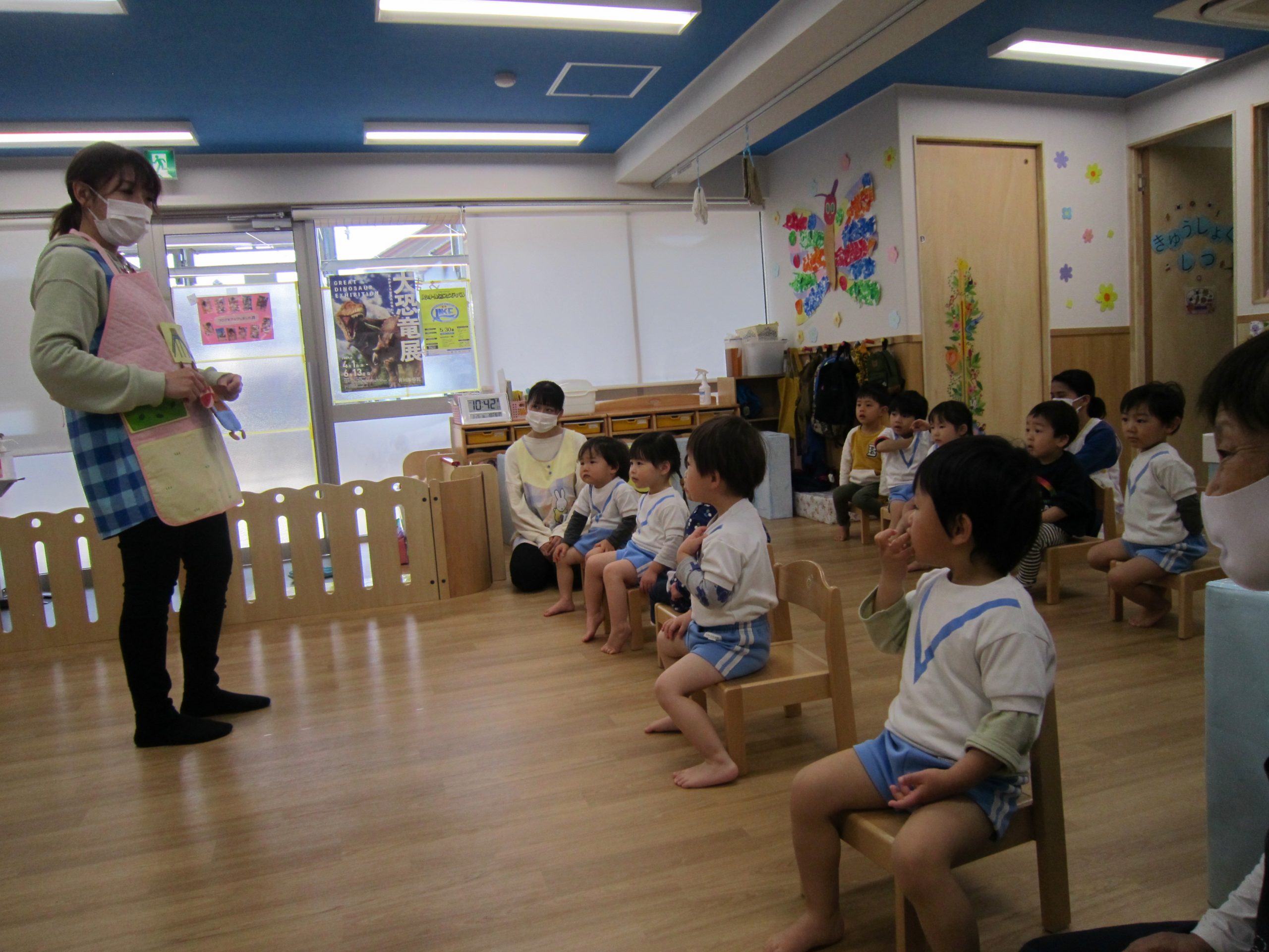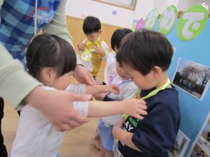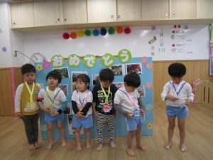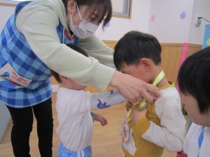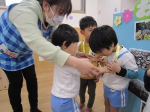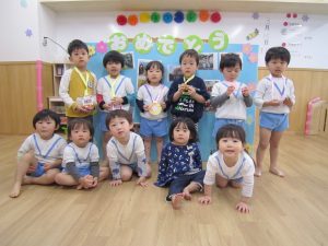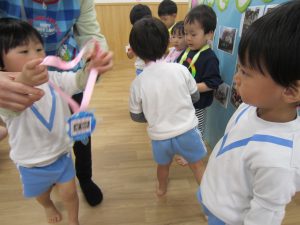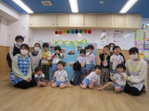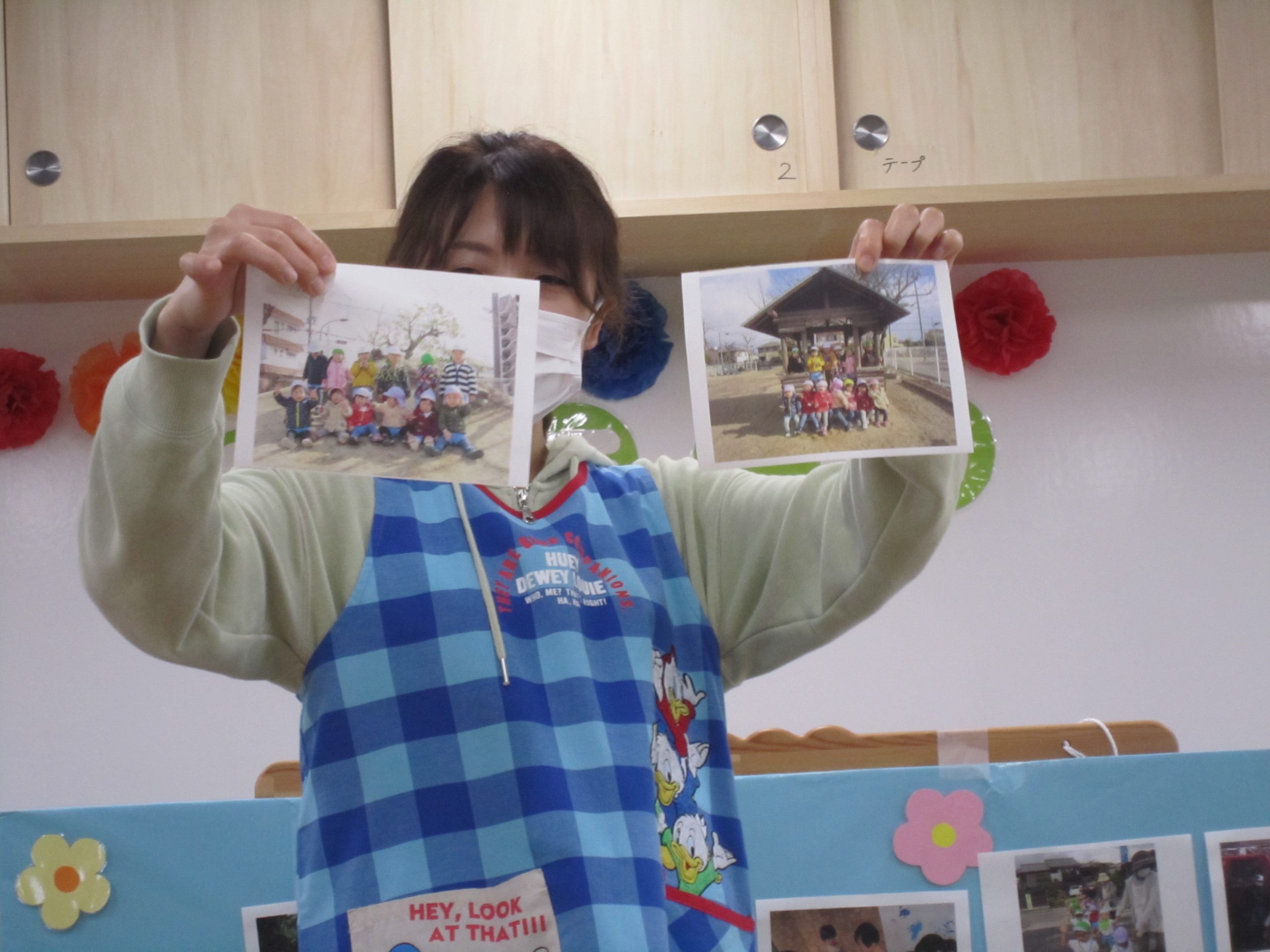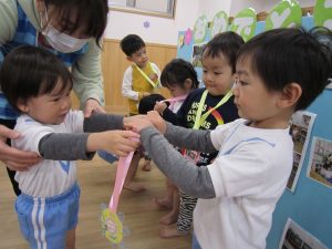 お別れ会2021年3月26日(金) 今日はお別れ会がありました。 まずは、この1年間でどんな事をしたか振り返りました♪ その後、職員からの出し物“なかよしってステキだね”のエプロンシアターを観ました! その後は・・・ うさぎ組さんからのペンダントのプレゼント♪ ペンダントをもらって嬉しそう♬ みんなで記念写真「ハイポーズ♪」 職員も一緒に「ハイポーズ♪」 いよいよ明日は卒園式です! 楽しみだね♪ « 第二回卒園式 体操教室 »