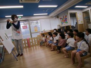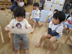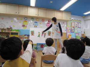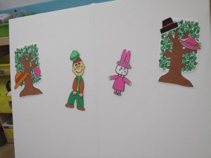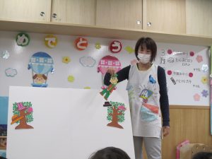 まずは、保育者からの出し物“すてきな帽子屋さん”のパネルシアターを観ました!