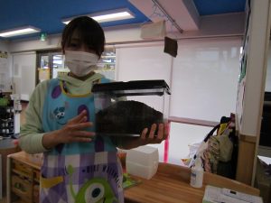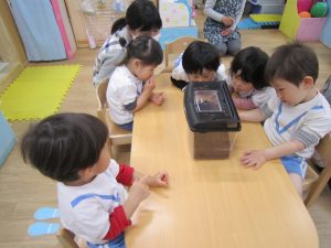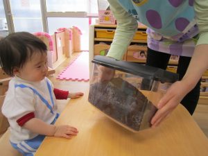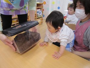 新しい友達が来たよ❕2021年4月27日(火) 昨日保護者の方からカブトムシの幼虫を頂きました🎶 今日は、カブトムシの幼虫に始めましてのご挨拶と、幼虫は眠っているから静かに見る事のお約束の話を聞きました。 そして、近くで見ました🎵 大切に育てていこうね🎵 « 油池公園 4月の誕生会part2 »