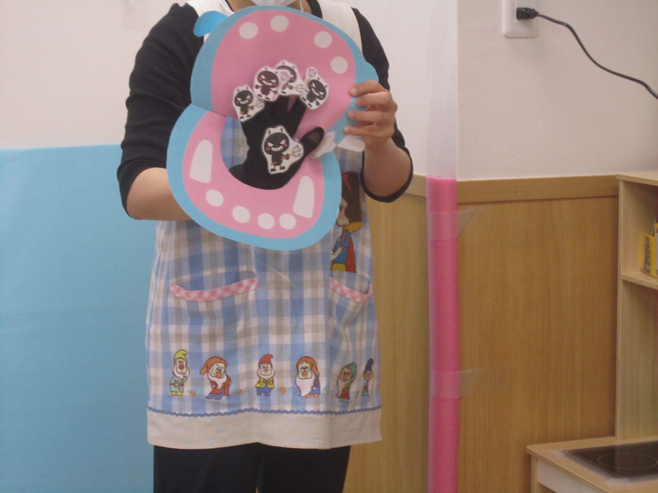 虫歯予防デー2021年6月4日(金) 今日は、6月4日虫歯予防デーの日です。 “かばくんとむしばキン”のカードシアターをみました。 かばくんは食べることが大好きです❕ 食べ終わると眠たくなってしまい・・・そのまま寝てしましました❕ すると、口の中に・・・・むしばキンが・・・・ どうしたらいいかな・・・? そうだ「ハブラシ王子を呼ぼう」 「せーの❕」 ハブラシ王子登場❕ 友達のところに、ばいキンが飛んできた・・・ 大変だ❕ ハブラシ王子を使って磨くよ❕ ひよこ組・うさぎ組もハブラシ王子を使って歯磨き~ ピッカピカになったね🎵 来週からうさぎ組も給食の後は、歯を磨こうね🎶 « 親子ふれあい遊びの練習🎶 あおむしのごはん🎵 »