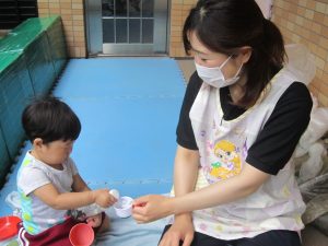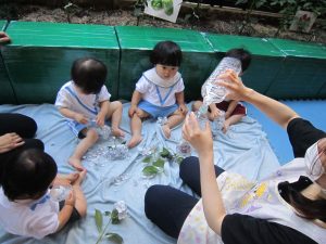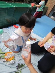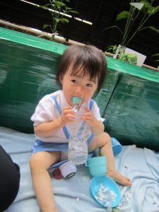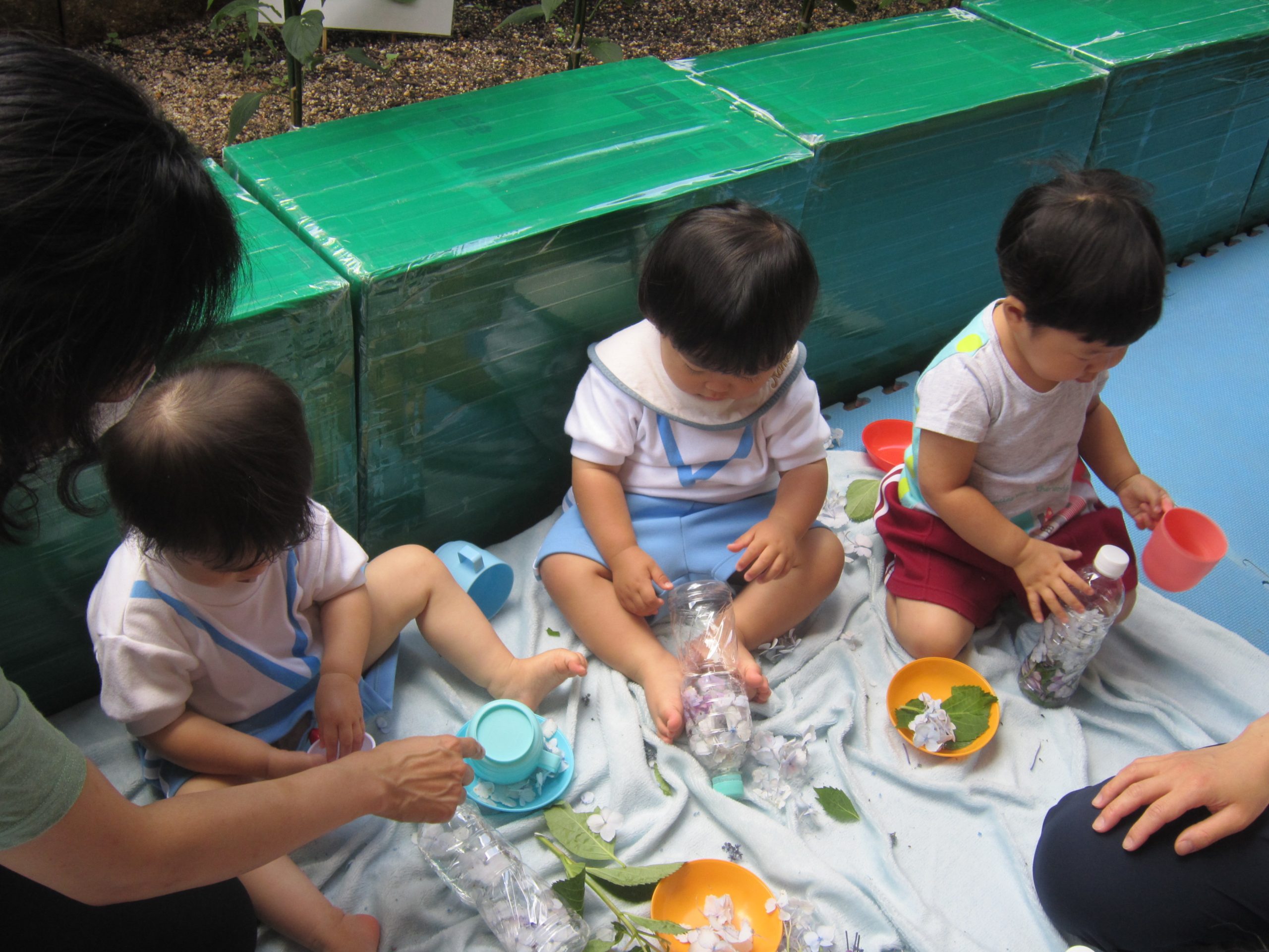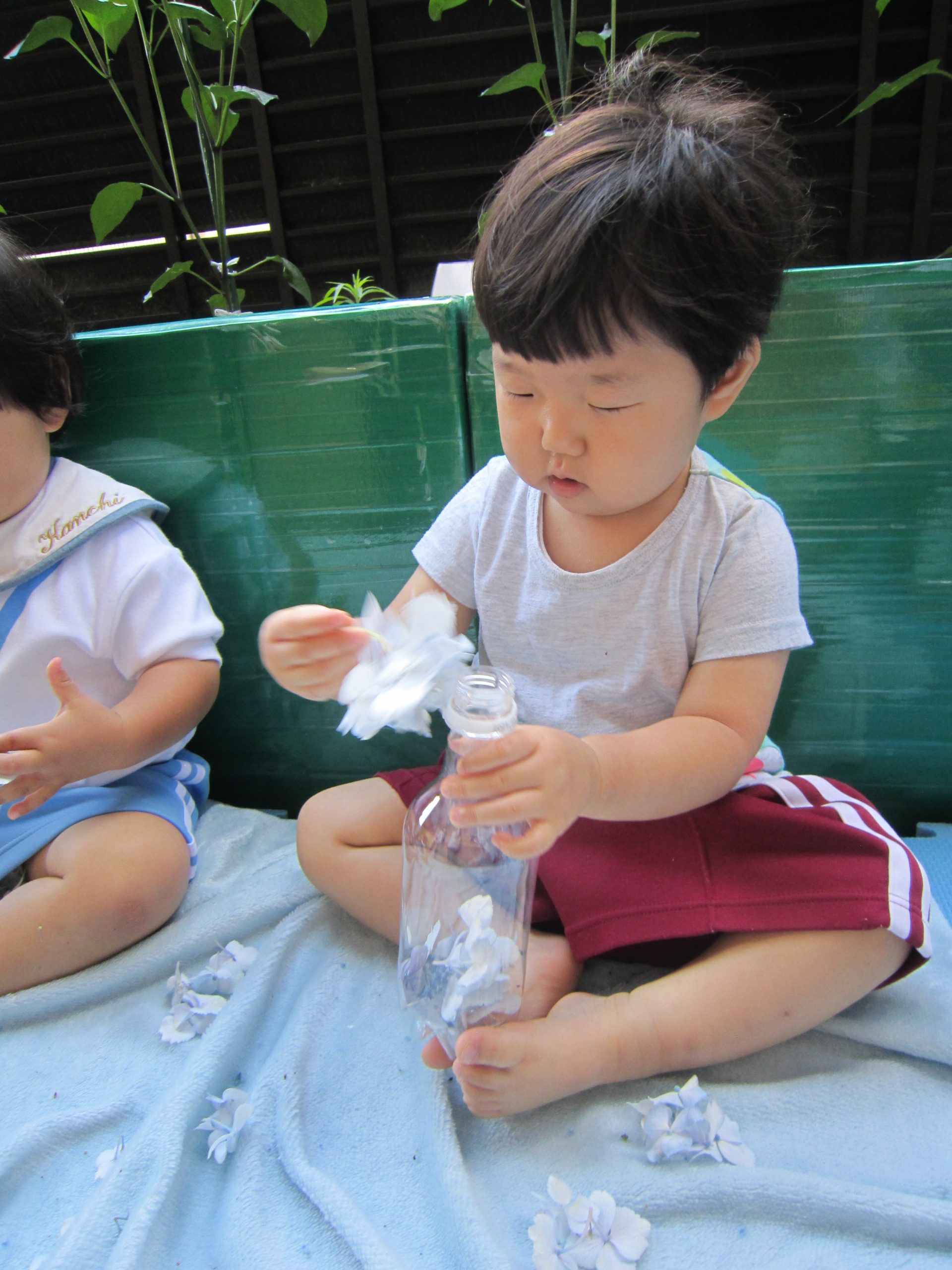 ジュース作り❕ うさぎ組2021年6月17日(木) 今日は、あじさいの花びらを使ってジュース作りを楽しみました🎵 ペットボトルの中に花びらを入れて お水を入れて 完成❕ 「カンパーイ」 「ごくごく・・」 「ジュースどうぞ」 あ~美味しかった🎶 今日作ったジュースは持って帰ります。 お家でもジュース遊びを楽しんでください🎵 « お水遊び? こぐま組 雨の日の活動 »