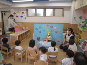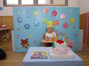 6月のお誕生日会2021年6月25日(金) 今日は、6月の誕生会がありました❕ 誕生児は1名です。 保育者から誕生カードを渡してもらい、ケーキの前で“ハイポーズ” 友達からの“Happy Birthday to you ”の歌のプレゼントにノリノリで体を揺らしていました🎶 保育者からの出し物は“はたらくくるまの”ペープサートです❕ みんなで歌を歌いながら見ました🎶 お誕生日おめでとうございます🎵 これからも素敵な笑顔をたくさん見せてください🎶 素敵な1年になりますように・・・・ « 泡あそび 七夕飾り(こぐま組) みんなでおばけを作ろう~ »