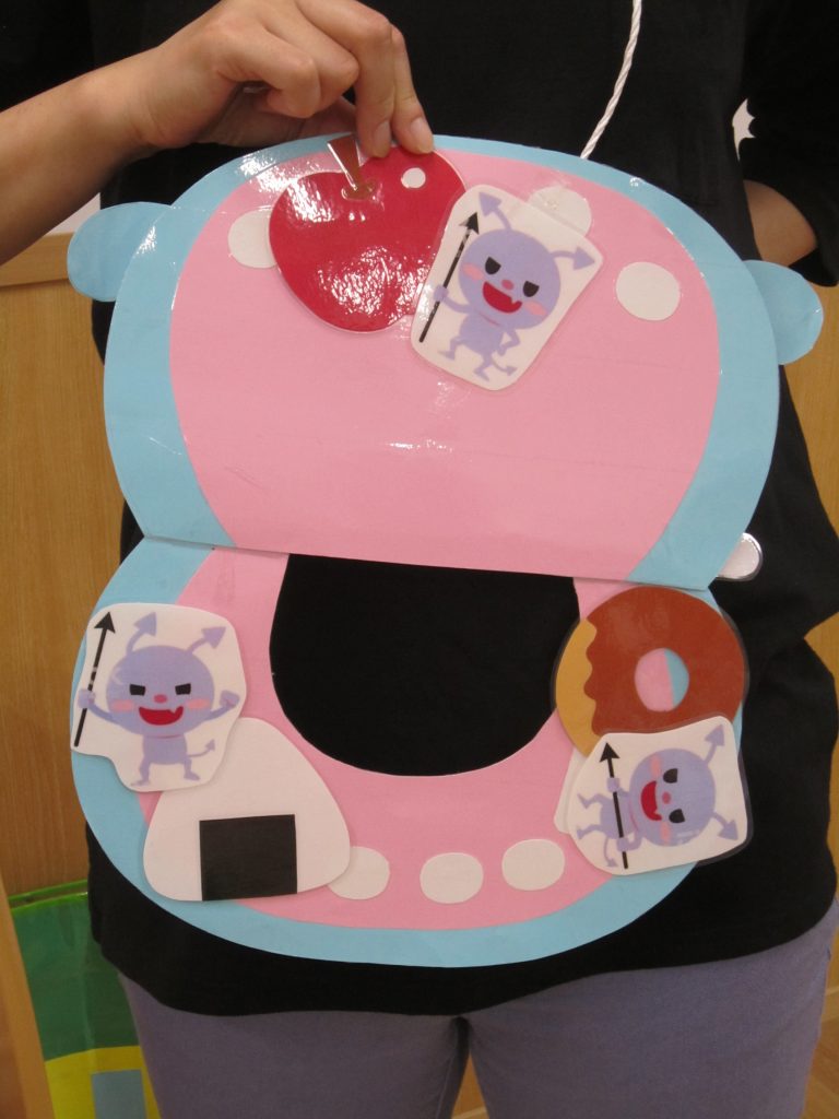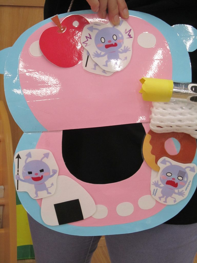 カバくんがやってきたよ!!2020年6月4日(木) 6月4日は虫歯予防デーです。 今日は「カバくんとむしばキン」のカードシアターをみました。 おやつをたべることがだいすきなカバくん… 食べた後、歯みがきをしないで寝ていると…むしばキンがいっぱい!! すると歯ブラシ王子がやってきて♪歯をみがきましょう~♪シュッシュシュッ~♪ おしえてもらったように♪ゴ~シゴ~シ 歯ブラシ王子でゴ~シゴ~シ♪ ピカピカ✨になりました。 楽しかったね♡ « 新しいお友だちがきたよ!! 英語であそぼ!! »