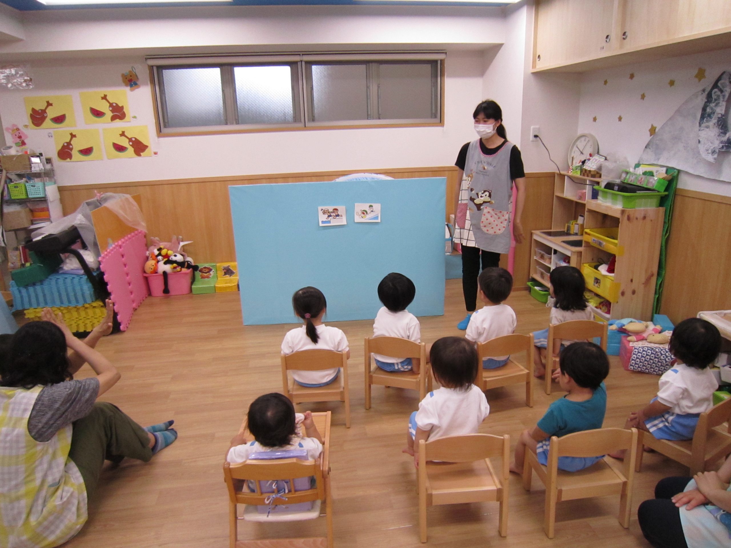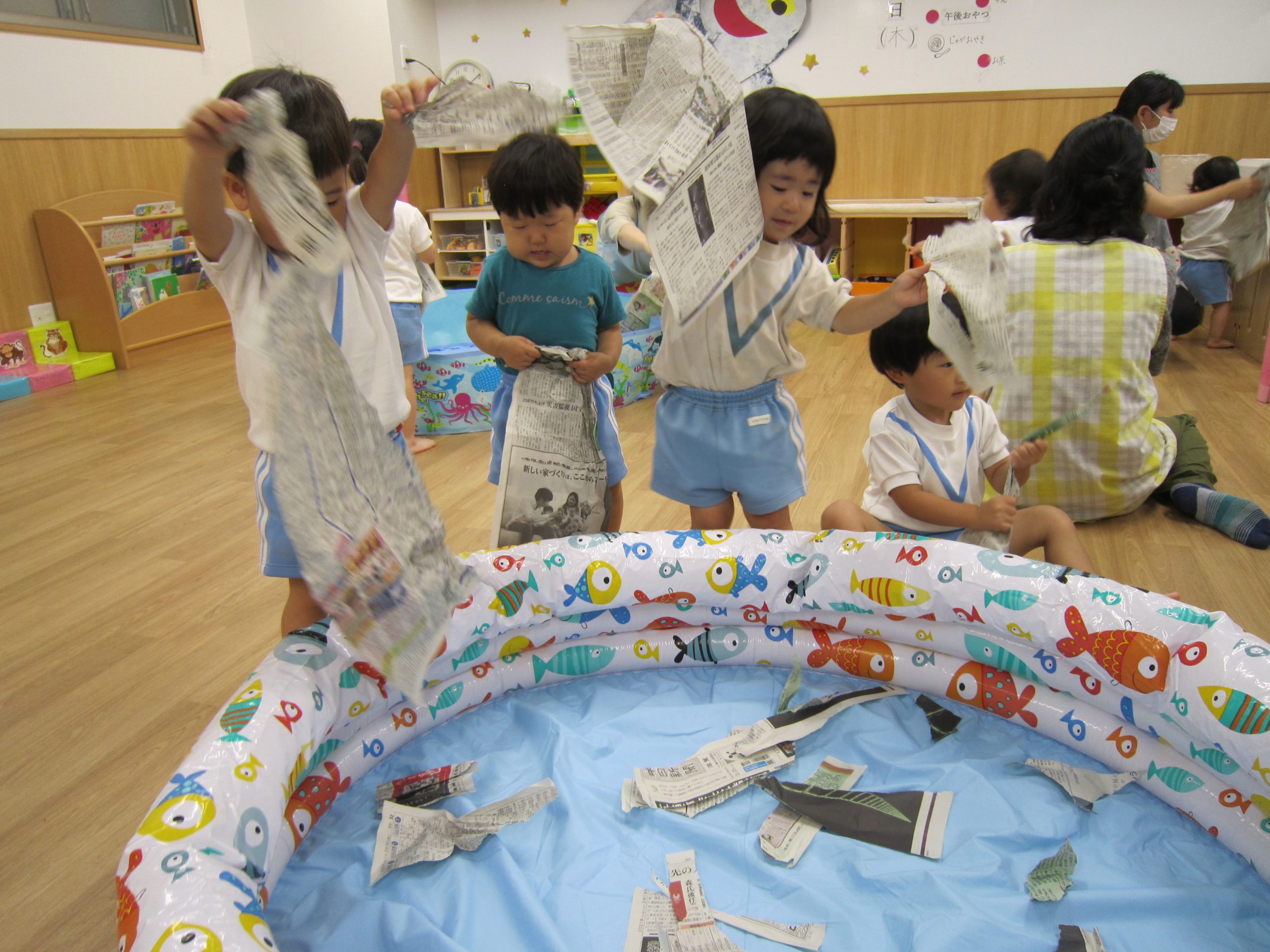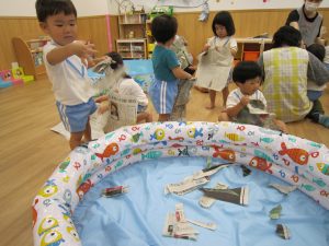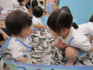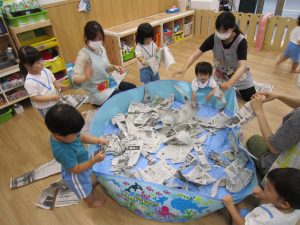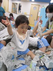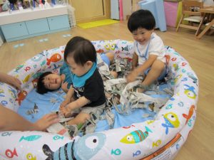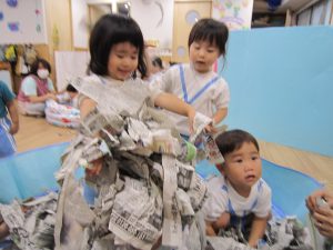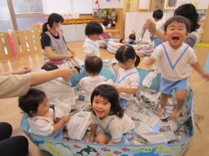 プール開き(7月1日)2021年7月2日(金) 昨日は7月1日プール開きの日でした❕ しかし、あいにくの天気・・・・ それでもプールに入りたい子ども達は、新聞紙を水に見立てて、新聞紙プールを楽しみました🎵 遊ぶ前に、プールに入る時の約束は何があるのか教えてもらいました❕ その後、新聞紙プールの準備を始めました🎵 準備完了! 「入るよ~」 早くプールに入りたいね❕ « チェーンリング遊び(こぐま組) ありがとう♪ »