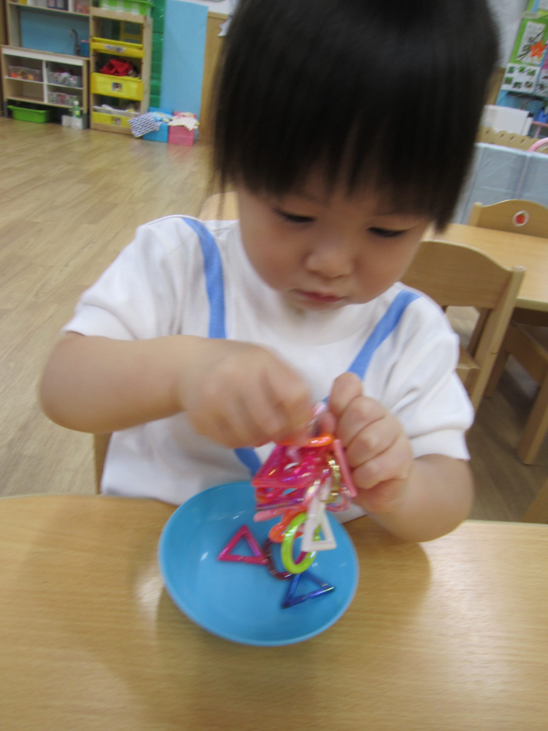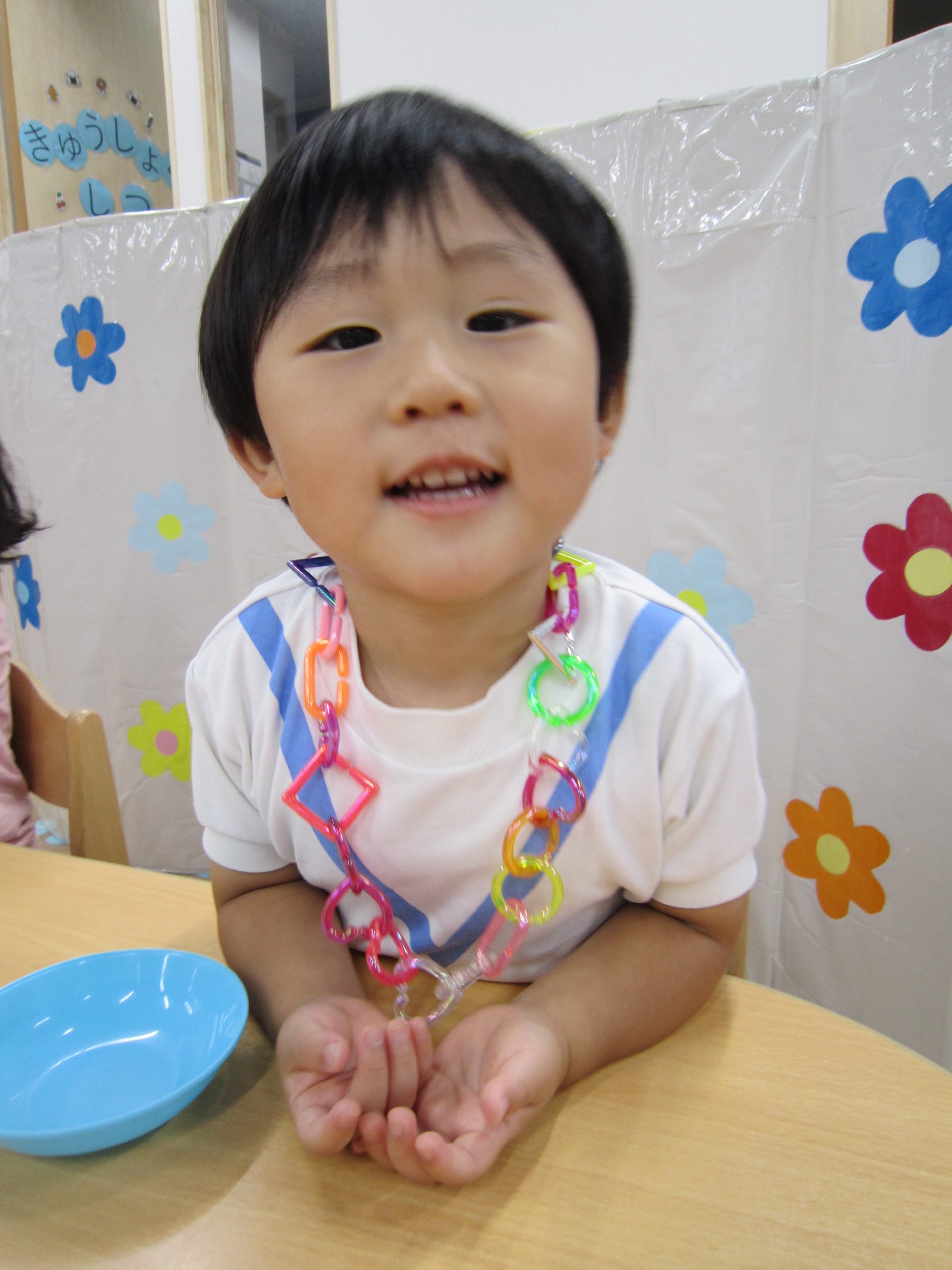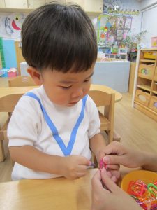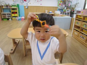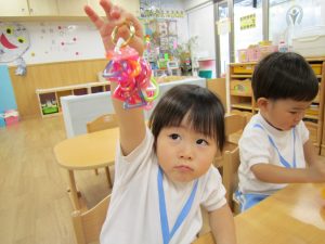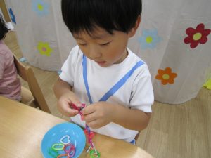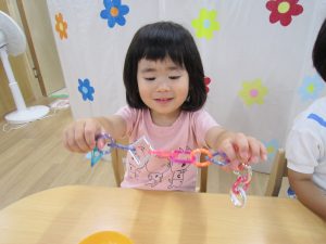 チェーンリング遊び(こぐま組)2021年7月2日(金) 今日のこぐま組は、水遊びをする前にチェーンリングで遊びました🎵 “じゃ~ん”完成🎵 そして、完成したチェーンリングは・・・・七夕飾りに変身しました🎵 お迎えの際に見てください🎶 7月1日より笹に飾りをつけてます🎵 お時間がある際は、お子さんと一緒に飾ってくださいね🎵 « 収穫 プール開き(7月1日) »