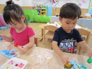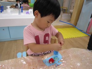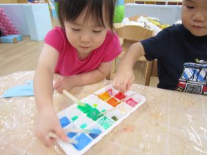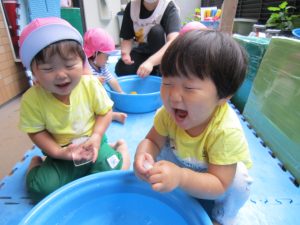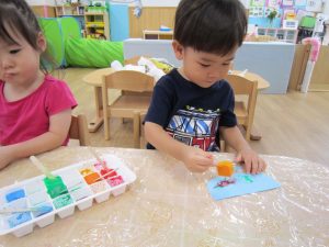 氷あそび2021年7月28日(水) 今日は不審者訓練の後、氷あそびを楽しみました♪ こぐま組は氷絵の具を使ってお絵描き♪ “どれにしようかなぁ~” うさぎ組は氷あそび・色氷あそび🎵 冷たかったけど楽しかった🎵 « ピーマンの収穫❕ プール遊び »