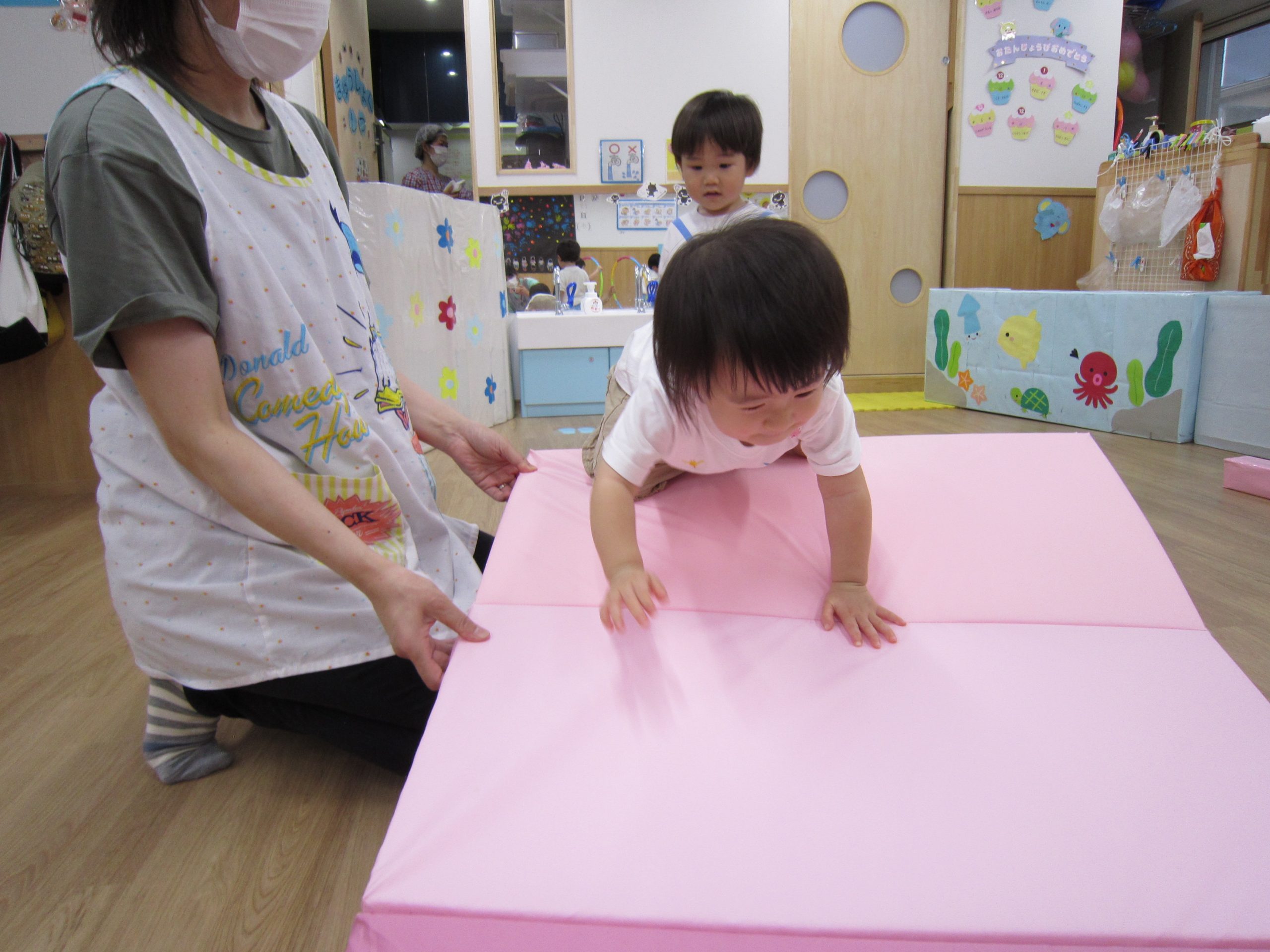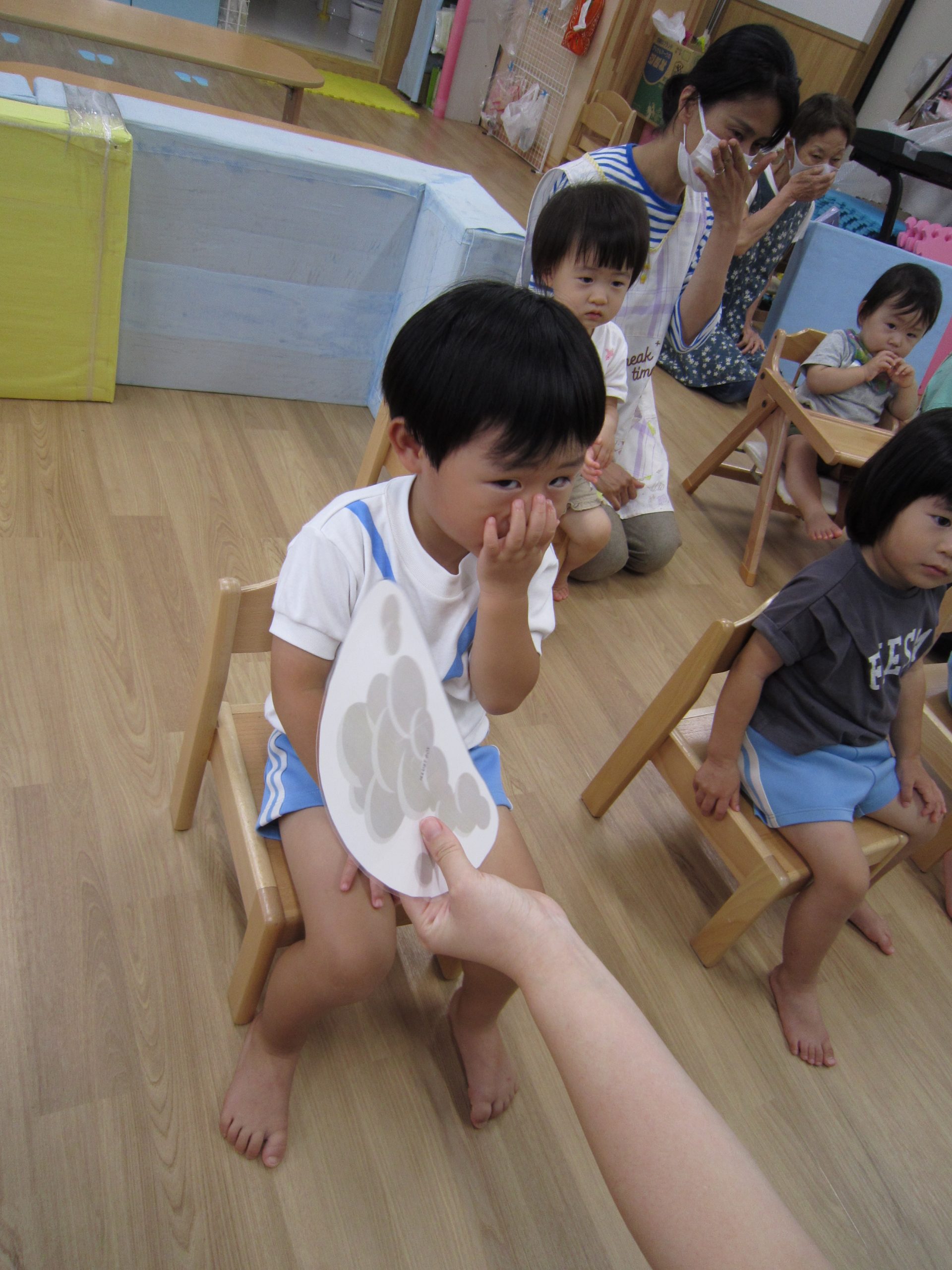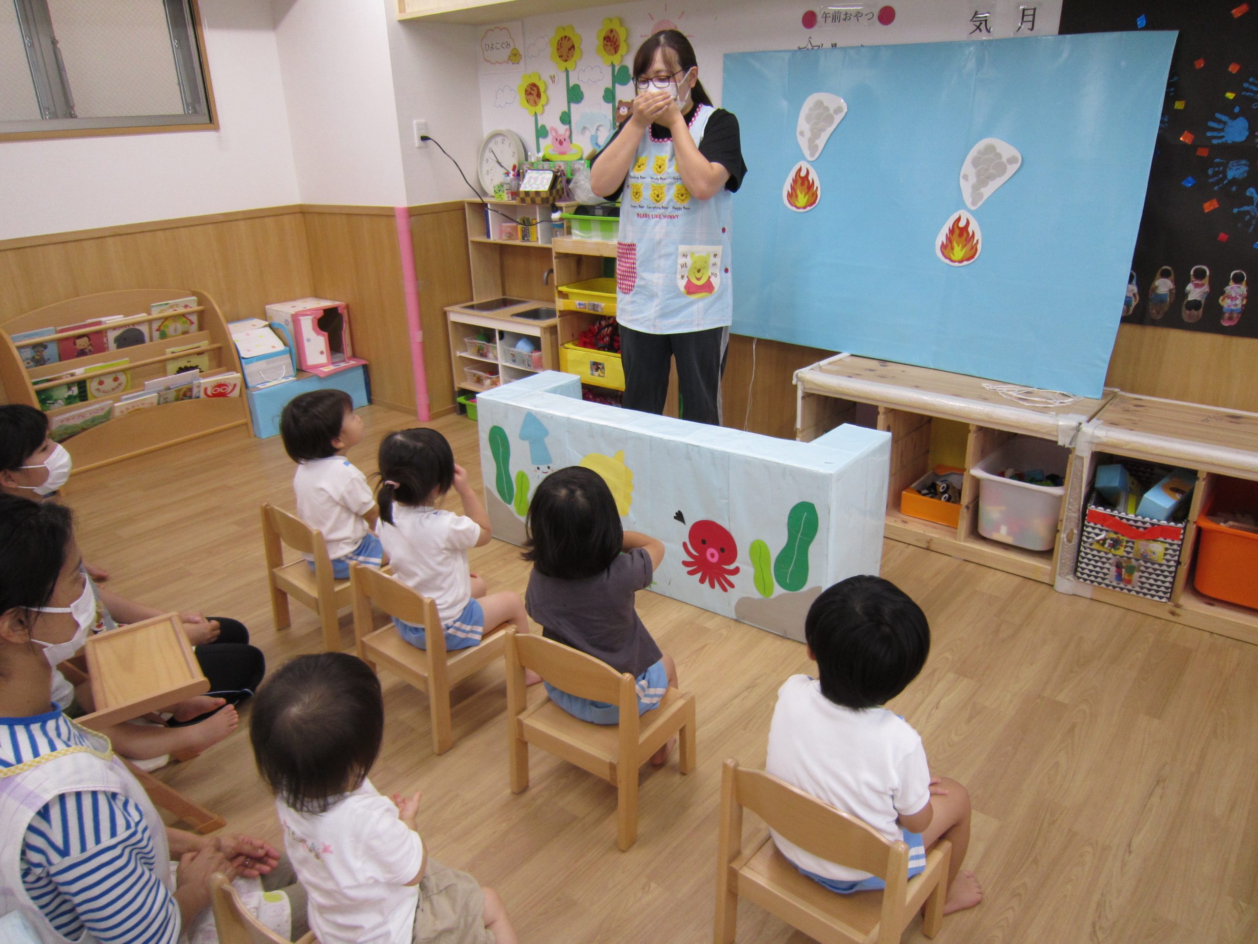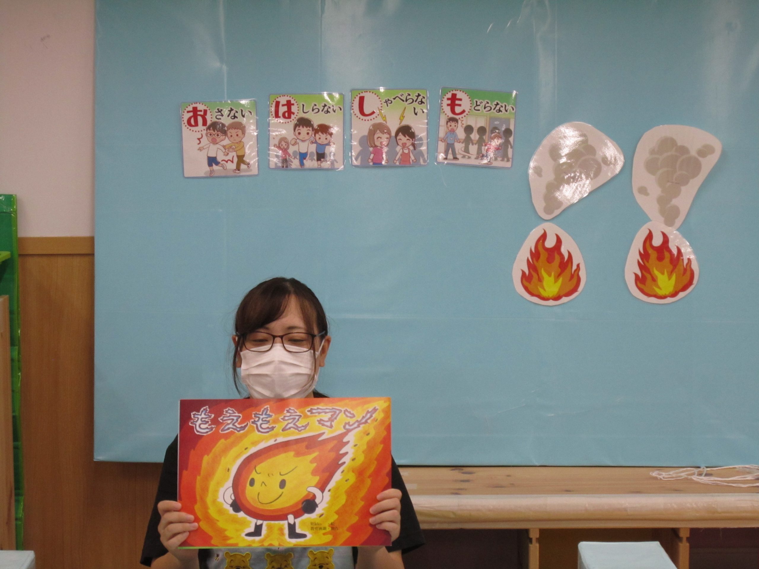 避難訓練・室内遊び2021年8月18日(水) 今日は避難訓練がありました❕ 職員室から火災を想定しての訓練でした。 訓練後は、保育者の話を聞きました❕ 「火が出て、煙が出てきたら」と保育者が子ども達に聞いてみると・・・ 子ども達は、口に手を当てていました❕ すごーい🎵 その後、紙芝居をみました❕ 避難訓練が終わると、室内で遊びました🎵 フープを使って電車ごっこ❕ フープのトンネルくぐり❕ 一本橋を渡ります❕ マットの山をのぼります❕ 後ろ向きから上手にゆっくりと・・ 今日もたくさん遊んで楽しかったね🎵 今日はお迎えの時に引き渡し訓練もあります❕ « 色鮮やかな小麦粉粘土 ピーマンの収穫❕ »