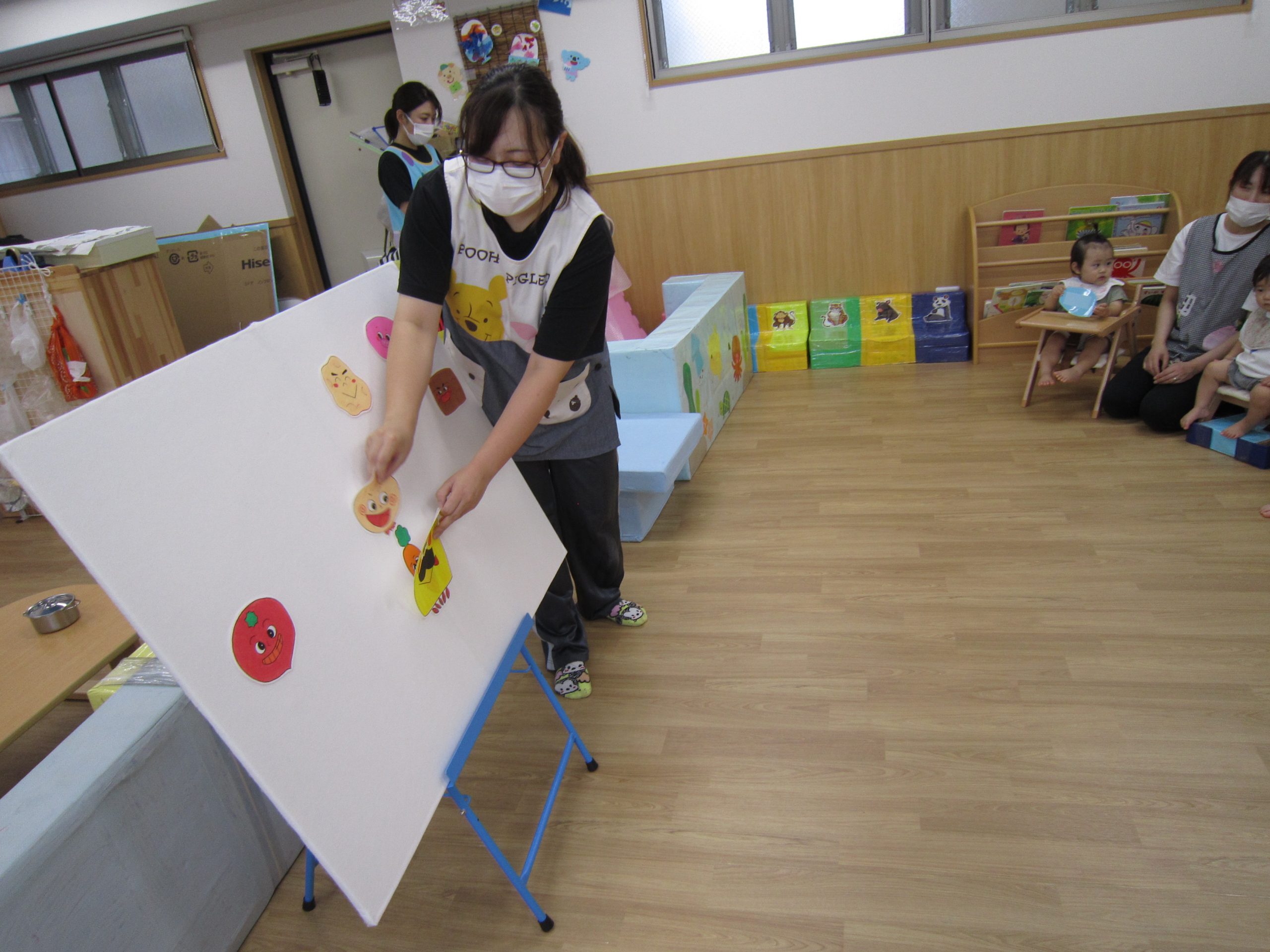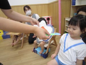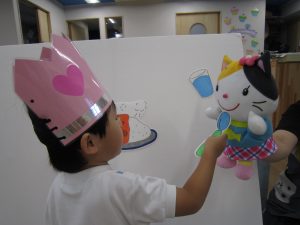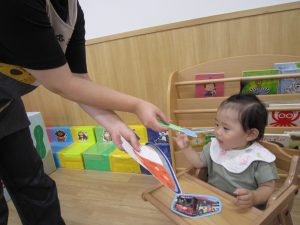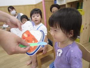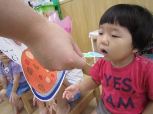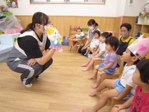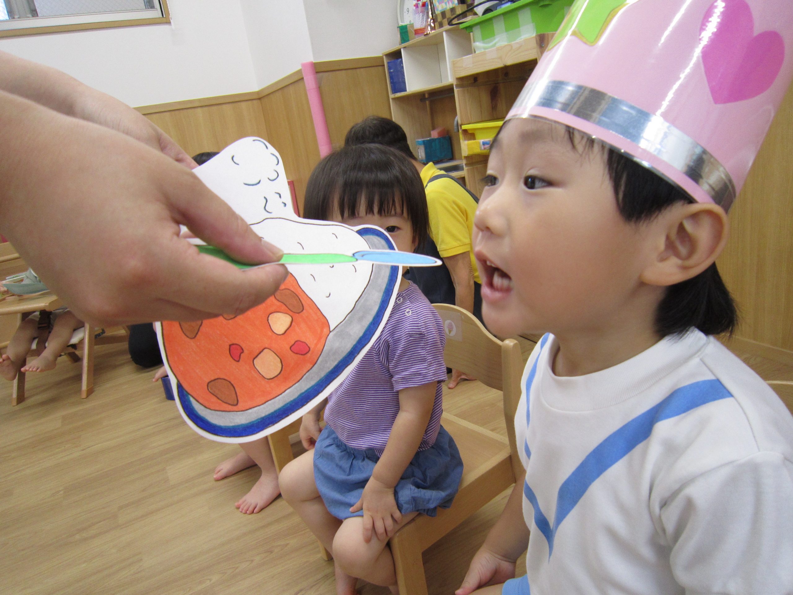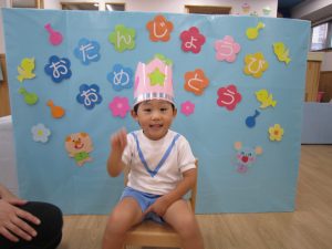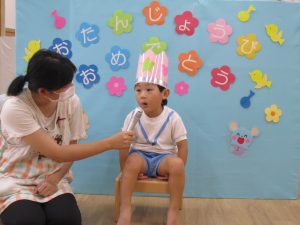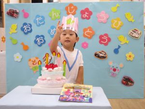 8月の誕生会2021年8月27日(金) 今日は8月の誕生会がありました🎵 待ちに待った誕生会に大喜びです🎶 保育者から「好きな乗り物は何ですか?」の質問に「消防車」と言って答えていました🎶 ケーキの前でハイポーズ❕ 友達からの歌のプレゼントにニコニコ笑顔でした🎵 保育者からの出し物は“カレーライス”のパネルシアターです♪ みいちゃんも遊びに来てくれました♬ パネルシアターが終わり、カレーライスが完成❕ まずは、みんなが大好きなみいちゃんから 「どうぞ」 それから・・・ 大きな口で・・・ 「パックン」 美味しいね🎵 お誕生日おめでとうございます! 素敵な一年になりますように・・・ « 今年度最後のプール遊び🎶 色鮮やかな小麦粉粘土 »