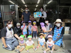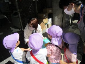 いつもありがとうございます♪2021年9月6日(月) 今日はいつも大変お世話になっている、えんどう食料品店さんにお礼のご挨拶に行きました♪ 「どうぞ」と言ってこぐま組の友達が渡してくれました♪ 子ども達が作った作品を見て喜んでくれました🎵 子ども達は「えんどうしゃん」と言って、毎日来てくれるのを心待ちにしています。 « みとつ公園 ひよこ組・うさぎ組 色とりどりの寒天遊び »