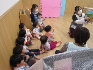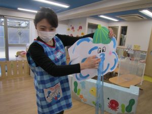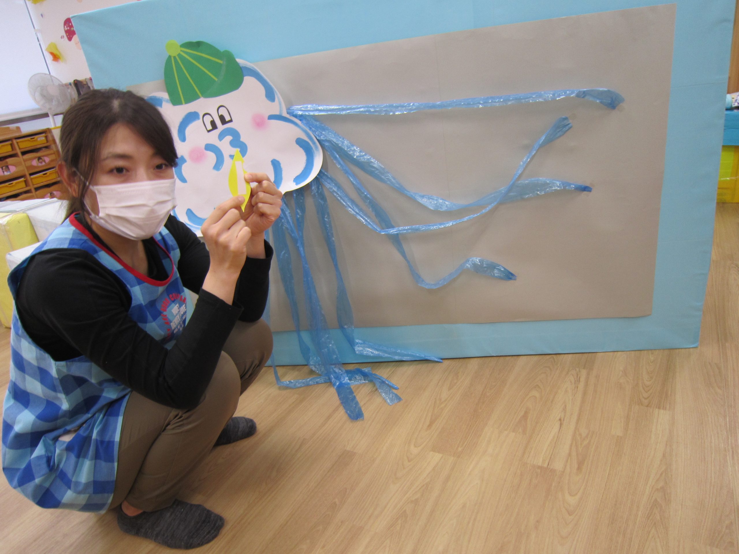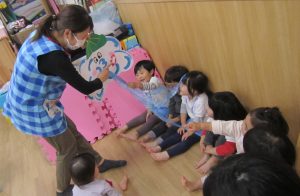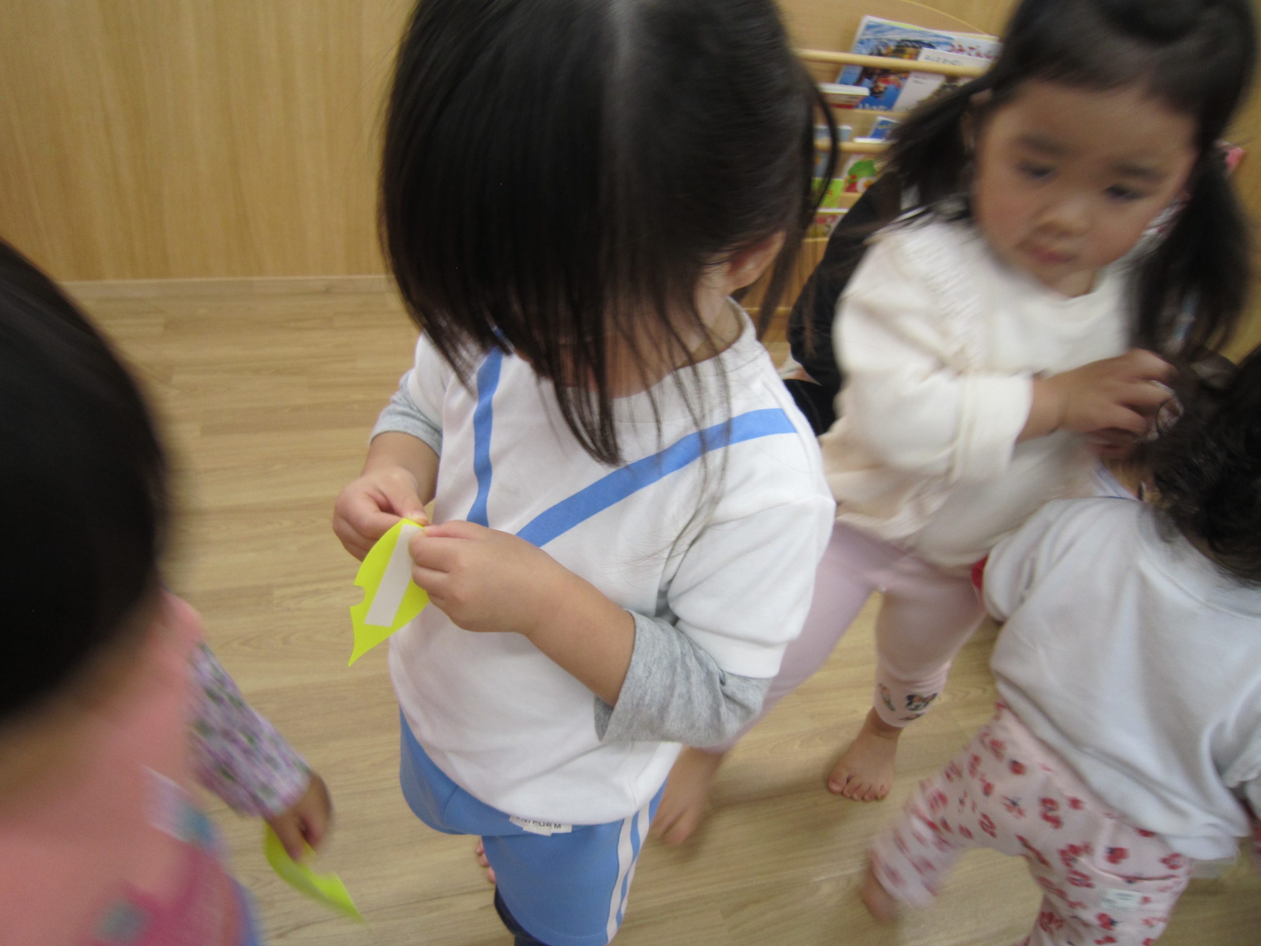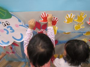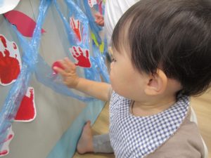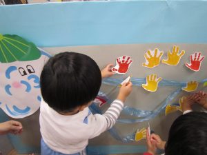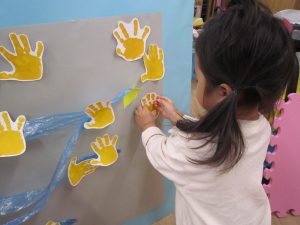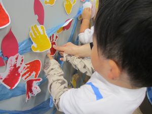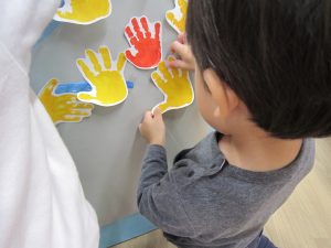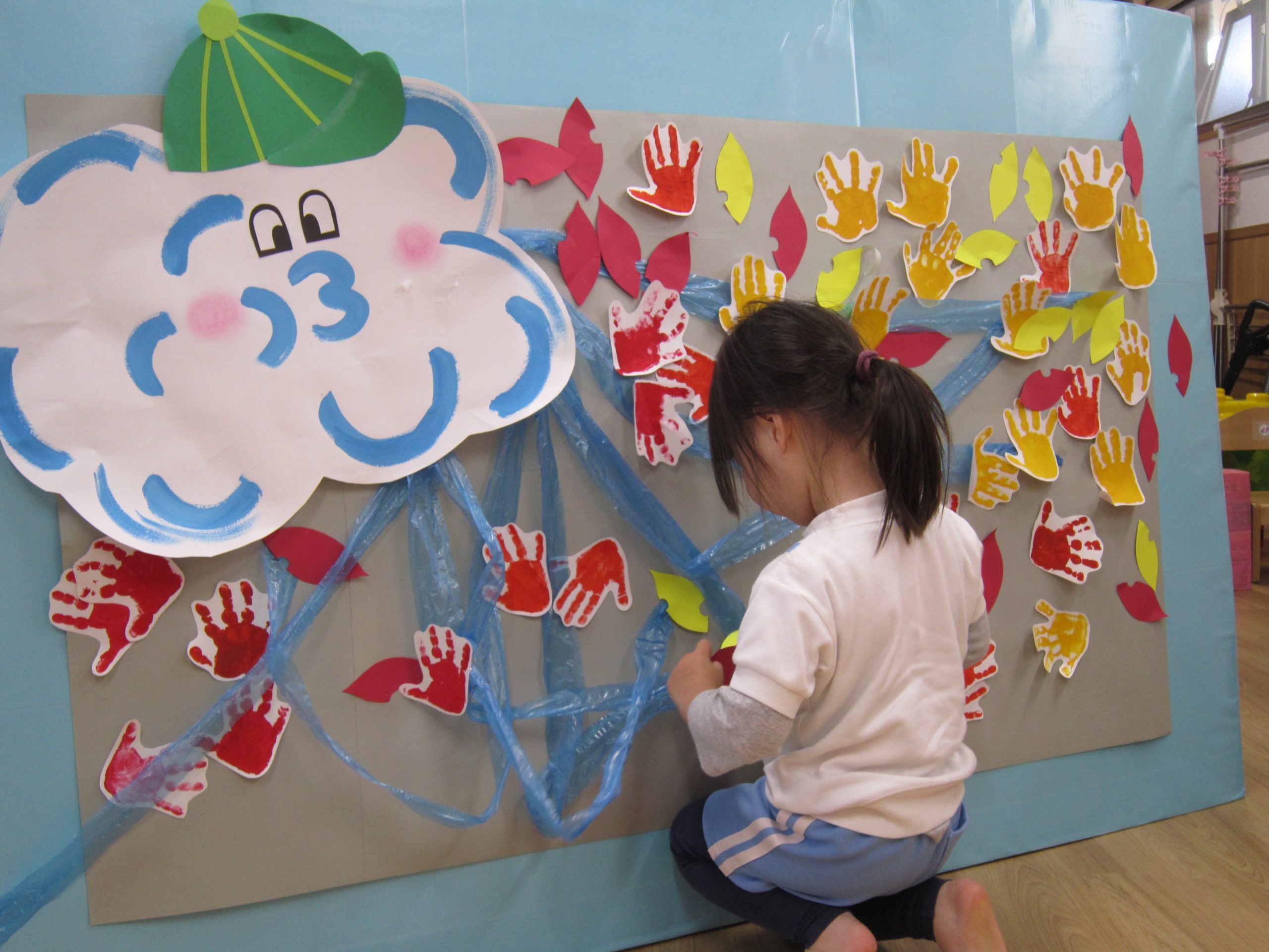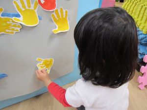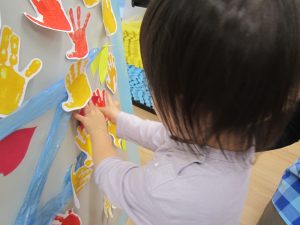 11月の大型壁面制作2021年11月11日(木) 今日は、11月の大型壁面制作をみんなでしました❕ 制作が始まる前に“きたかぜとたいよう”の絵本をみました🎵 絵本が終わると・・・ 突然❕ もりやまナーサリーにきたかぜが現れました❕ そして、みんなのところへ・・・ さぁ❕ 壁面制作の始まり❕ まずは、両面テープをはずして クラスごとに色を変えた、葉っぱに見立てた手形を貼っていきました🎵 ひよこ組は、赤色 うさぎ組は、だいだい色 こぐま組は、黄色 最後の1枚を貼って完成❕ 素敵な壁面ができました🎵 « 記念樹を植えました❕ こぐま組 下井田公園 »
