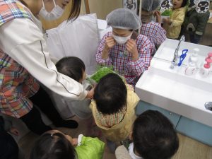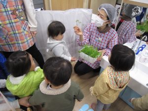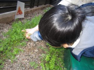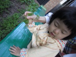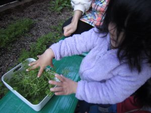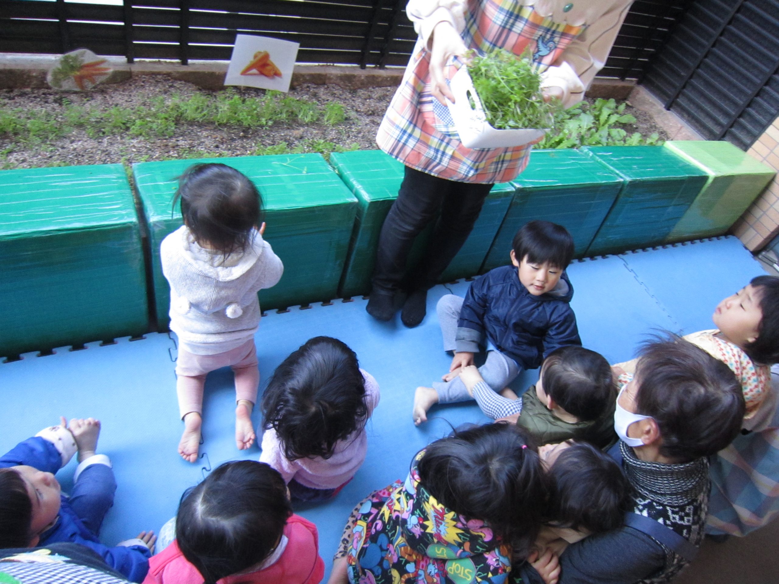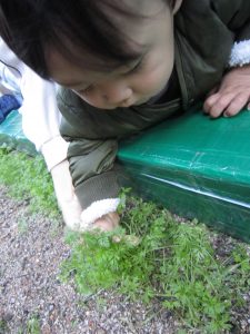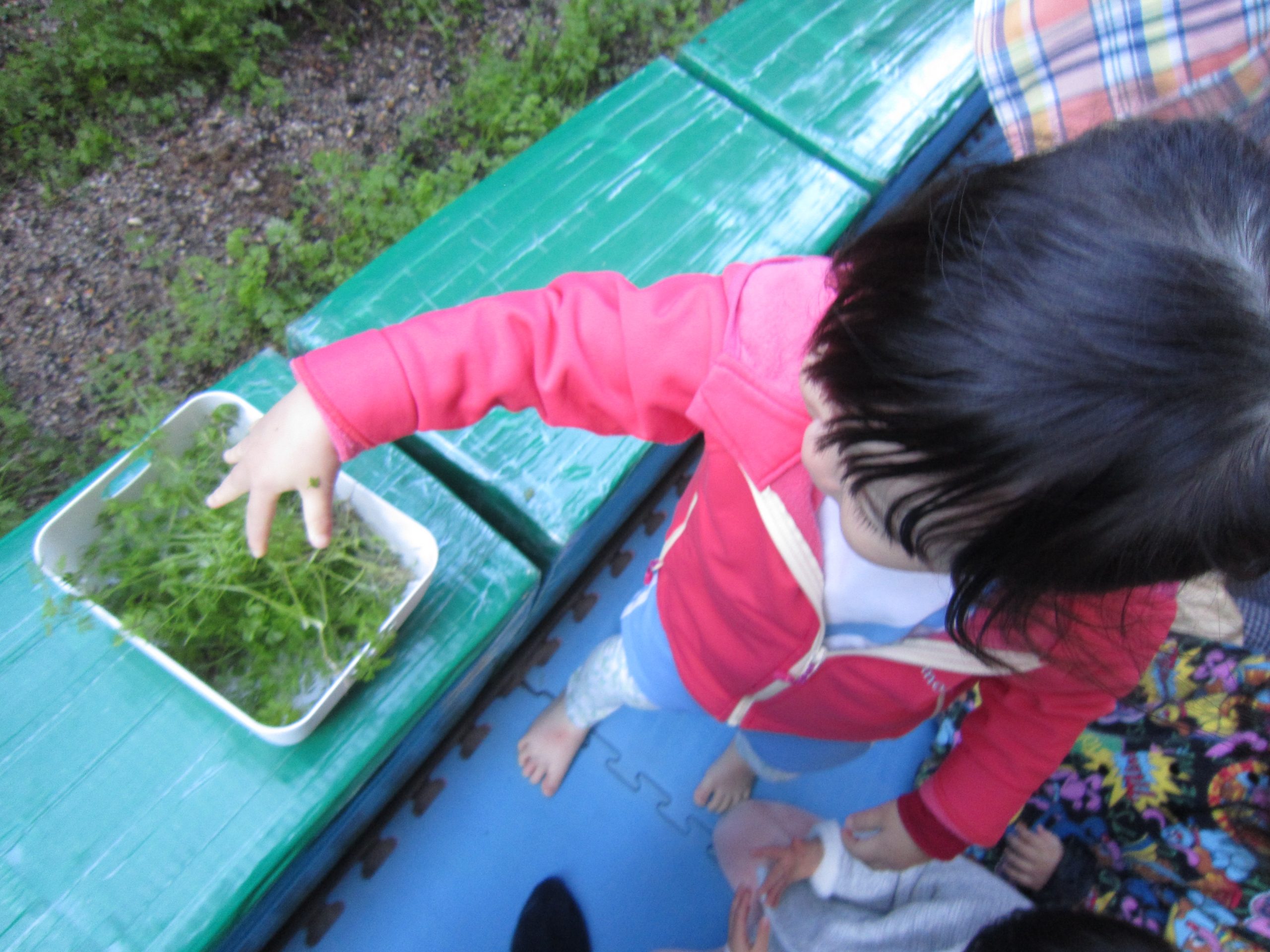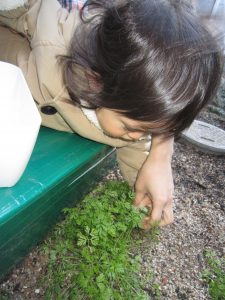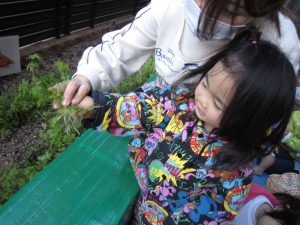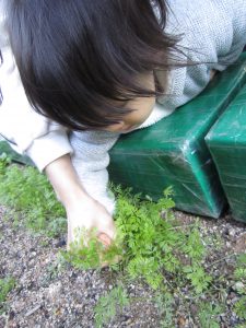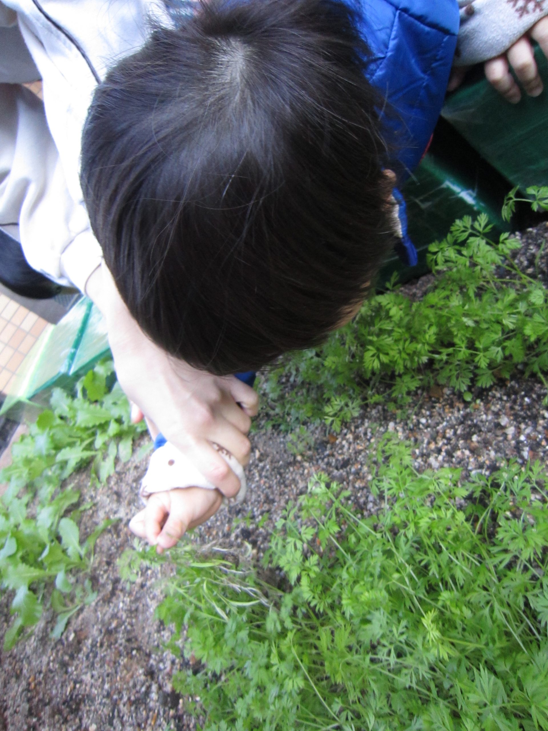 人参の間引き2021年12月2日(木) 今日は、人参の間引きをしました❕ 保育者と一緒に「よいしょ」と言って、人参の葉っぱを抜きました🎵 こんなにたくさんの間引き菜です❕ 今日は、うさぎぐみが給食の先生に渡しに行ってくれました❕ 「おねがいします」 給食に間引き菜を加えてくれました🎵 カブも人参も大きくなあ~れ❕ « 作品展 お話し会 »