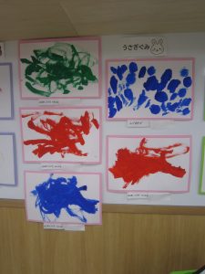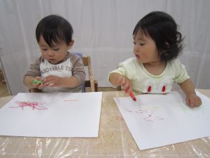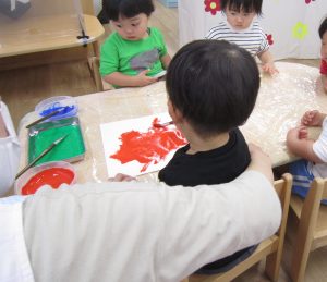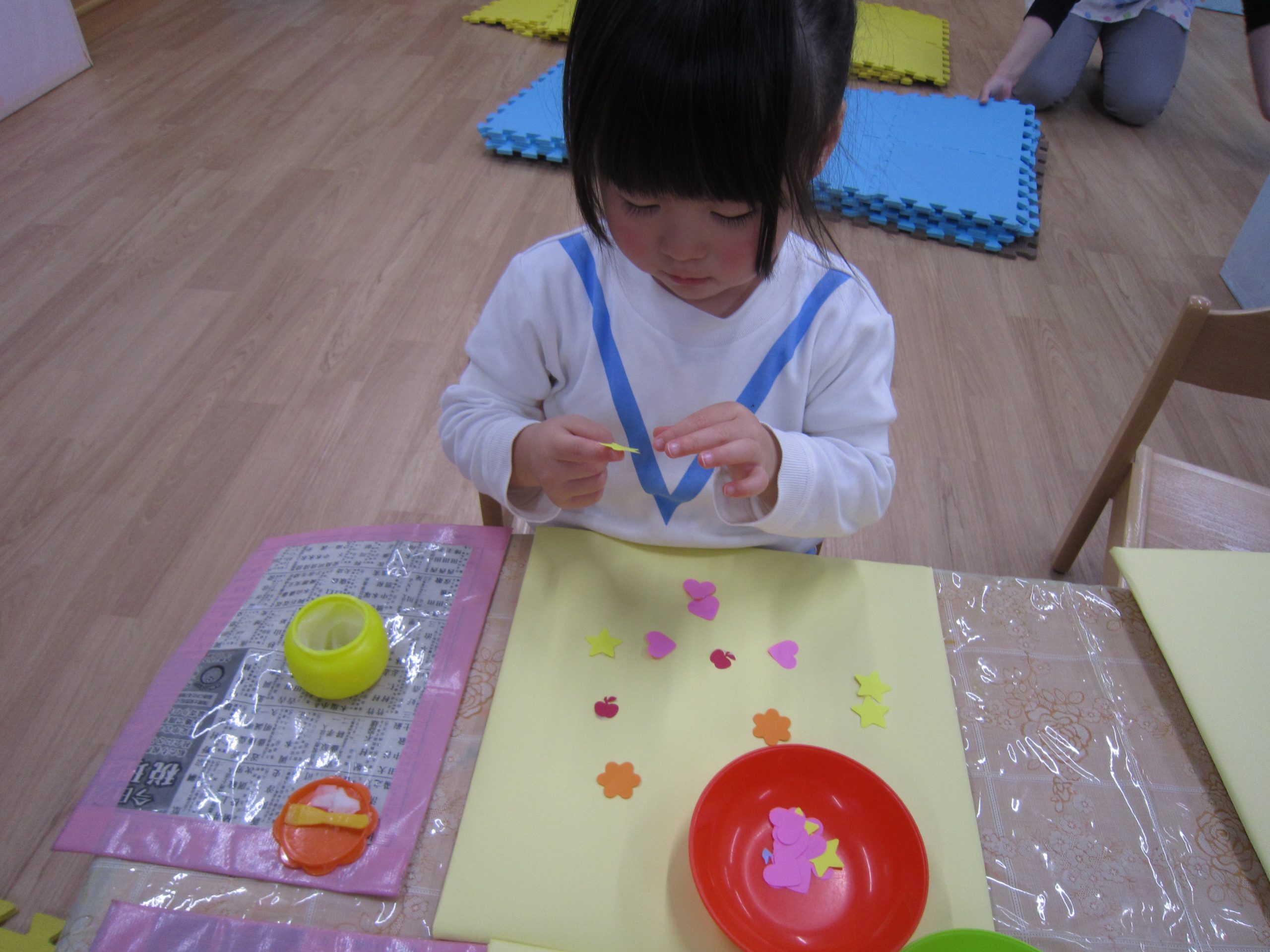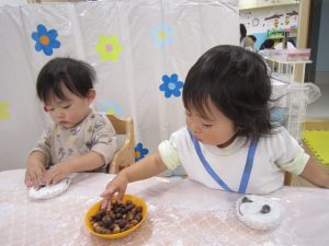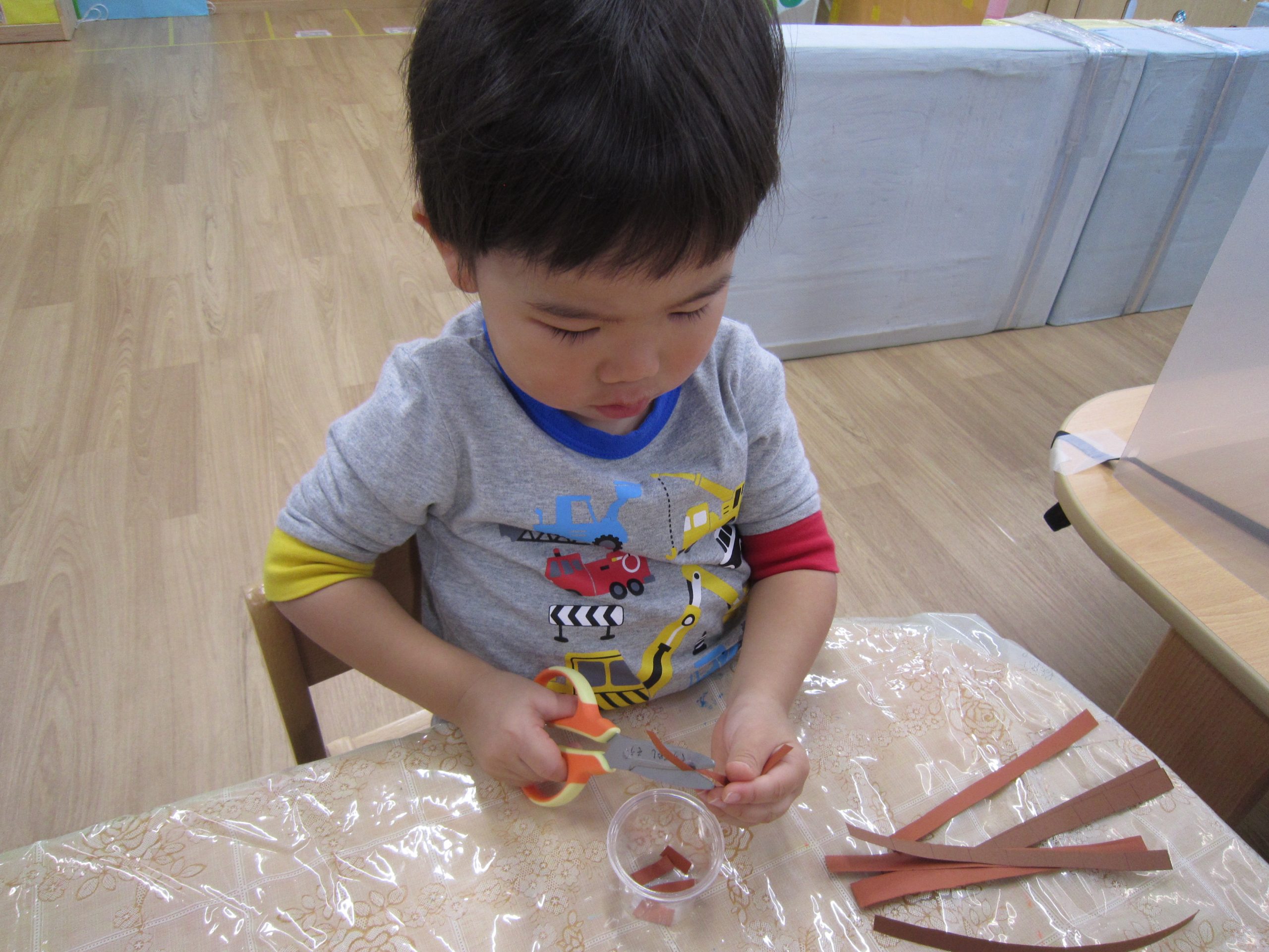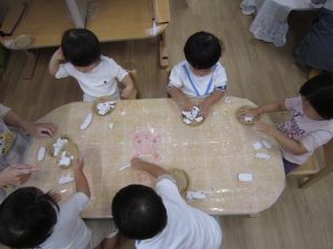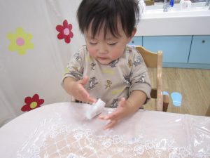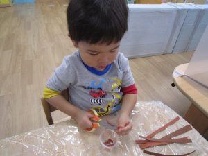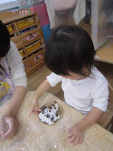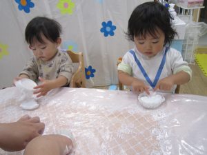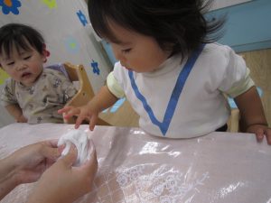 初めての紙粘土に挑戦しました。小麦粉粘土や粘土と違って少し手にくっつく事に抵抗を感じていましたが、保育者が楽しそうに紙粘土で遊んでいると、自ら指先で「つんつん」とつついたり、手のひらで押したり、つぶしたりと、たくさん紙粘土に触れて感触を楽しむ姿が見られました。