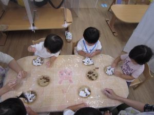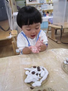 おままごとでお料理を作ることが大好きな子ども達は、今回ケーキを作りました。