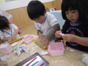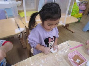 粘土遊びでは「○○作る~」と作りたいものをイメージしながら作っています。