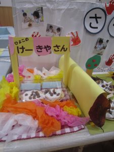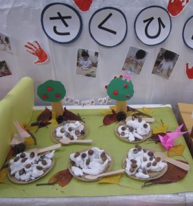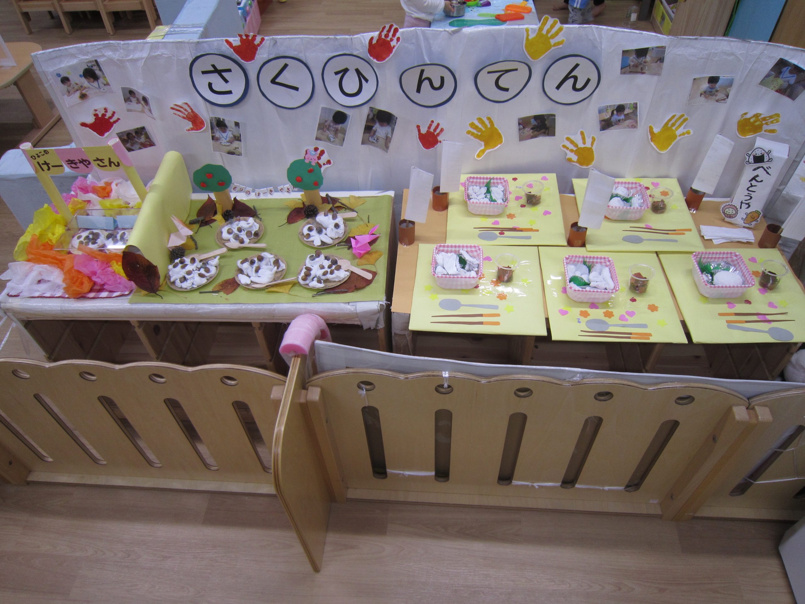 お散歩で拾った秋の自然物もたくさん飾り“もりのけーきやさん”をイメージしました。