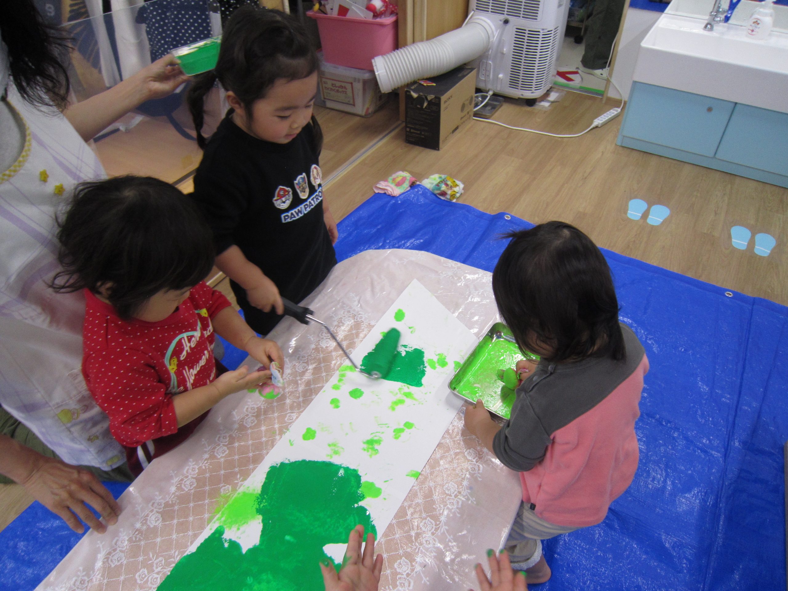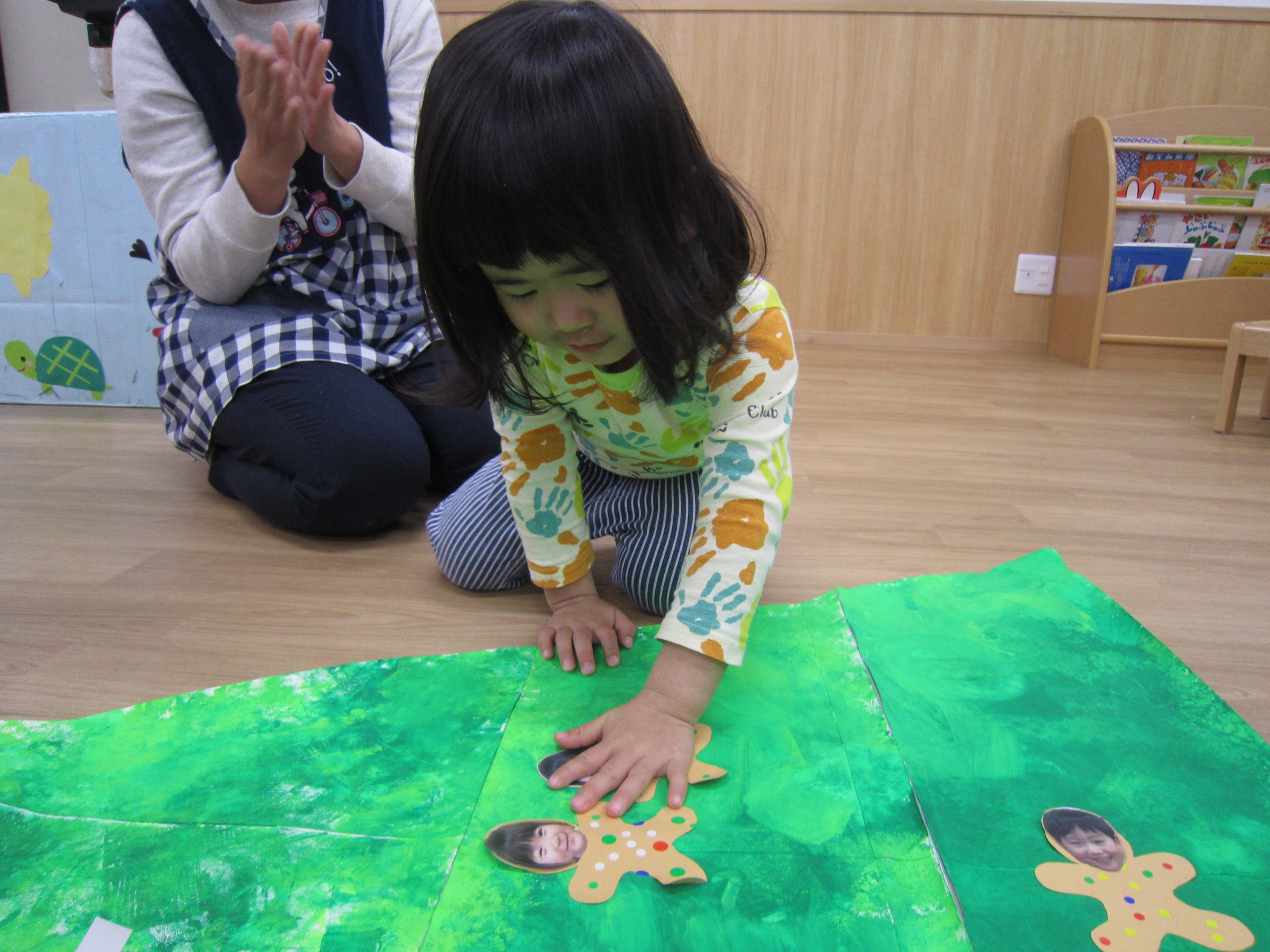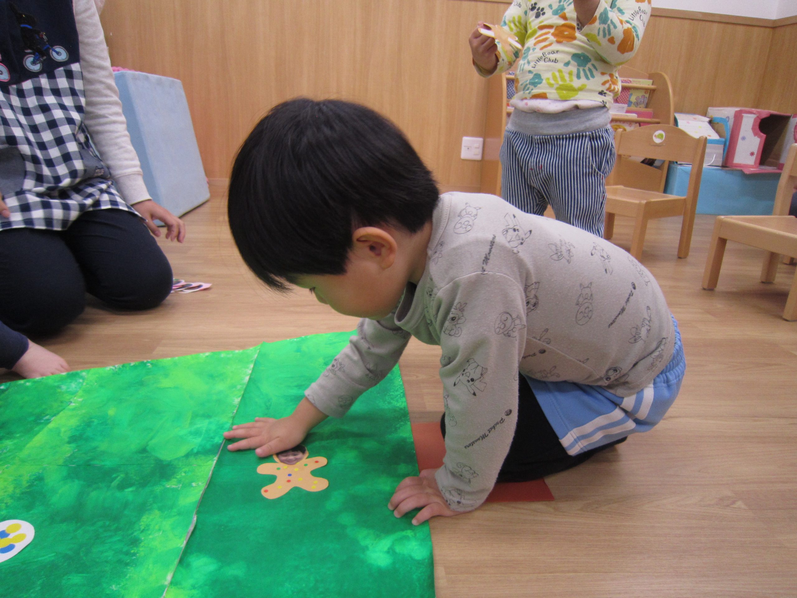 12月の大型壁面制作❕2021年12月13日(月) 今日は、先週(12/9)大型壁面制作の続きをしました❕ 12/9日の様子 みんなでクリスマスの絵本を見ました。 その後、大型壁面制作の始まり❕ ローラーやスポンジ、タンポを使って色を塗っていきました🎵 次は飾りを作りました🎵 それぞれ自分の顔が貼ってある雪だるまやジンジャーマンにシールを貼りました❕ そして、今日は両面テープをはがして、それぞれ作った飾りを貼っていきました🎵 最後にみんなでシールを貼って 完成🎵 素敵な壁面ができました❕ 本日より飾ってありますので、ご覧ください🎶 « もうすぐXmas🎵 作品展 »