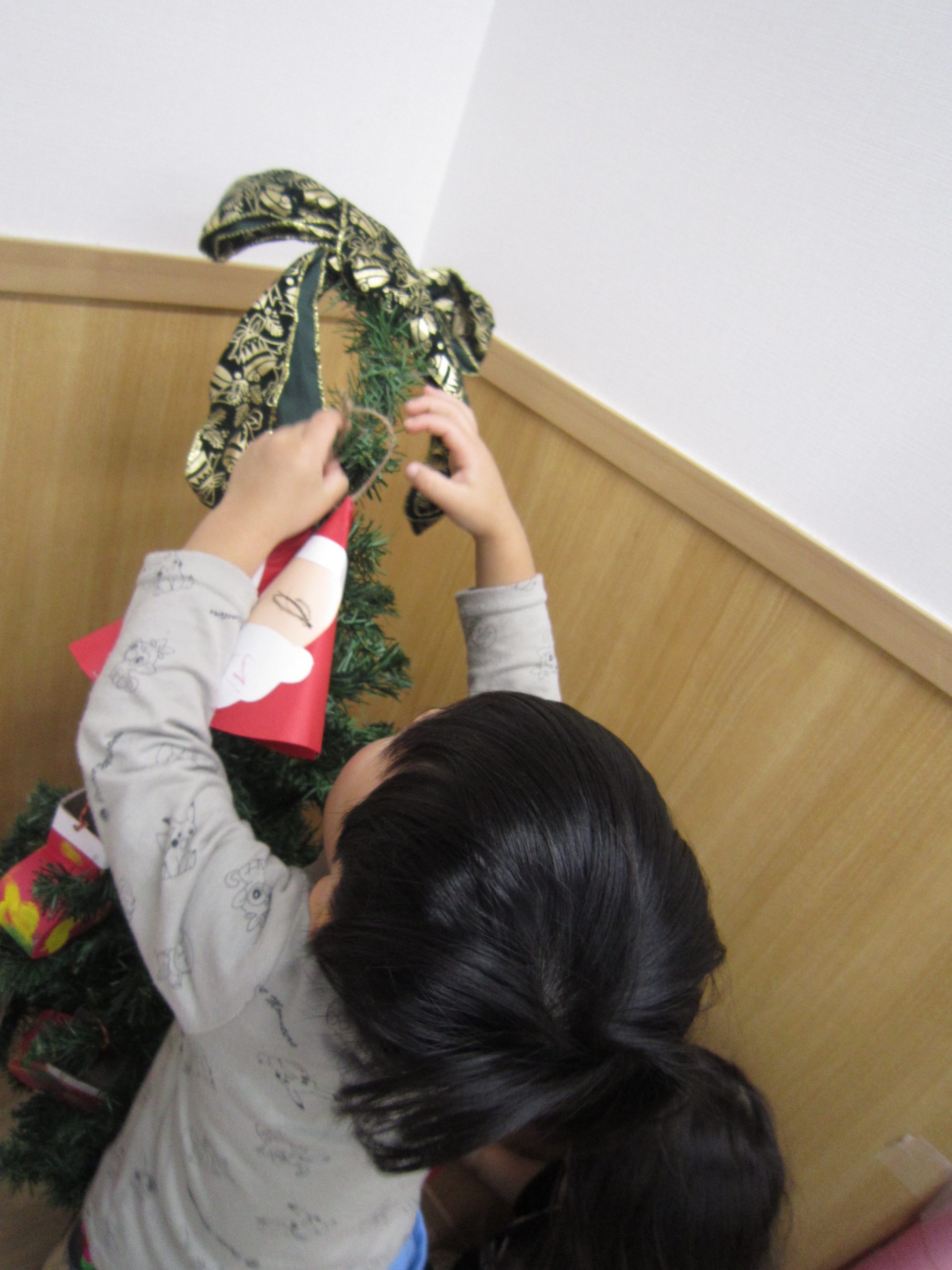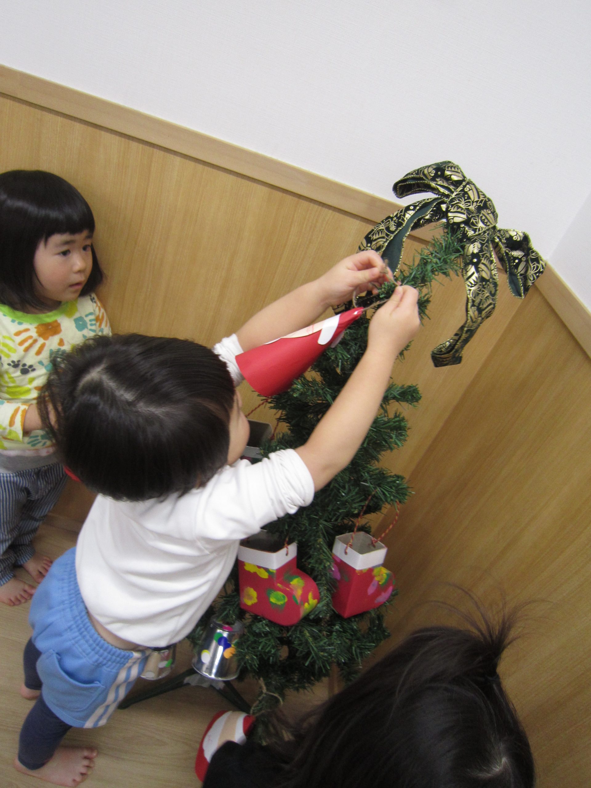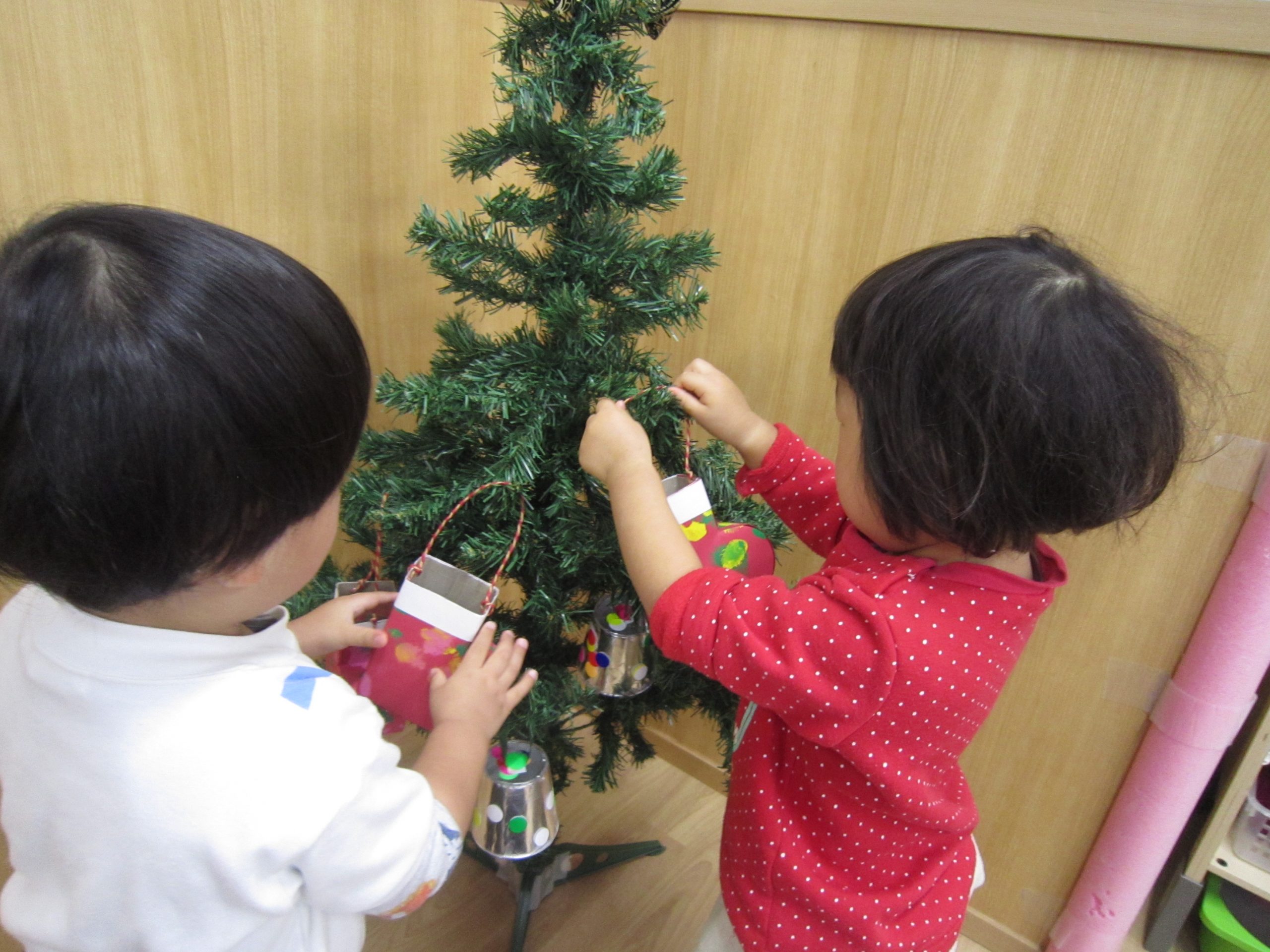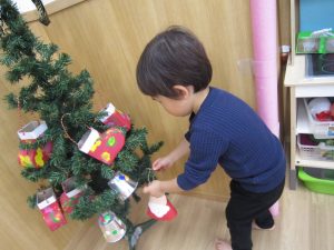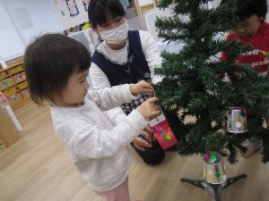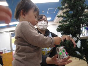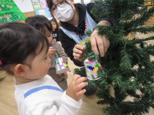 もうすぐXmas🎵2021年12月13日(月) 今日はクリスマスツリーの飾りつけをしました🎶 以前作った飾りを順番に飾っていきました❕ 完成❕ ライト点灯❕と同時に子ども達の「わぁ~」「きれい」と言う声が聞こえてきました🎵 今年のクリスマスも楽しみにしている子ども達でした🎵 « 12月の誕生会 12月の大型壁面制作❕ »