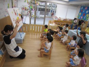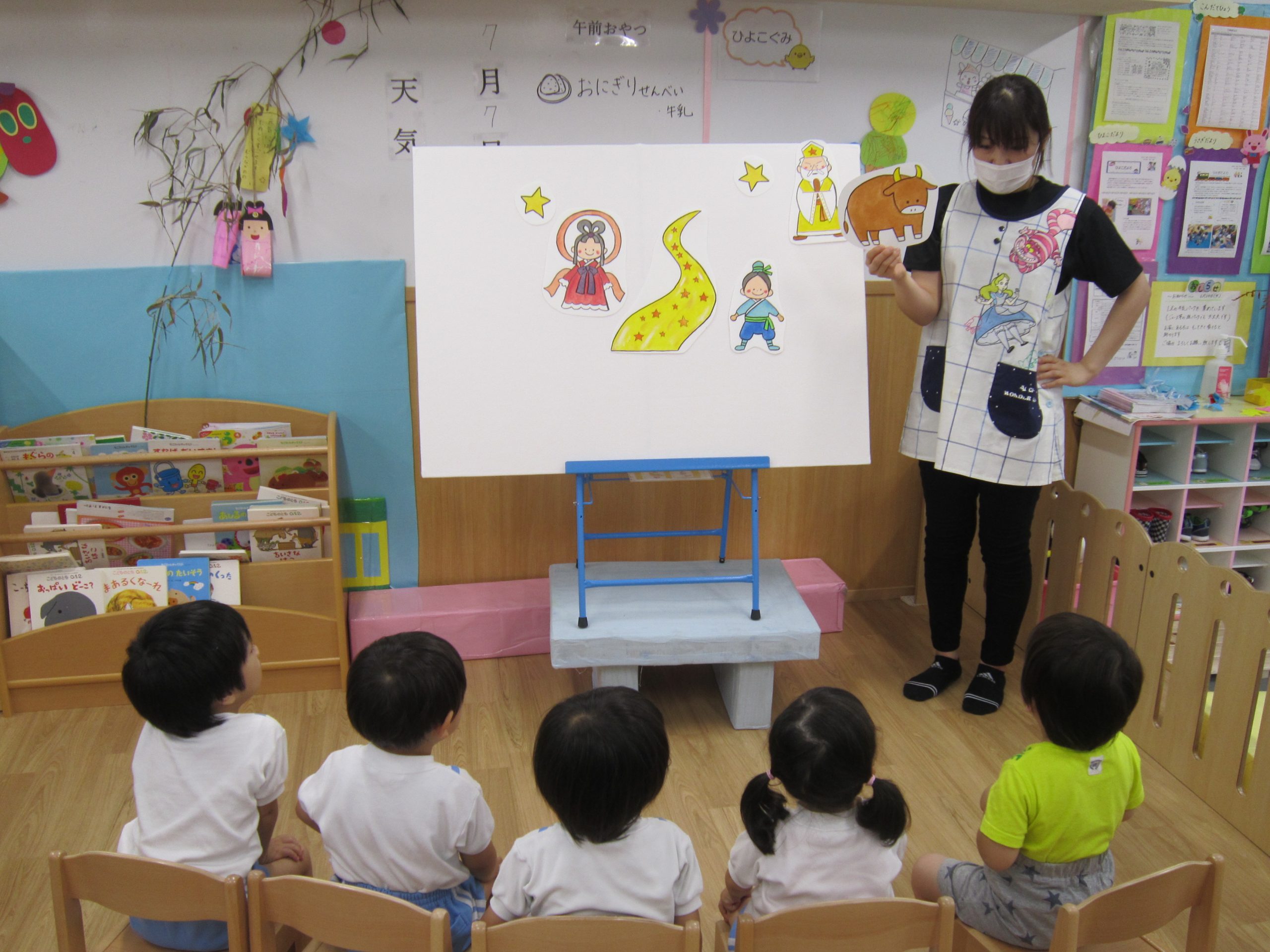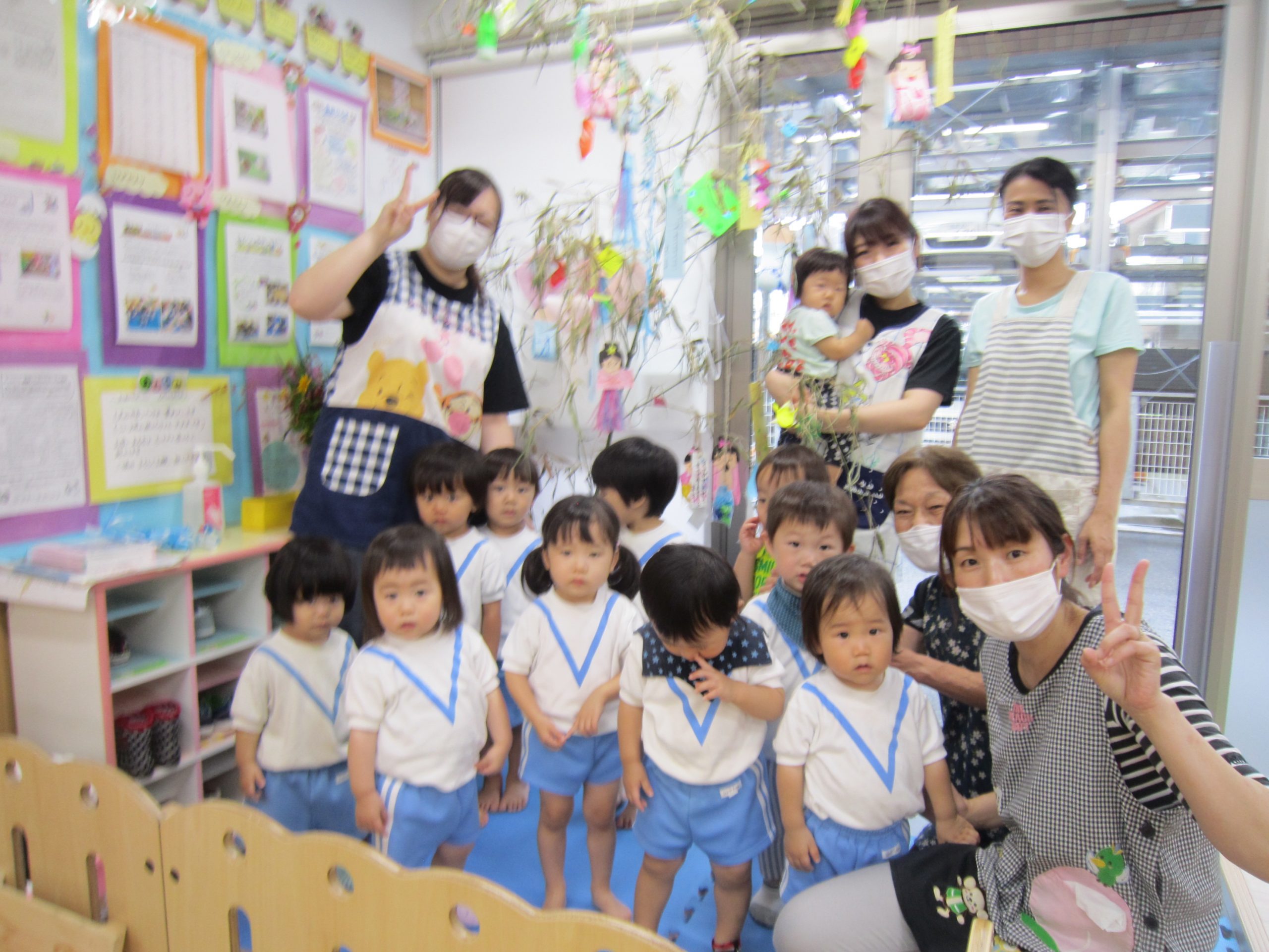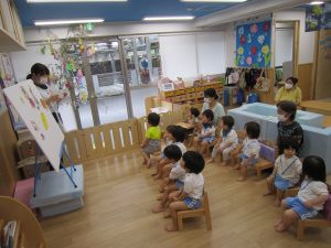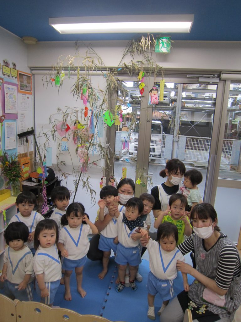 七夕の集い2020年7月7日(火) 今日は待ちに待った・・・7月7日七夕❕ 保育者や保護者の方と一緒に作った七夕飾りを毎日楽しみに登園してきた子ども達です。 パネルシアターを観ながら、七夕の由来を教えてもらいました。 最後にみんなで♪たなばたさま♪の歌を大合唱!! 楽しい七夕の集いも終わり最後にみんなで記念撮影(^^♪ 今日のお楽しみのプレゼントは・・七夕の笹持ち帰りです!(^^)! お家でも七夕を楽しんでくれると嬉しいな~☆彡 « 泡あそび・水あそび みんなでスタンプしたよ!! »