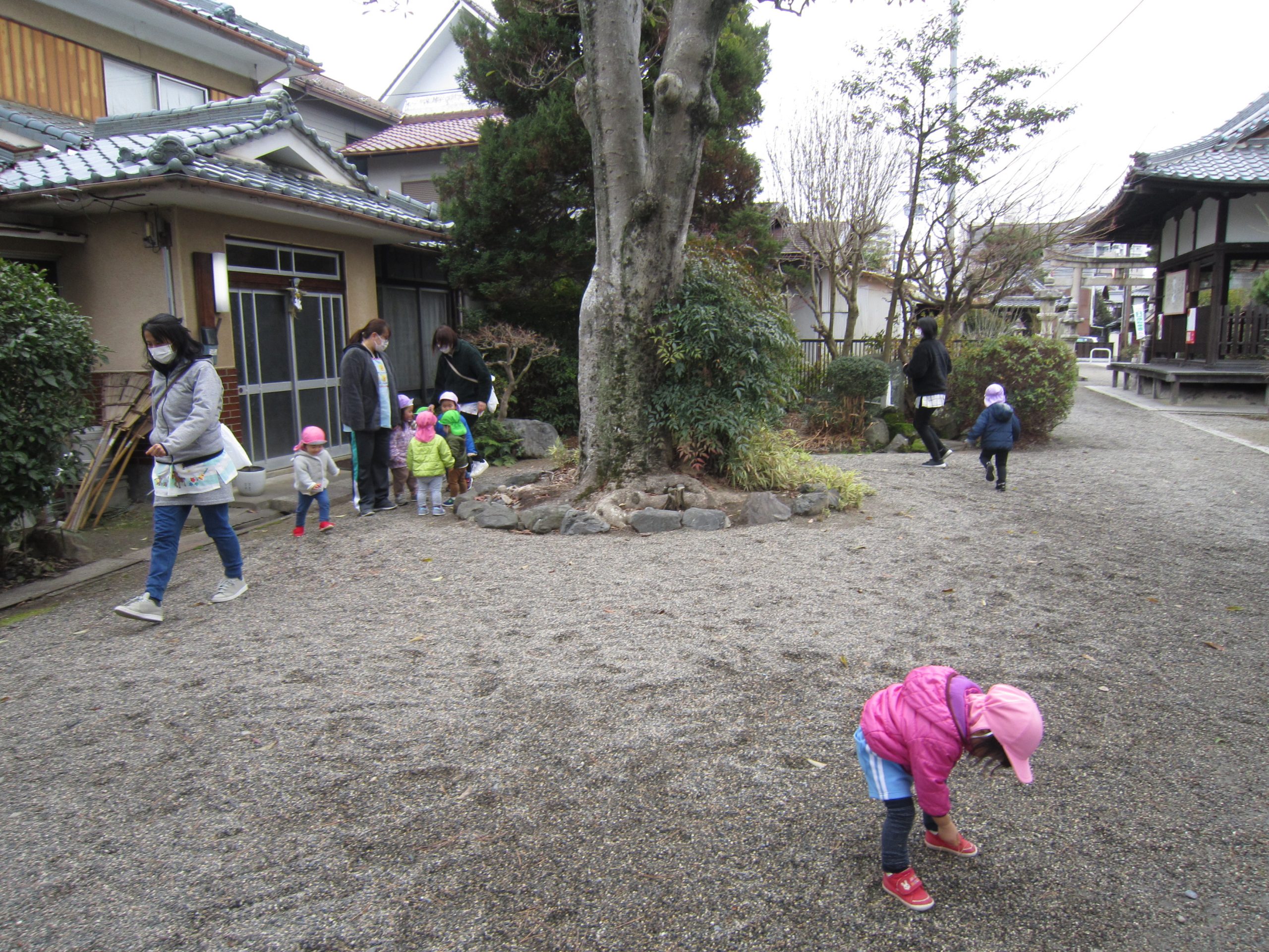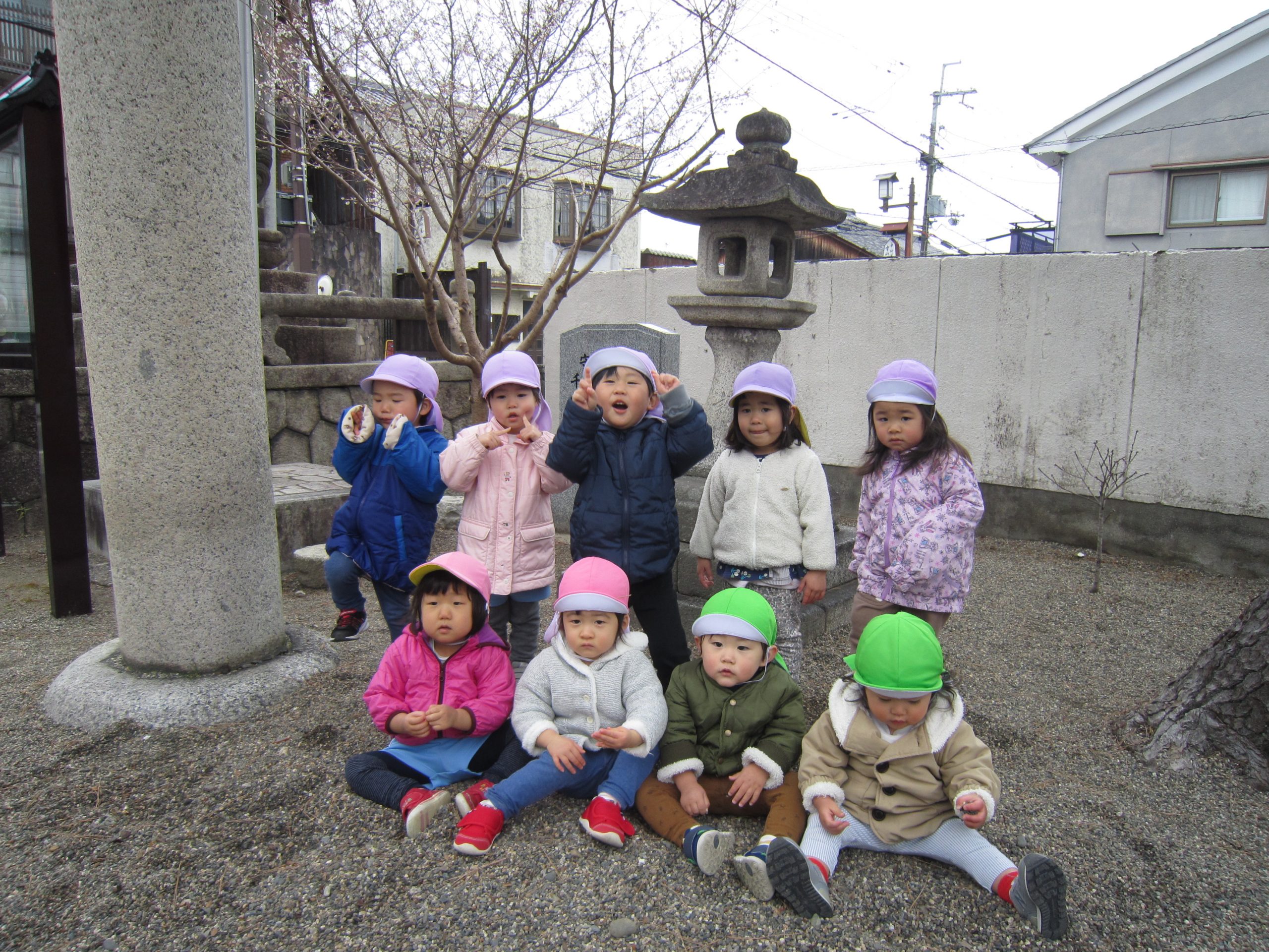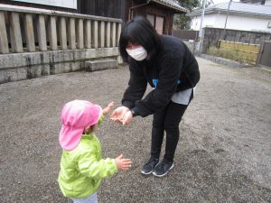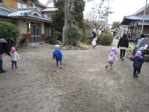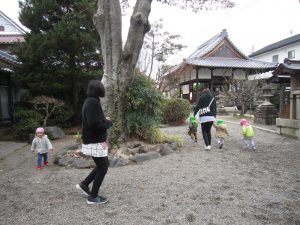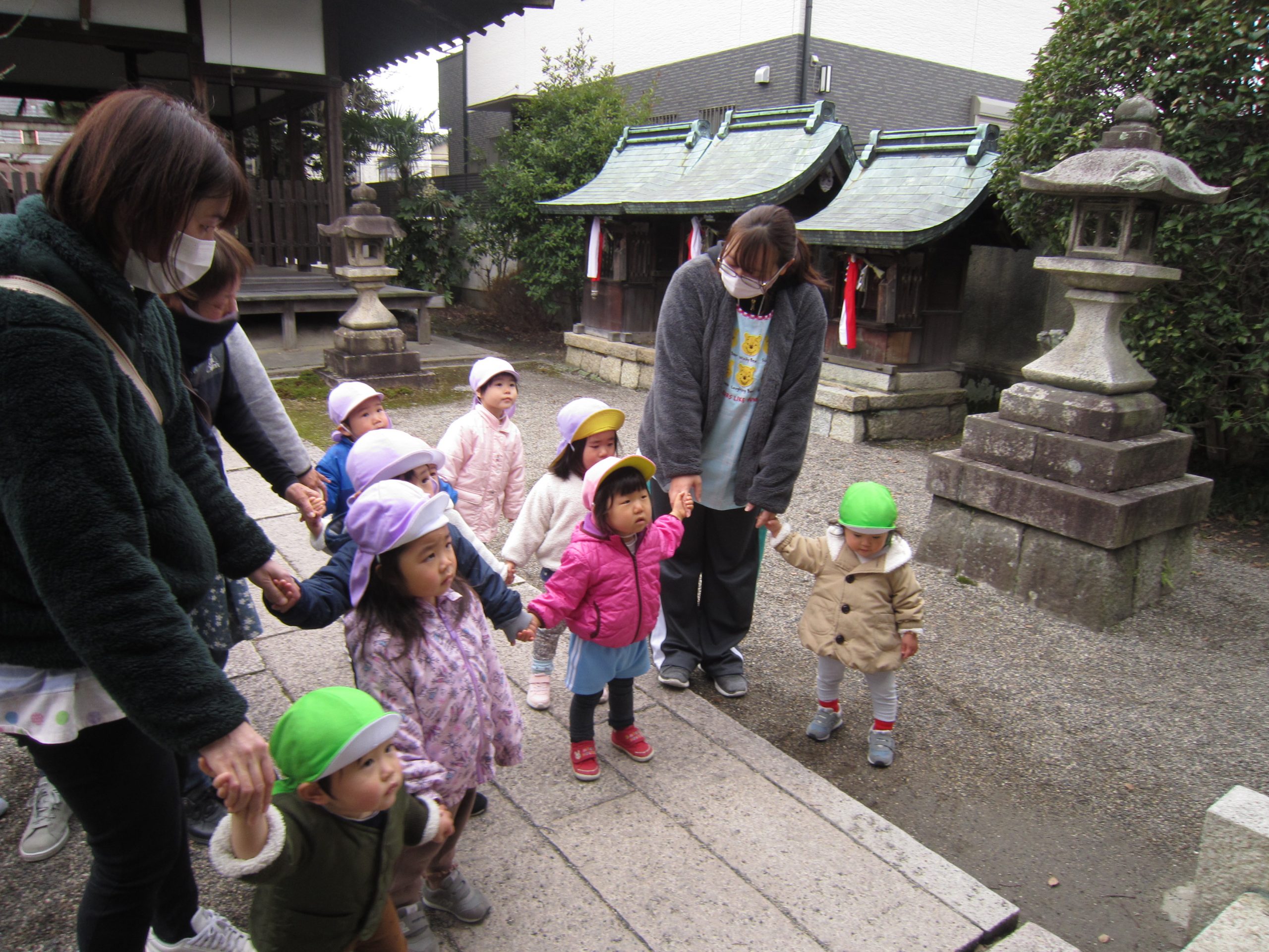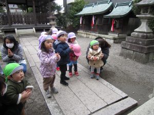 初詣2022年1月6日(木) 今日は、正月遊びの制作をした後、昨日行けなかった天満宮へ初詣に行きました❕ 今年一年健康にそして、子ども達と一緒に笑顔いっぱいんの一年になりますように・・・ みんなでお願いをしました。 お参りが終わると、記念写真を撮りました🎶 さぁ~遊ぼう~🎶 寒さに負けずに・・・ ヨーイドン❕ 戸外遊びが大好きな子ども達でした🎵 今年もたくさんお外で遊ぼうね🎵 « おもちつきごっご遊び 令和4年の始まり~ »