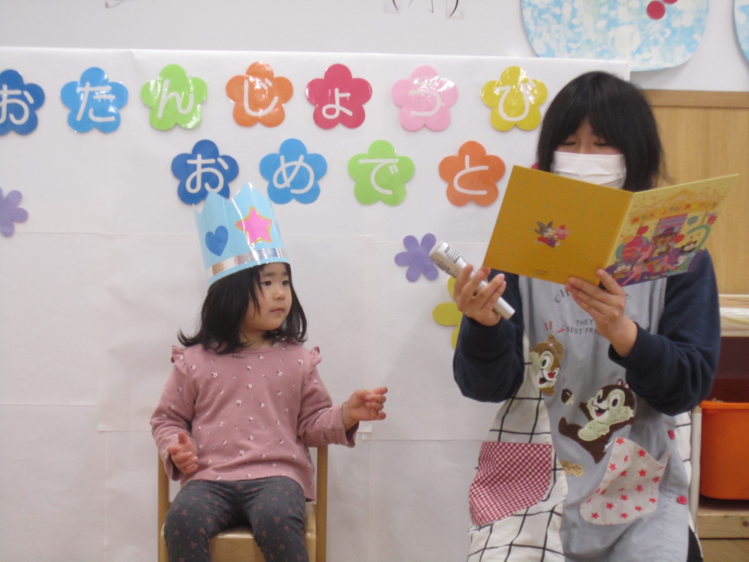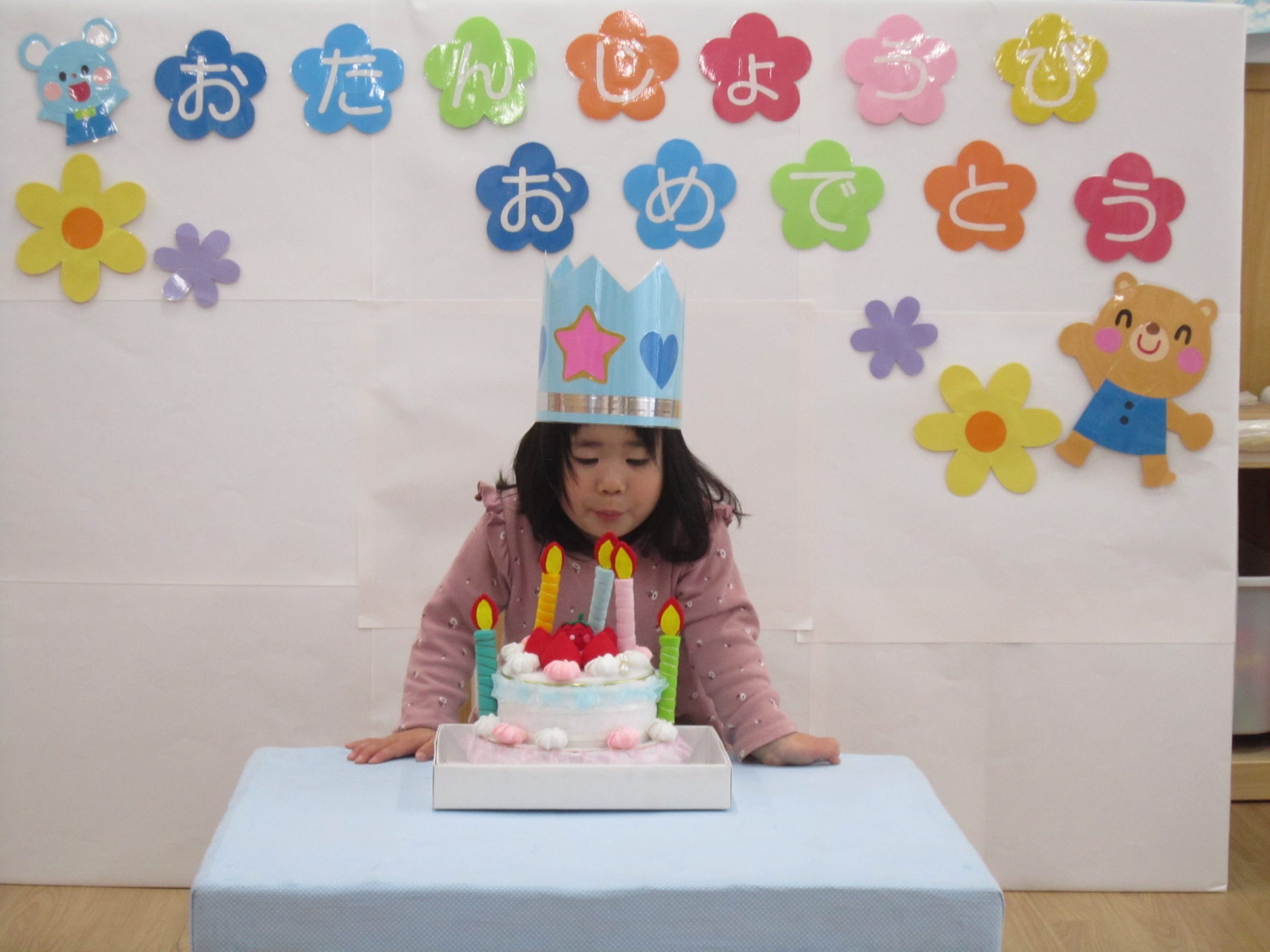 1月の誕生会2022年1月31日(月) 今日は1月の誕生会がありました🎵 誕生児は1人です。 みんなに見られて、少し緊張をしています。 保育者からの質問にしっかりと答えていました❕ メッセージカードを読んでもらうと、嬉しそうに聞いています🎵 友達からの“Happy birthday to you”の歌のプレゼントの後 ローソクの火を消すよ~ 保育者からの出し物は “犬のおまわりさん”のパネルシアターでした🎵 みんなで一緒に歌いながらみました🎶 お誕生日おめでとうございます🎵 素敵な1年になりますように・・・ « 節分 豆まきに向けて準備❕ »