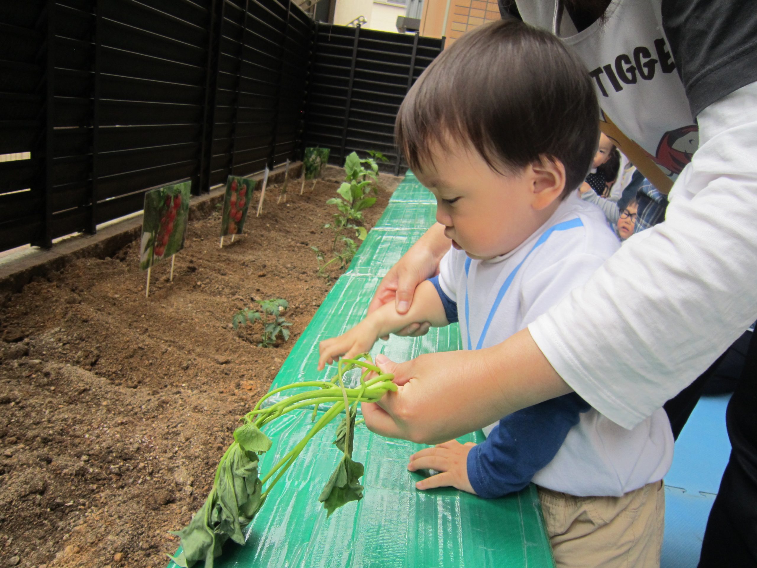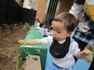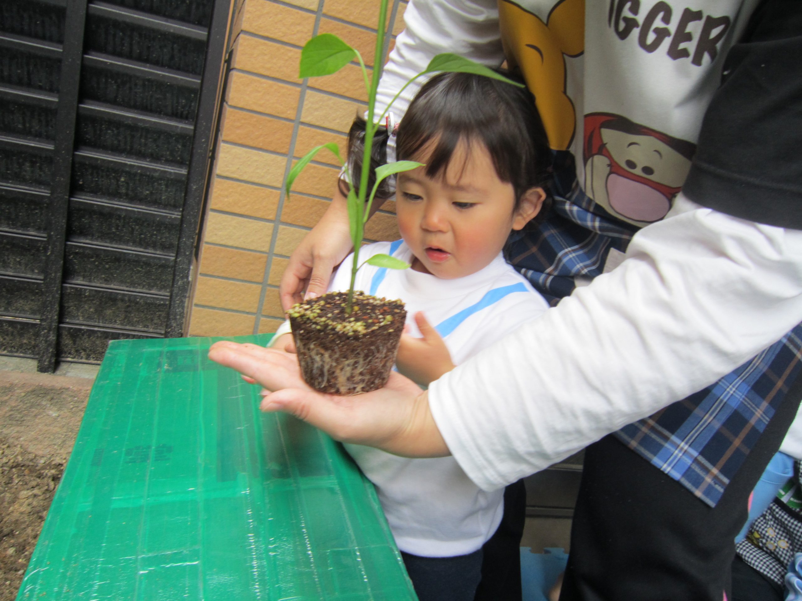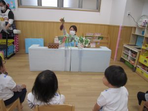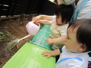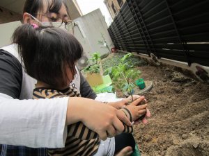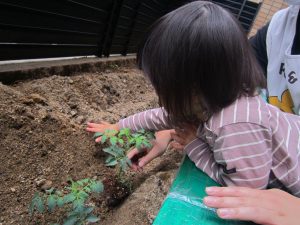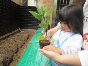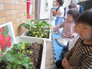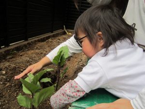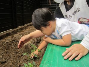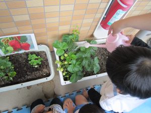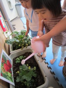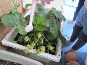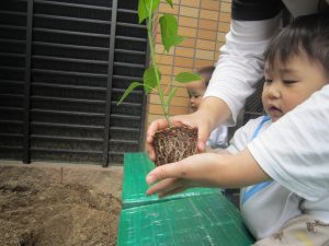 夏野菜の苗とさつま芋を植えたよ🎶2022年5月9日(月) 今日は、日課活動の後ミニトマト・ピーマン・ナス・さつま芋の苗を植えました🎵 まずは、ミニトマトを植えました🎵 次は、ナスを植えました🎵 その後、ピーマンを植えました🎵 最後にさつま芋を植えました🎵 “大きくな~れ”と願いながら水やりをしました🎶 これから毎日水やりをして、大切に育てていきたいと思います。 昨年度植えたイチゴも大きく育ちました❕ 早く赤くならないか楽しみにしている子ども達でした🎵 « 体操教室 日課活動 »