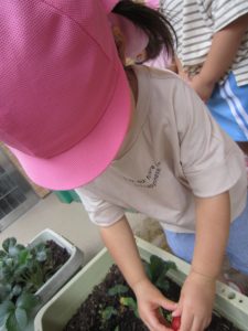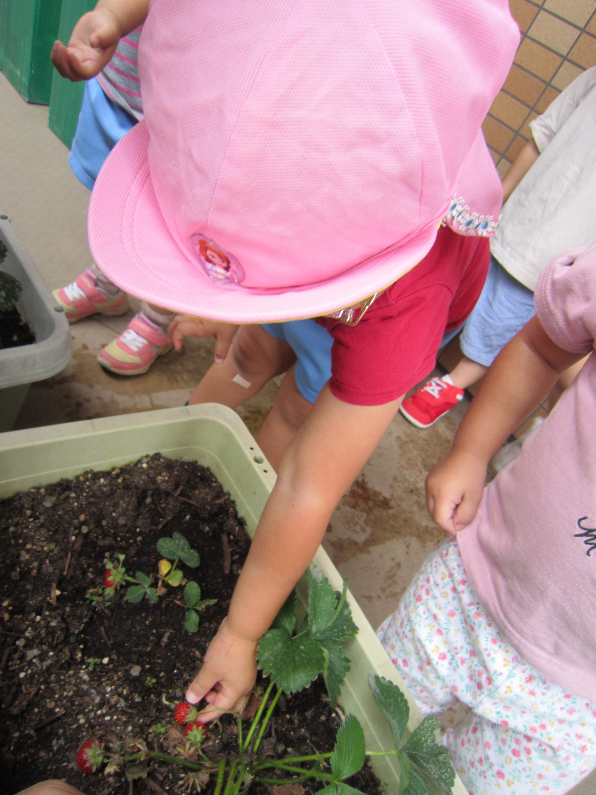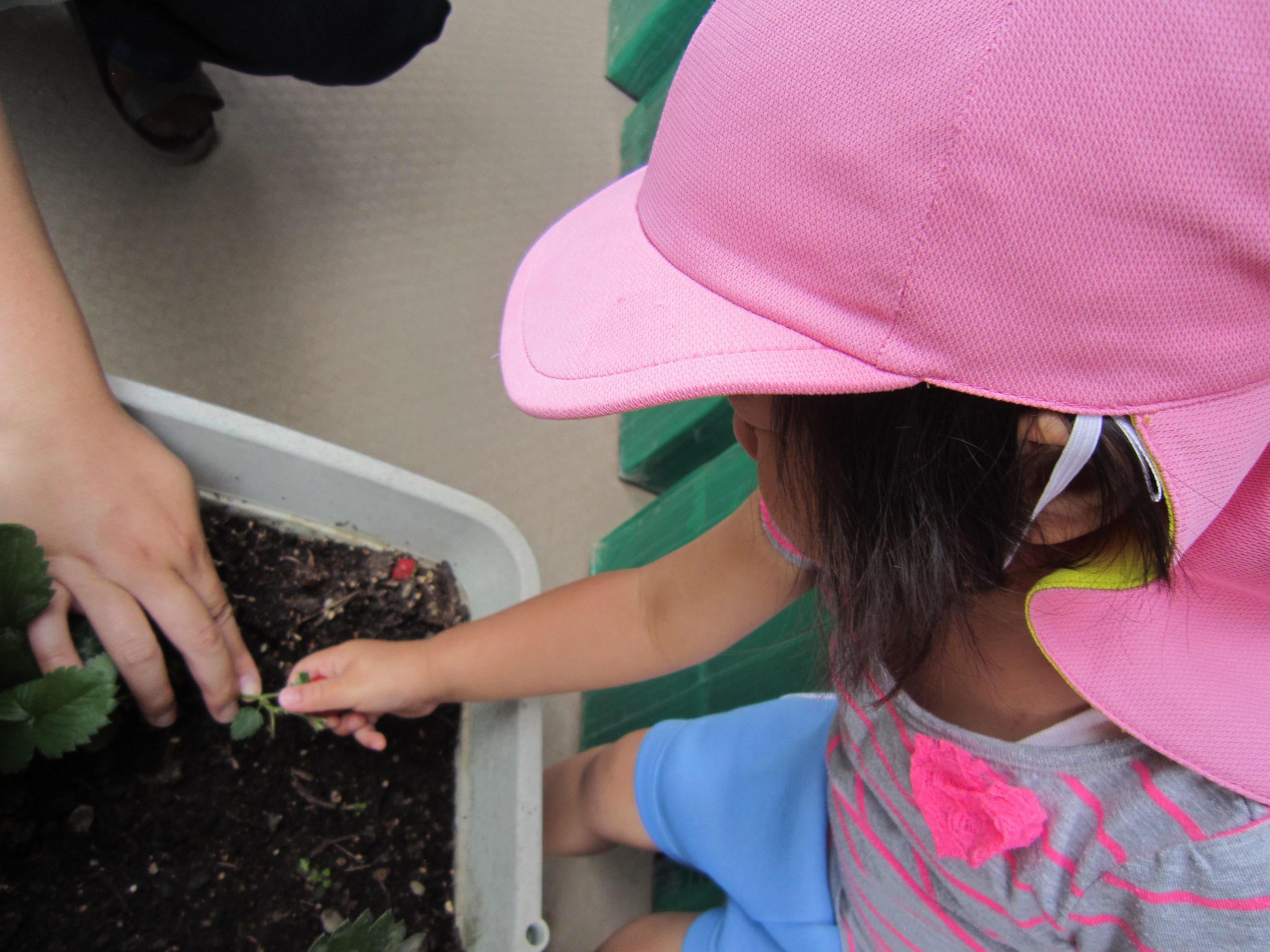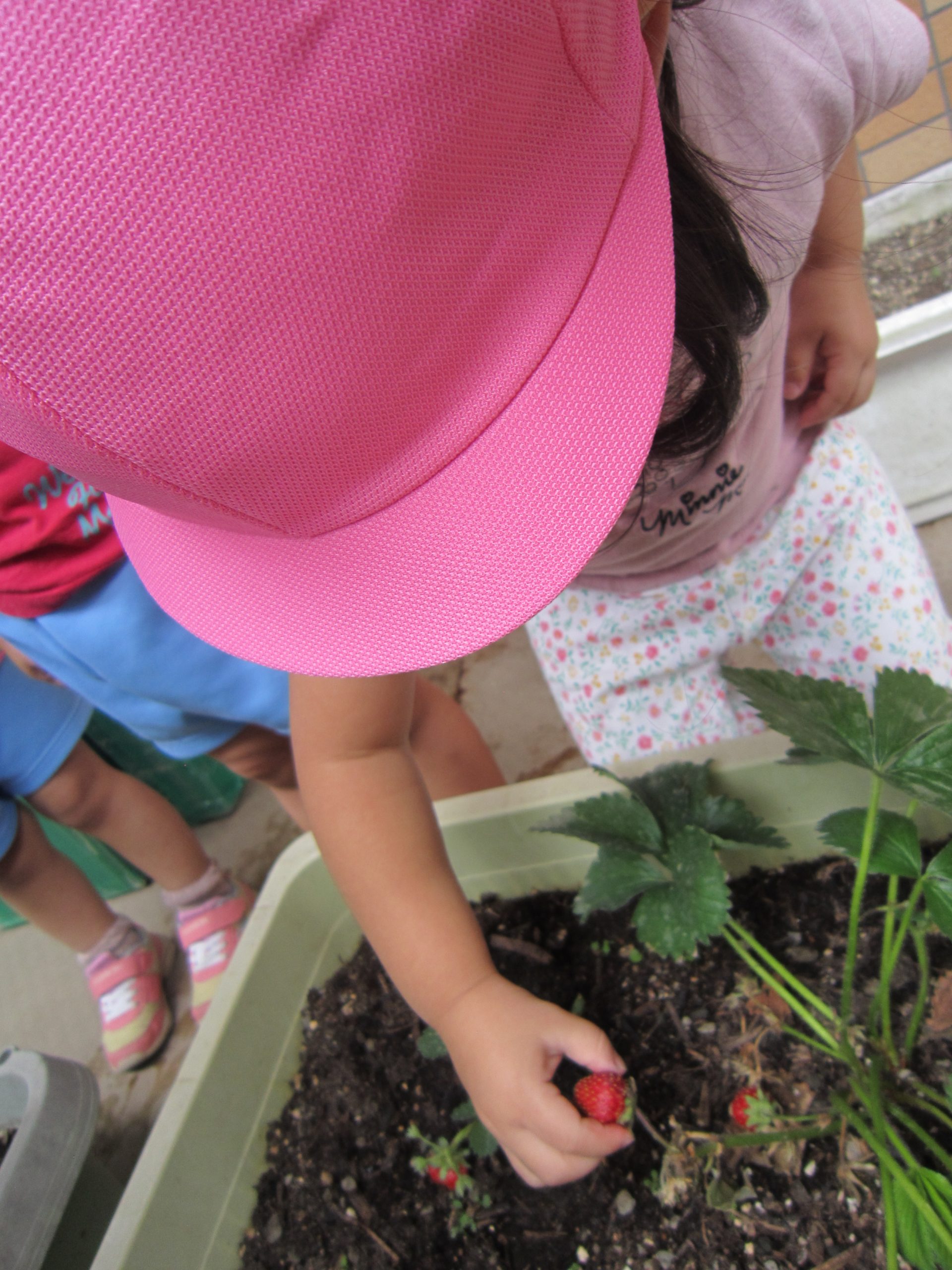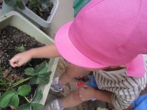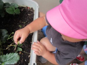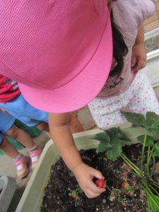 収穫したイチゴは、6月15日(水)の午後のおやつのヨーグルトのトッピングにイチゴジャムを給食の先生が作ってくれます。楽しみにしていてください。