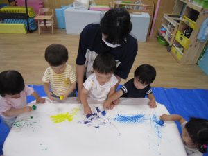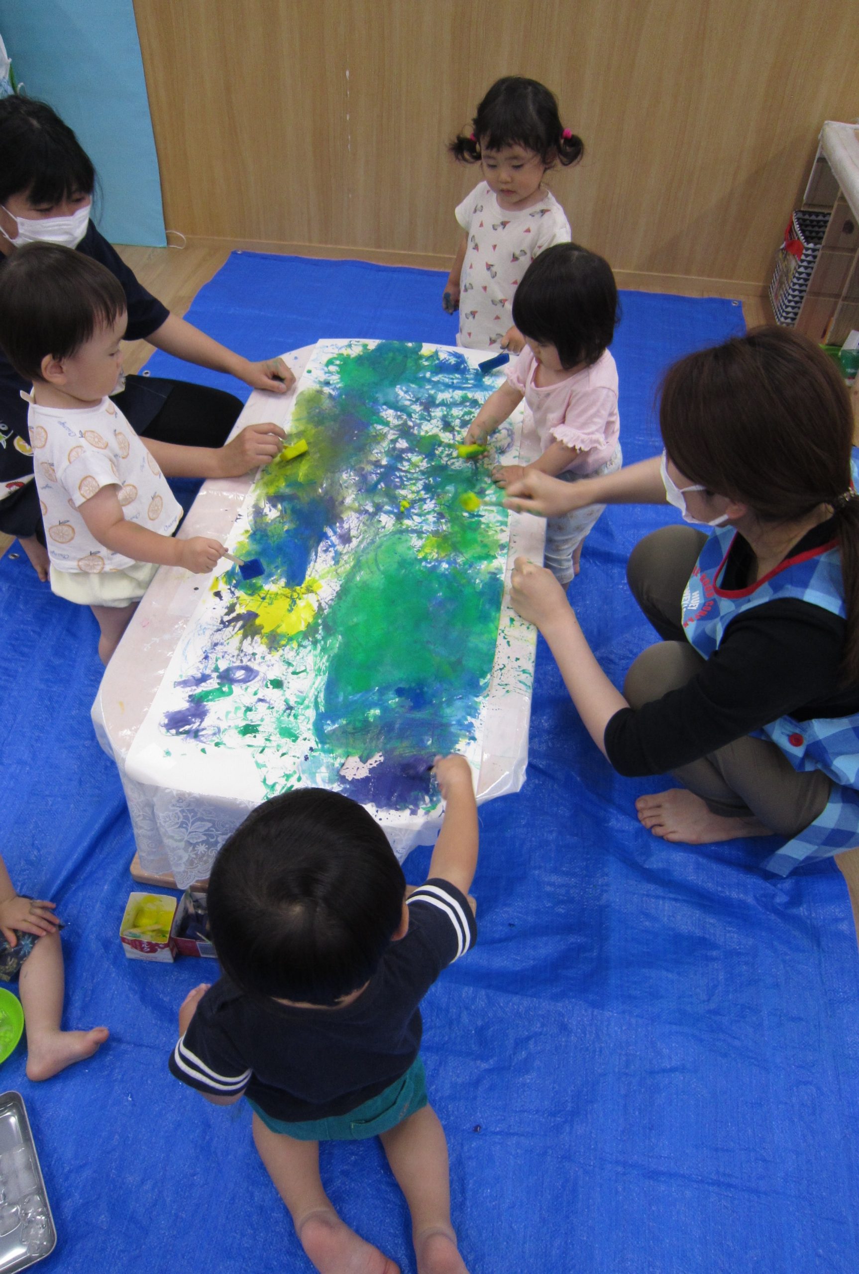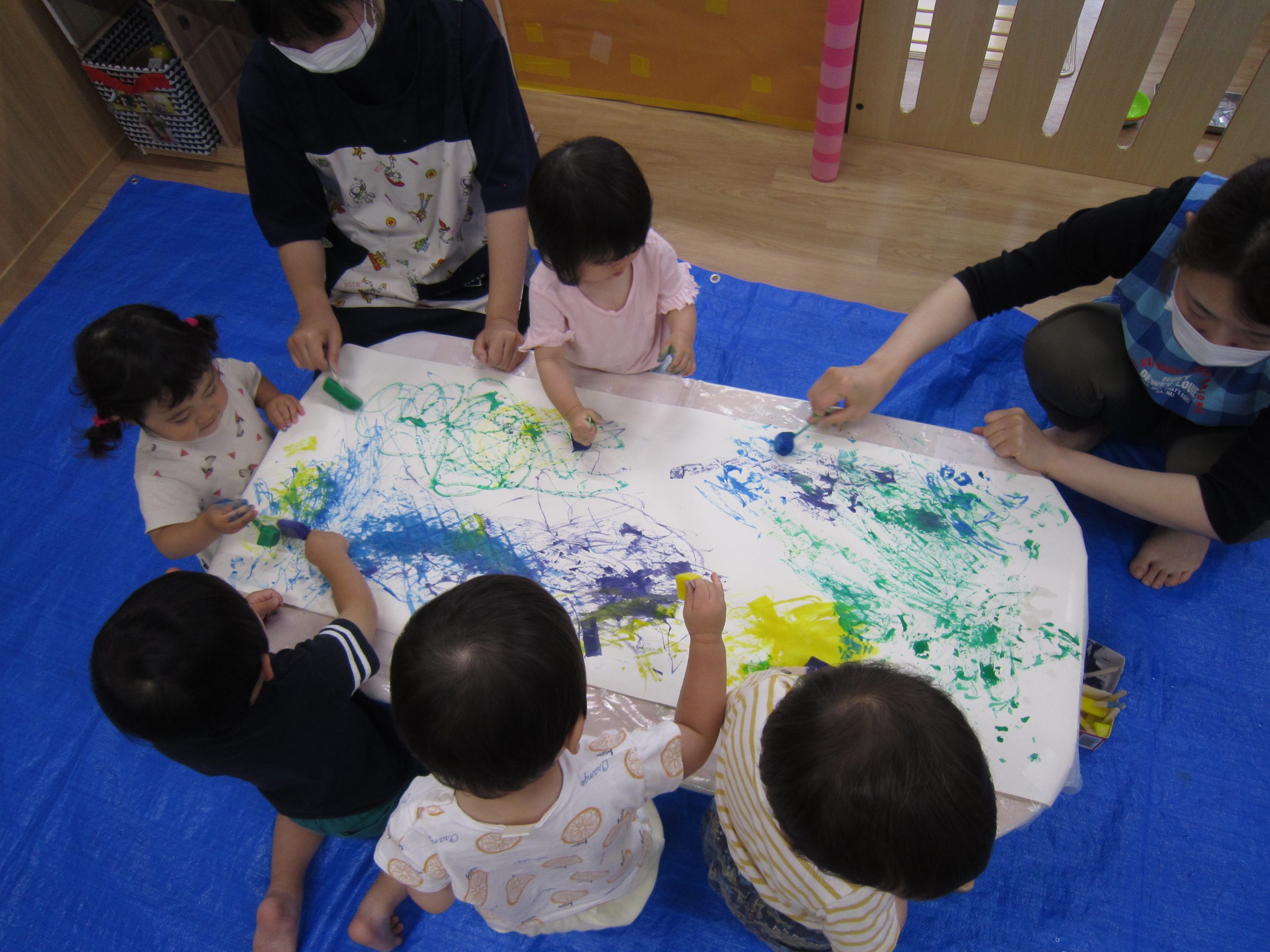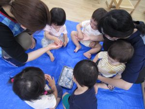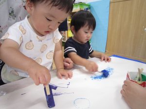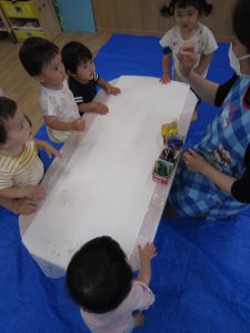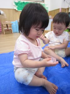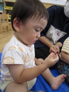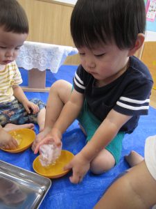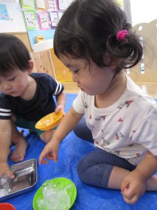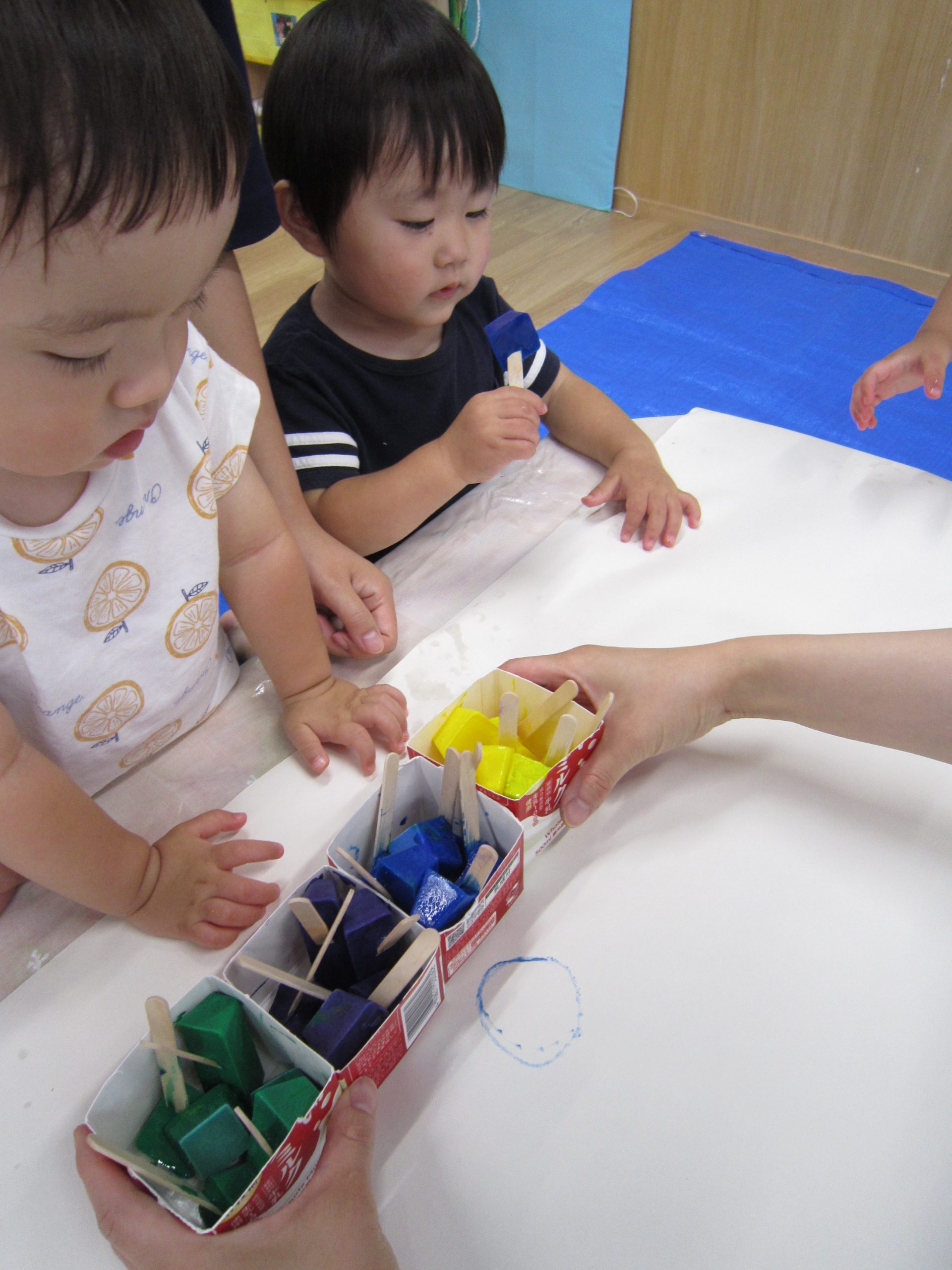 氷絵の具遊び ひよこ組・うさぎ組 2022年6月22日(水) 今日のひよこ組・うさぎ組は氷絵の具を使ってお絵描きを楽しみました♪ まずは、氷をみんなで触ってみました🎵 その後、氷絵の具を使ってお絵描きを楽しみました🎵 好きな色の氷絵の具を選んで お絵描きスタート❕ お絵描きが終わると氷絵の具を触って、氷の冷たさを感じていました🎶 冷たかったけど、気持ちよかったね🎵 « 6月のお誕生日会🎶 水遊び♪ »