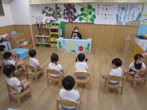 子ども達が楽しみにしている保育者からの出し物は、『へんしん おばけ』のカードシアターでした♫