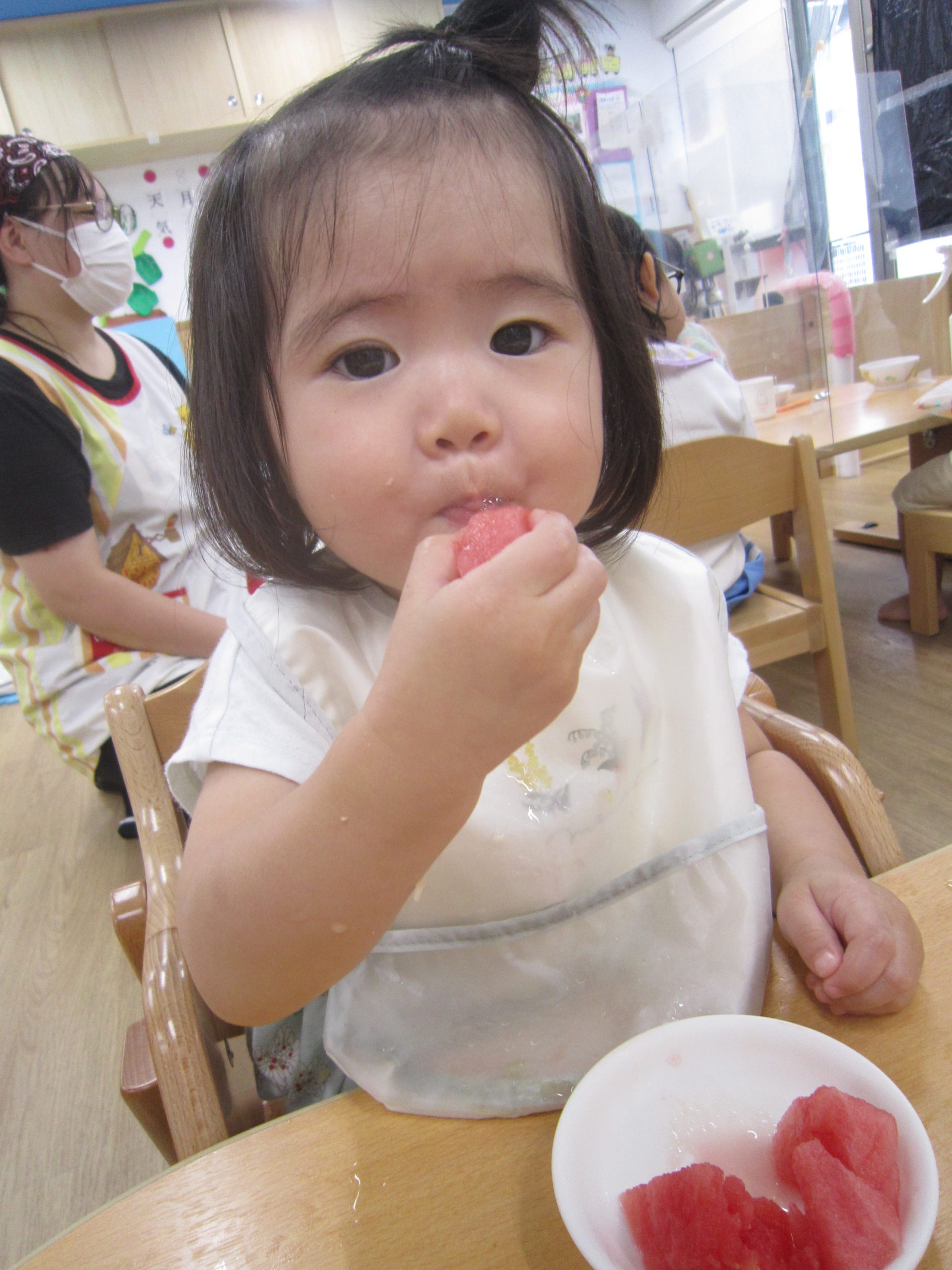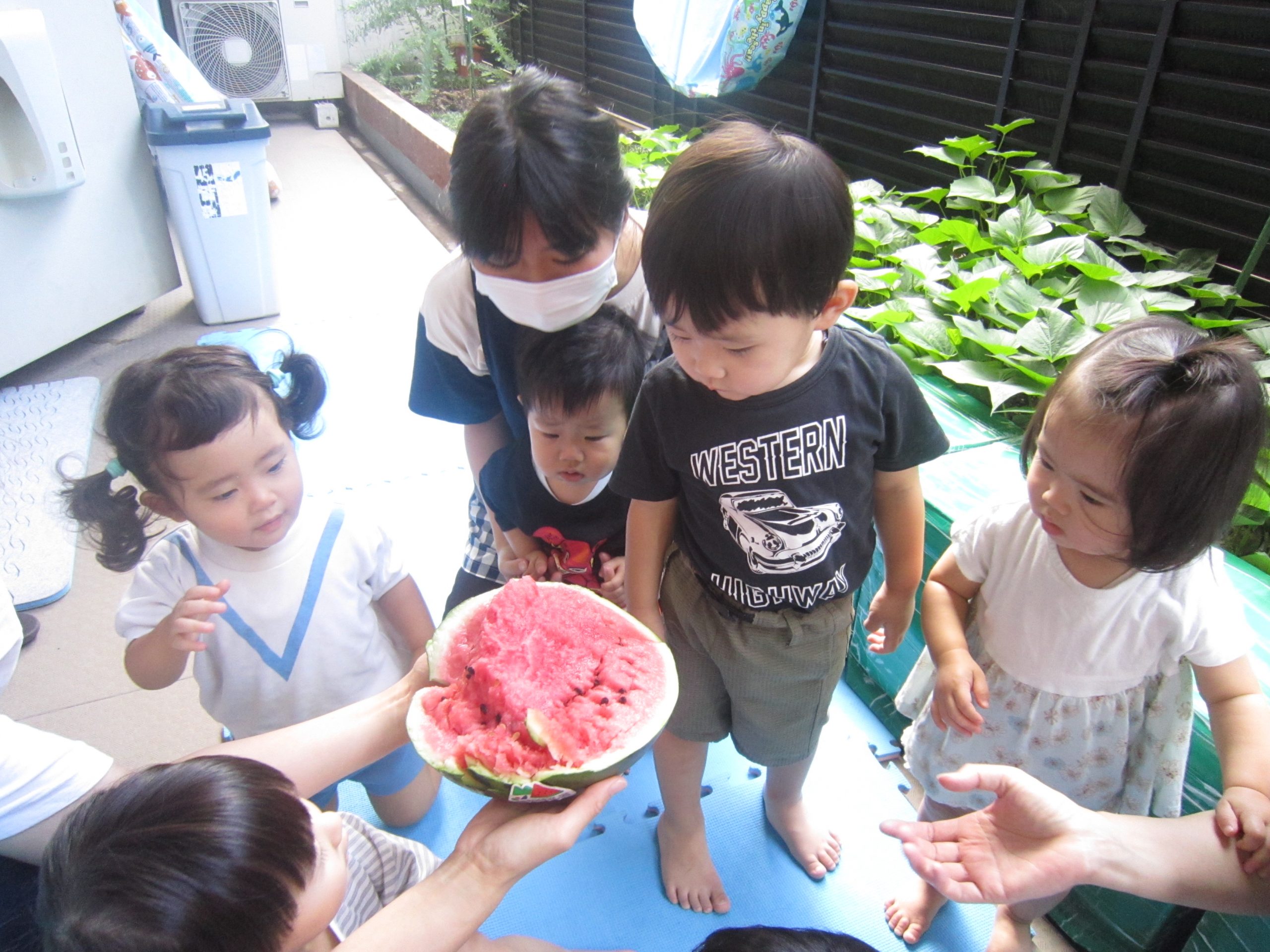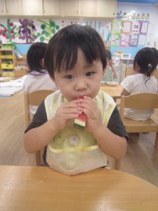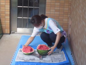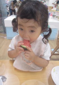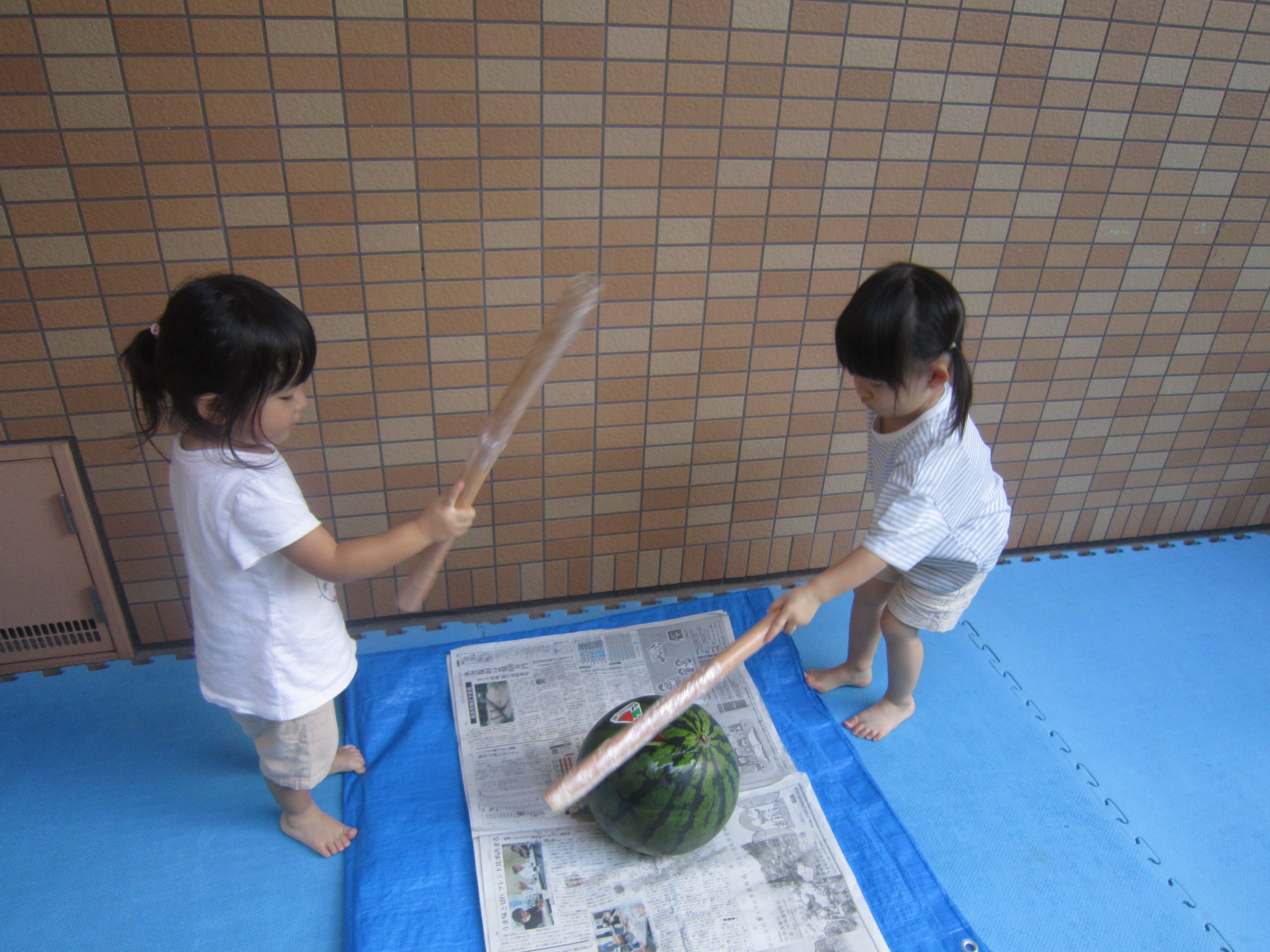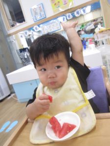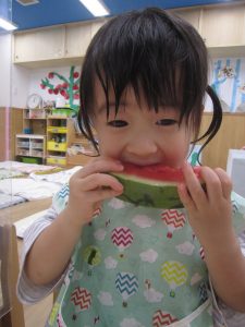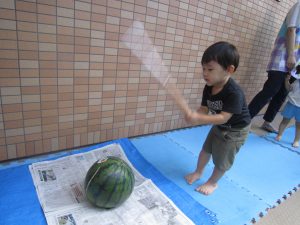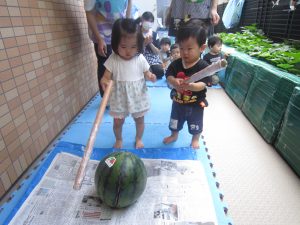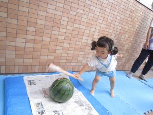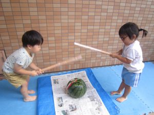 夏ならではの楽しみ♬2022年8月31日(水) 今日はみんなですいか割りを楽しみました♪ 大きなすいかを見て子ども達は大喜び❕ それでは、棒を持って準備完了❕ すいか割りの始まり♫ 見事すいかは半分に割れました🎶 すいか割りをしたすいかは、今日の給食の時に食べました♪ 美味しいすいかだったので子ども達は、おかわりをしていました🎶 中には「大きいすいかがいい」と言って、おかわりのすいかを自分で選んでいました♬ « 今年度最後のプール遊び🎵 小麦粉粘土遊び♬ »