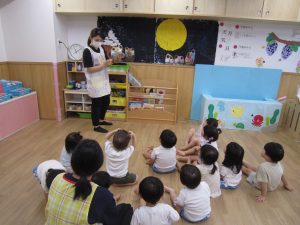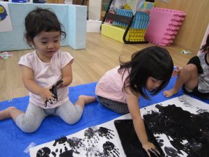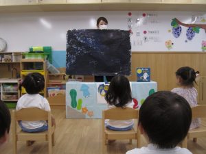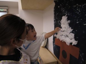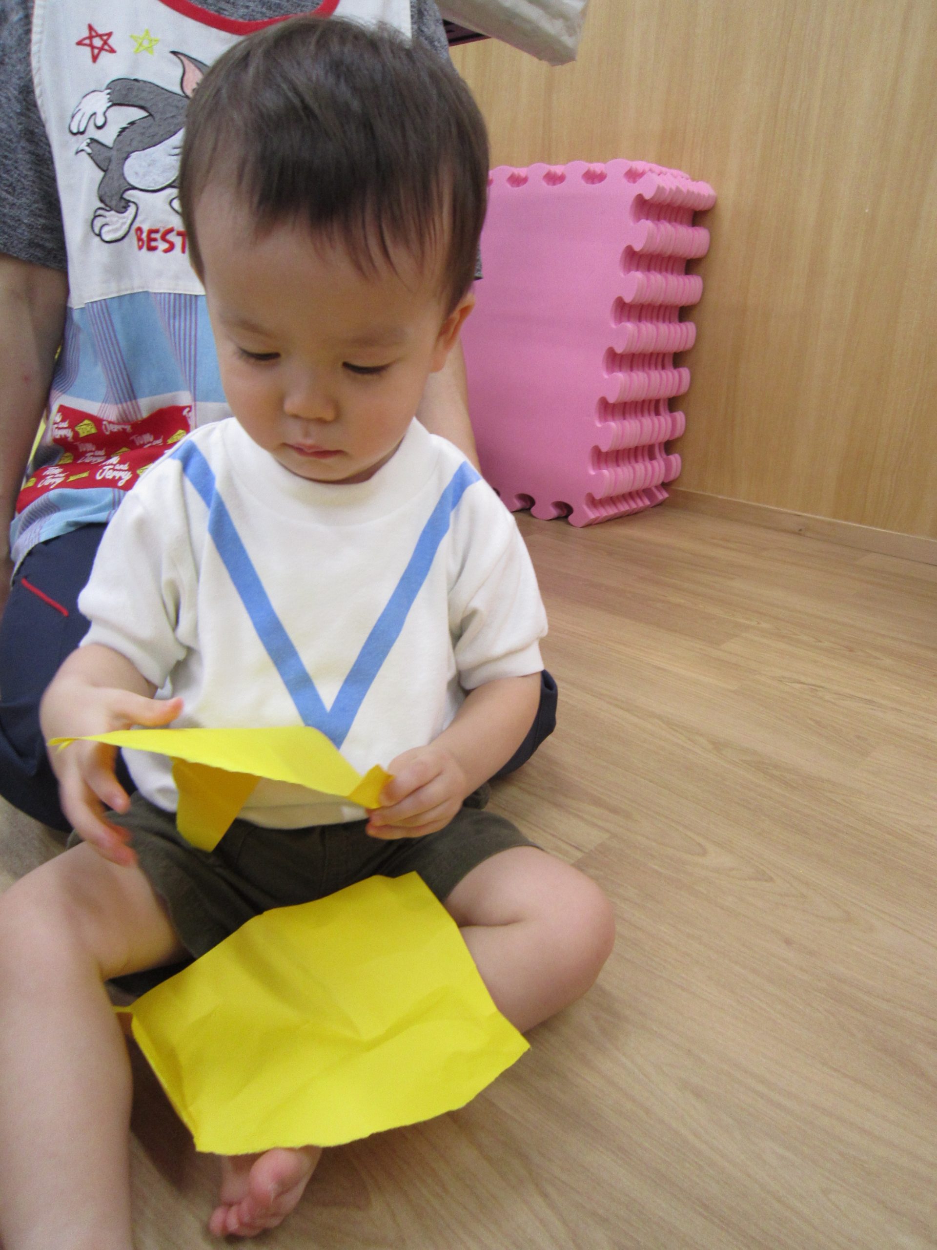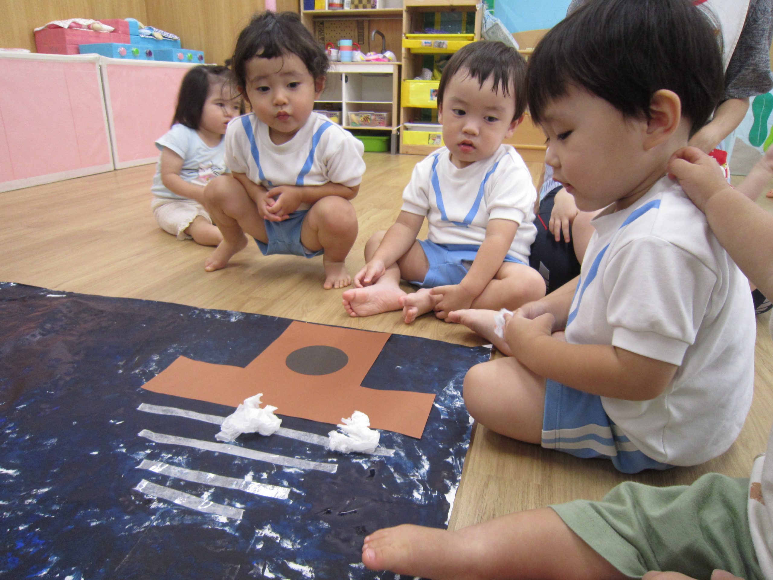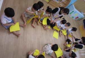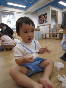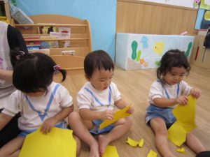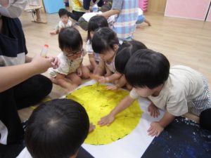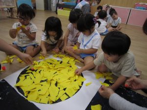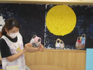 明日の十五夜に向けて2022年9月9日(金) 以前みんなで手形を押してバックを作りました♪ やっと乾きました🎵 今日は、乾いたバックを使って十五夜の準備の続きをしました🎶 さぁ~みんなでおつきさまを作るよ~♪ 画用紙をみんなで破って こぐま組は、破った画用紙を貼っていくよ~♬ ひよこ組・うさぎ組はお団子作り~🎵 お花紙を丸めて、ぺったん♪ 最後にみんなの写真を貼って🎵 完成🎶 明日のおつきみが楽しみだね🎵 « 家族の日 久しぶりの散歩~白鳳公園 こぐま組 »