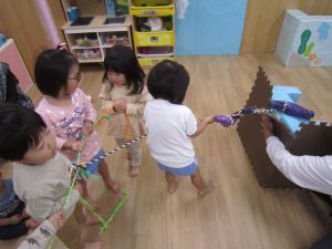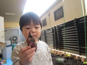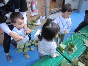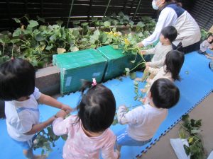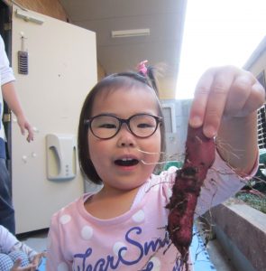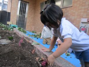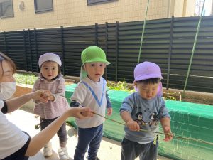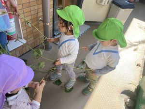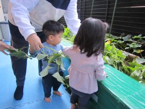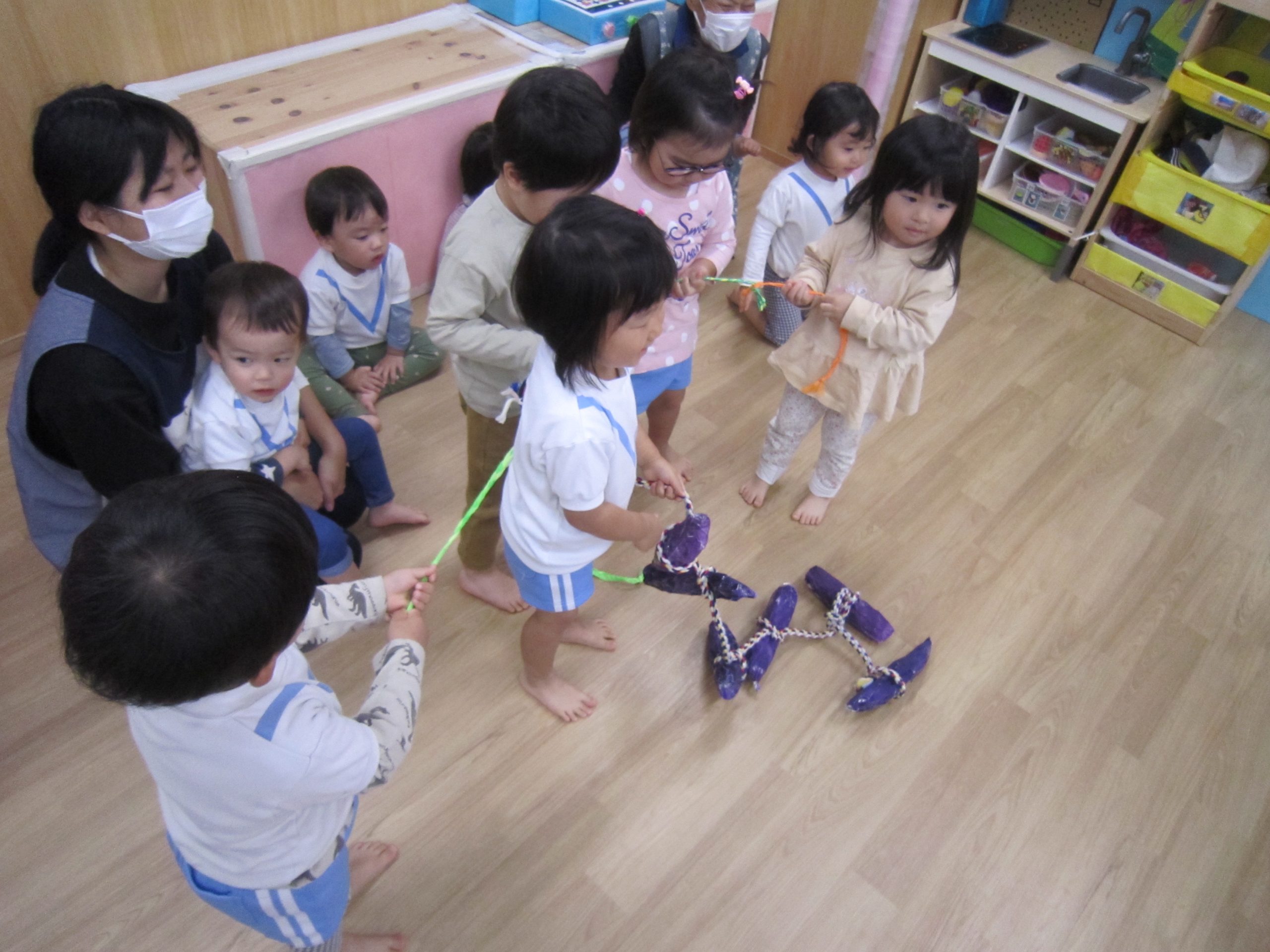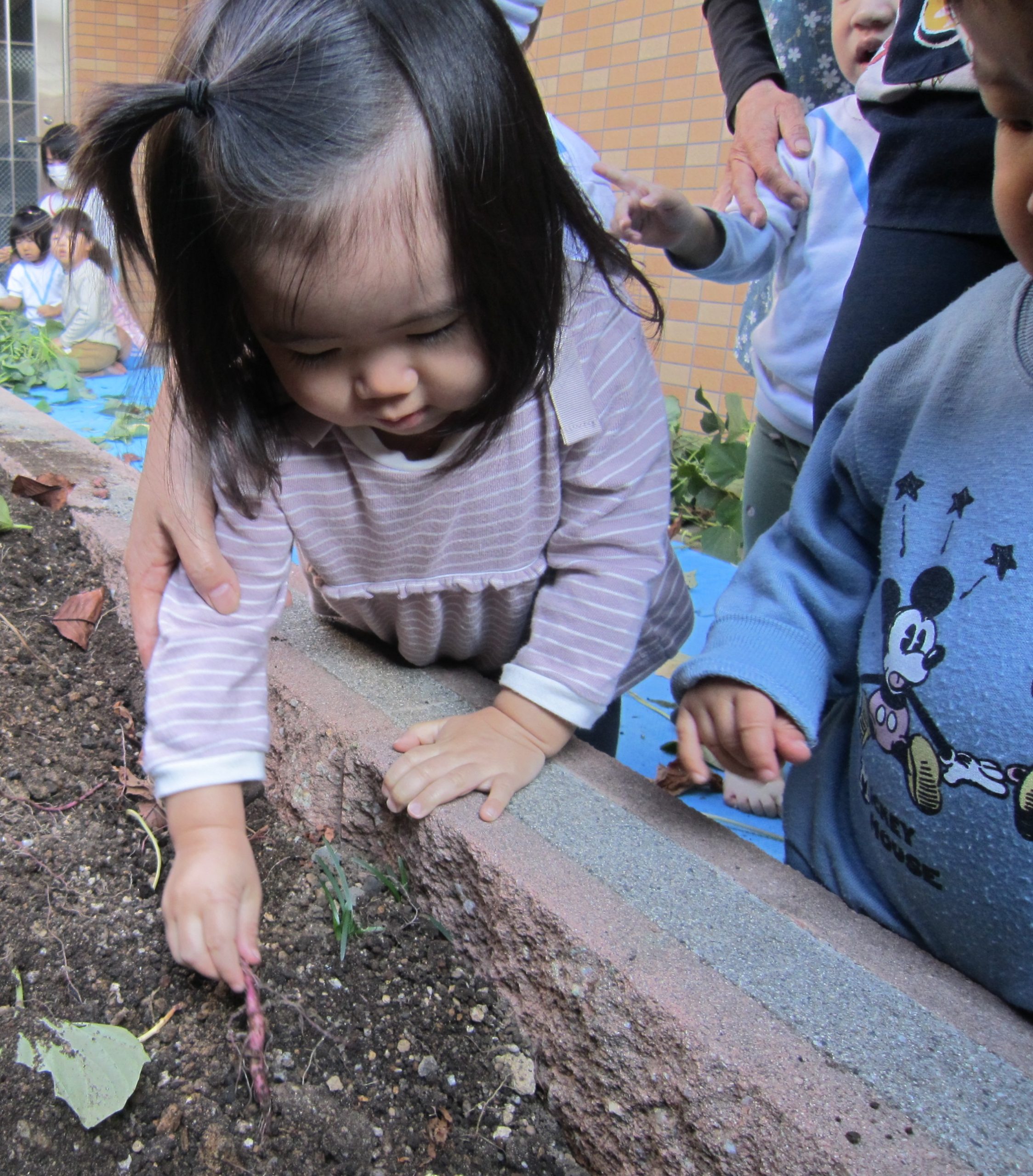 お芋ほり🎵2022年11月8日(火) 今日は子ども達が待ちに待ったお芋ほりです🎶 お芋ほりの前にまずは、お芋ほりの練習をしました♪ 「うんとこしょ、どっこいしょ・・・」 さぁ~これからが本当のお芋ほりの始まり❕ 「ひよこ組さん、準備はいいかな?」 「せーの」 「うんとこしょ、どっこいしょ」 次は、うさぎ組さん 最後にこぐま組さん それじゃ掘ってみよう♪ みんなが掘ってくれたお芋です❕ お芋ほりの後は、つるで遊びました🎵 本日掘ったお芋は持ち帰ります🎵 お楽しみに🎶 « 電車に乗って🎵 お神輿ワッショイ🎵 »