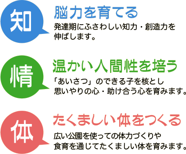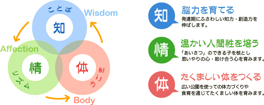 私たちは、明日を切り拓いていく子どもを育てるために、知・情・体、三位一体の総合幼児教育を実践します。詰め込み式の早期教育でもない、子ども任せの放任教育でもない。一人ひとりの素養をバランスよく育てる教育を実践します。