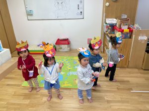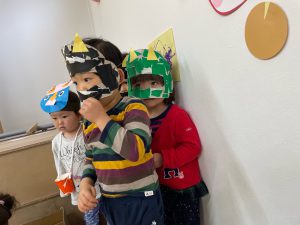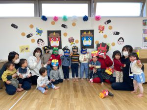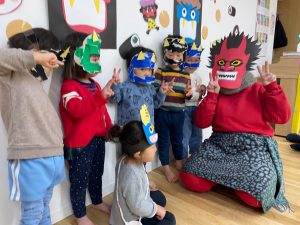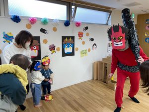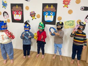 ナーサリーでは節分に向け、鬼👹のお面や豆まきの豆を作ったり、豆まきの練習をしたり…