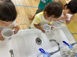 こぐま組はこの日から、食後のうがいを始めました。「バイキンさんバイバイ」と
