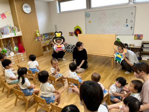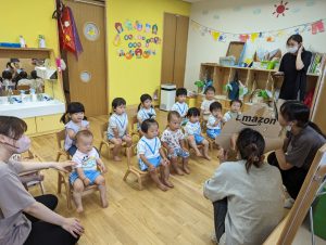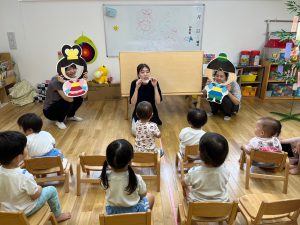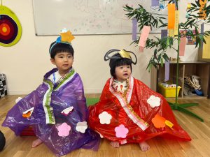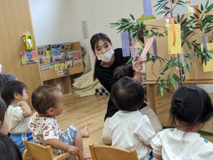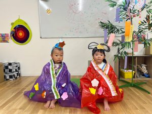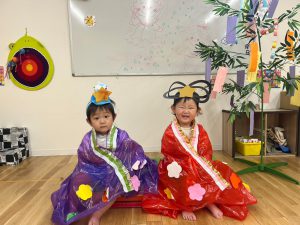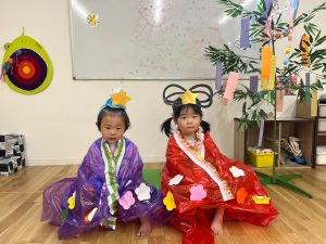 織姫と彦星のお話を先生たちの寸劇で見ました。少し難しかったけれど興味津々で