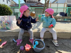 一緒の空間にいることを楽しんでいます。「ちょうだい」「どうぞ」と簡単なやり取りも