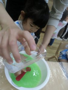 いっぱい混ぜてくれたので、スライムが出来上がりました。
