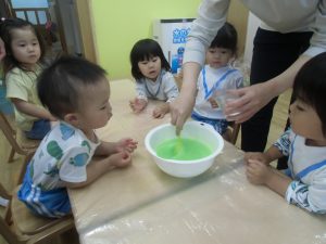 保育者から魔法の水を入れてもらい、こぐま組さんがスプーンで混ぜてくれます🥄