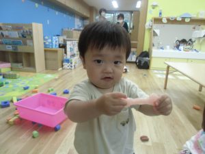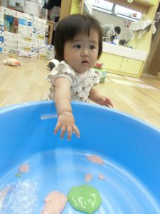 こぐま組さんも手で感触を楽しんだ後、スプーンを使ってカップに入れたり!