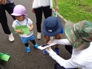 園内のどこかにいる先生を探して、シールとお金をもらいます。
